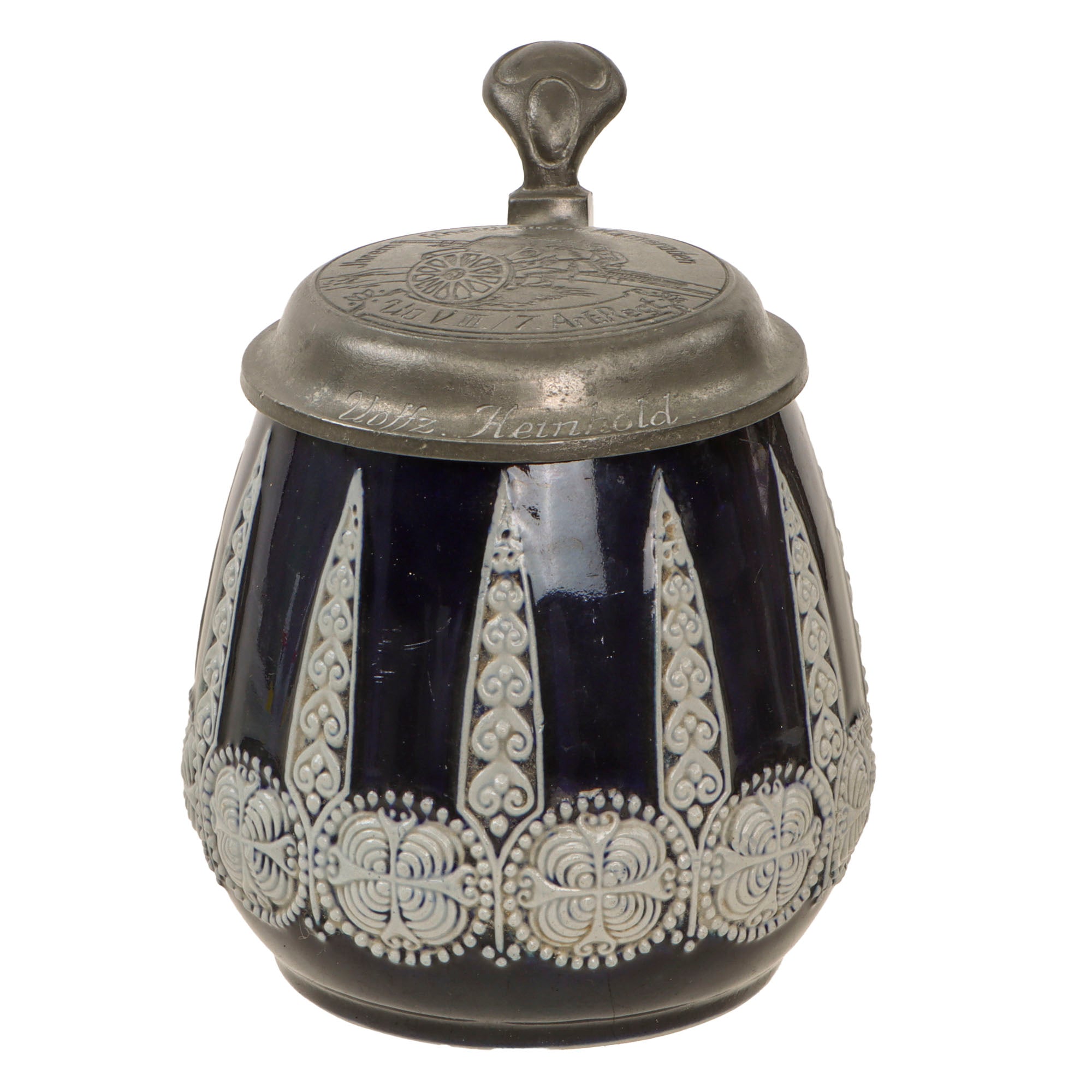 The majority of authentic German regimental beer steins were produced between about 1890 and 1914. During this time, military service was compulsory in Germany. Most men would take basic training between 17 and 20 and then enter the reserves until age 40. A group of men would enter a unit together, stay in the same unit for training and be discharged as a unit. This sense of togetherness fostered the custom of buying souvenirs with the unit name, insignias and decorations as a keepsake of military service. Many souvenir items were available such as pipes, clocks, flasks and especially steins. Rosters of names from your unit, or regiment, could be added to the steins and these became known to collectors as "regimental steins."