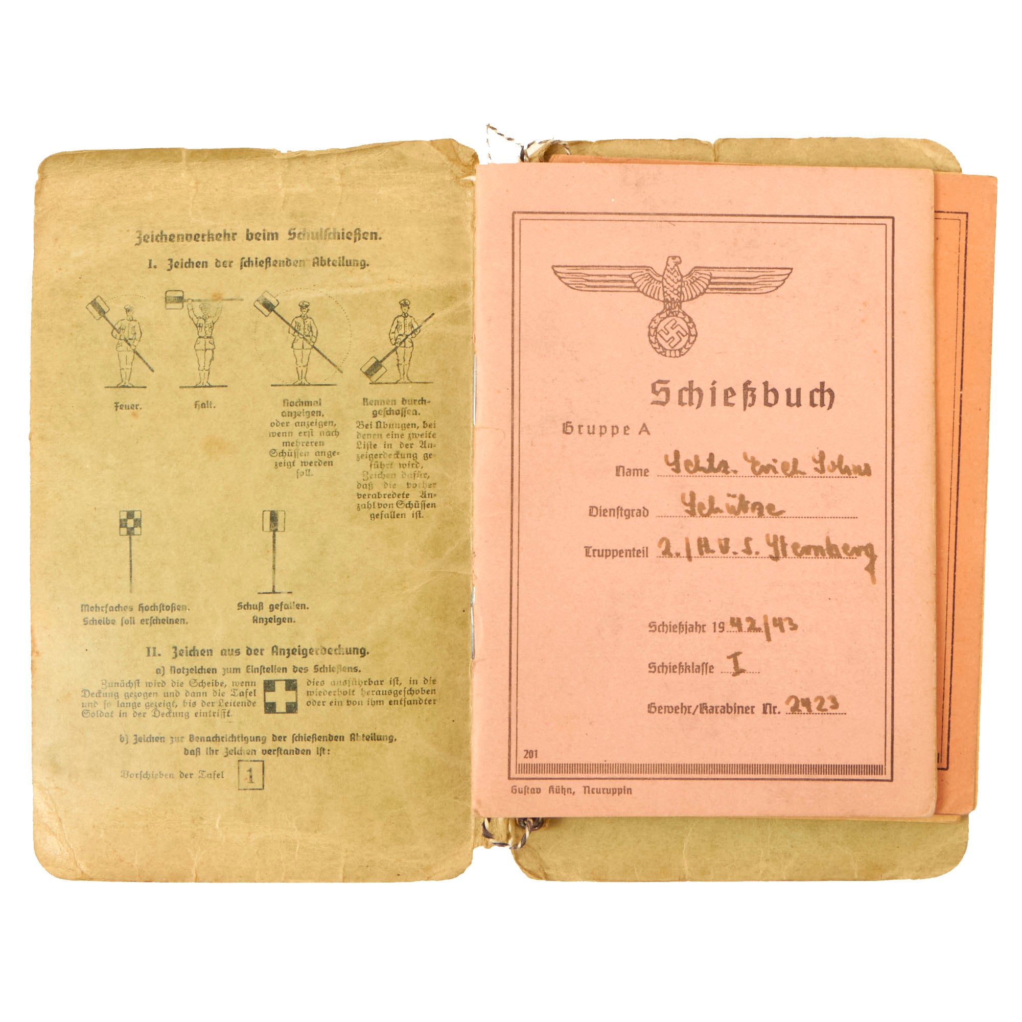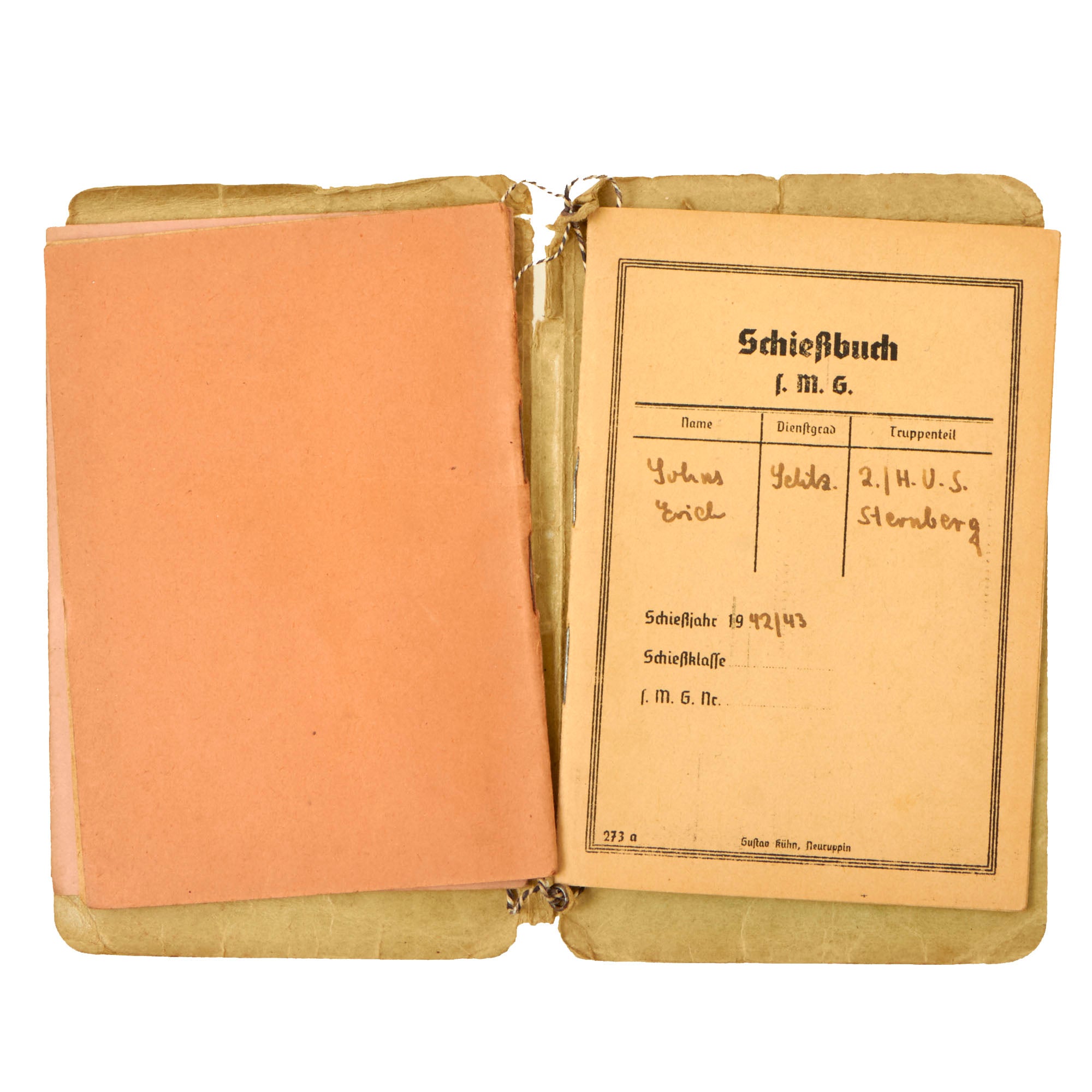 Original Item. Only One Available. This is a group of shooting proficiency books all named to Erich Sohns of 2. / H.U.S. Sternberg, a unit we have not been able to identify, but most likely is a training unit. His rank is listed as Schütze (Rifleman), the lowest infantry rank, equivalent to a prvate. The books are dated 1942/43, with three books in total all connected in a larger cover which is in rougher shape. The last of the three books are for Light Machine Gun Proficiency.