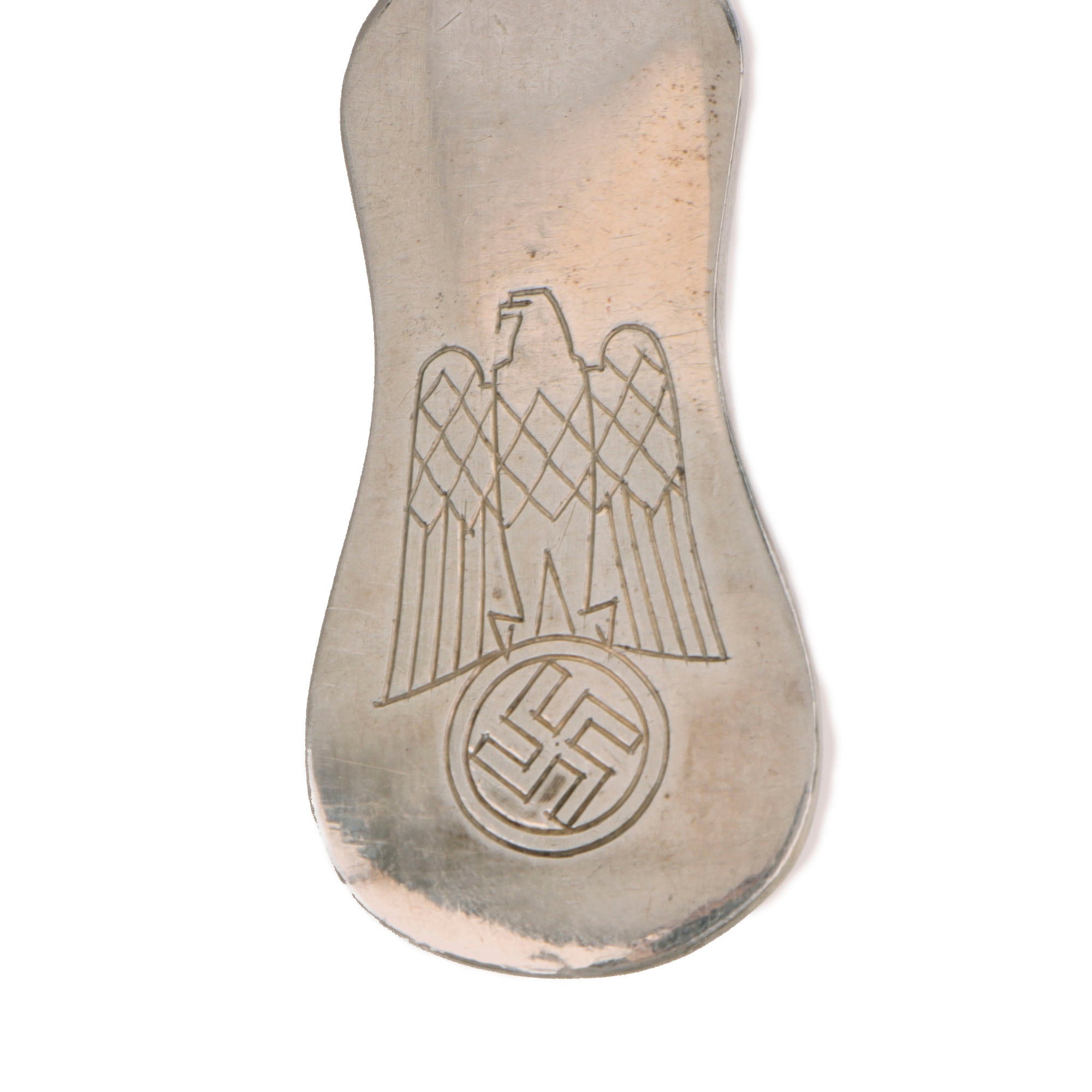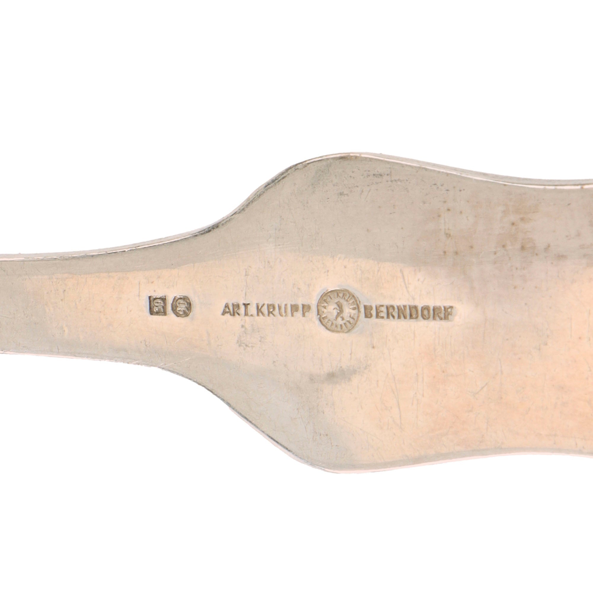 This is a very nice Schloss Klessheim formal pattern fish fork, which is also known as the "Bormann" pattern, as the same silverware was used at NSDAP secretary Martin Bormann's house in Obersalzberg. These all feature a distinctive closed wing art deco style Reichsadler eagle with the bottom of the wings and feet forming a bent line over the mobile swas. It has the distinctive long central slot between the tines, used for removing fish bones. The reverse of the handle is marked with ART. KRUPP BERNDORF surrounding the tiny round "Bear" logo of the company, which has the same abbreviation around it, though you will need a 16x magnifier to read it. Next to this is a 30 in an oval and a 90 in a rectangle, which are markings related to the silver plating of the fork. The "90" most likely indicates the weight in grams used for silvering 12 forks and 12 spoons. We do not know what the other marking means.