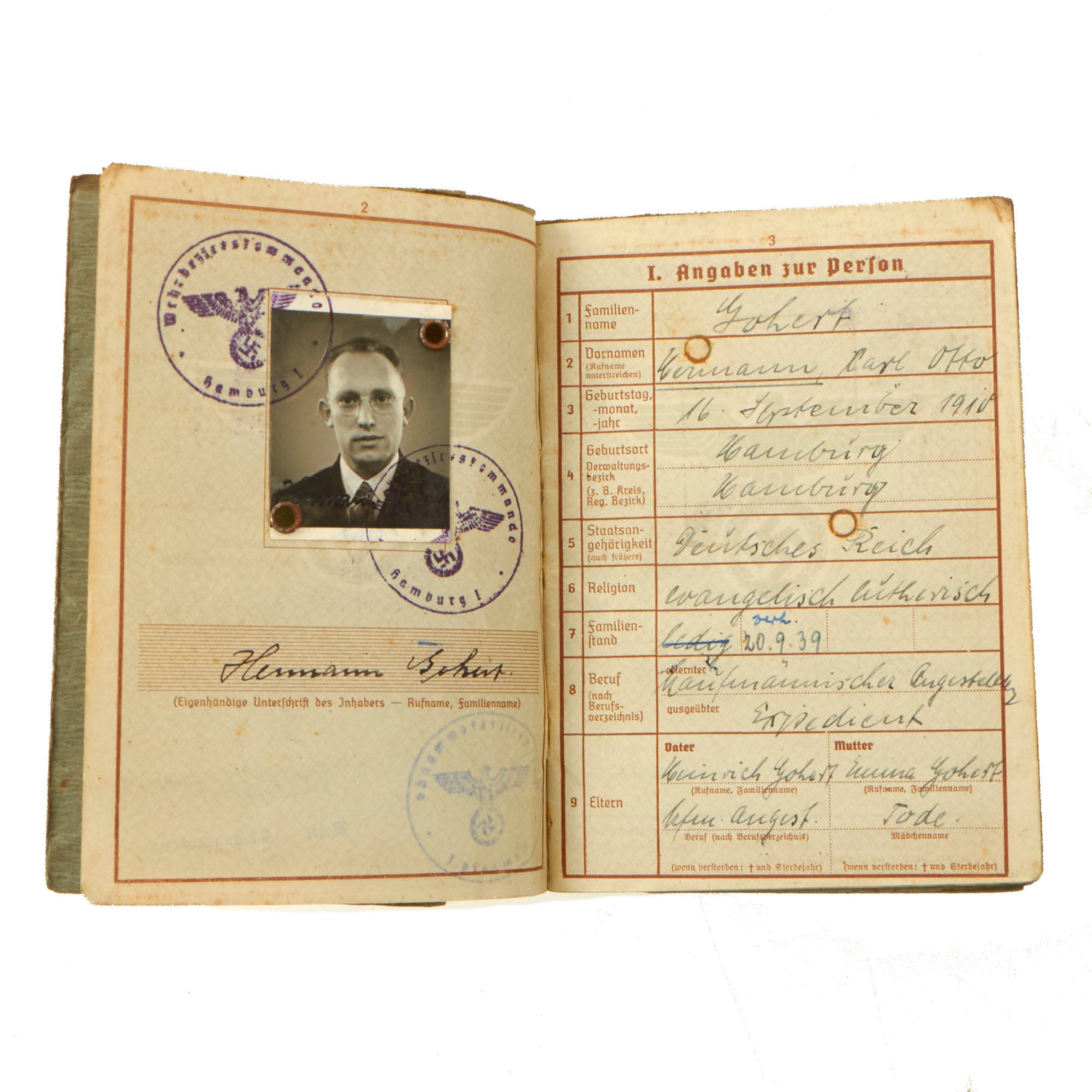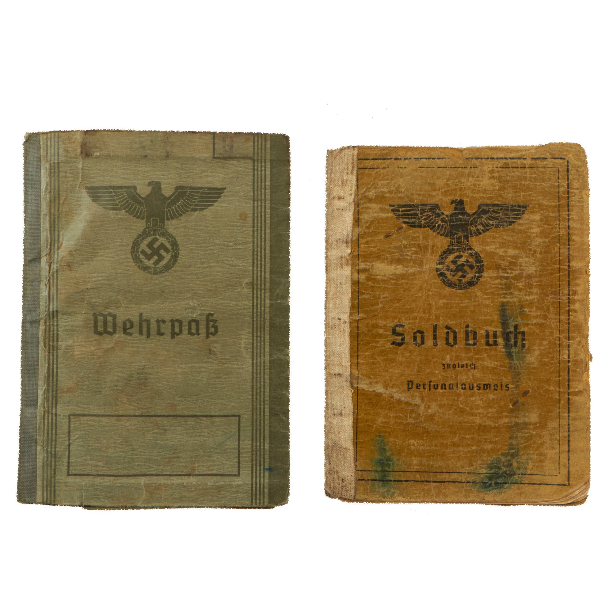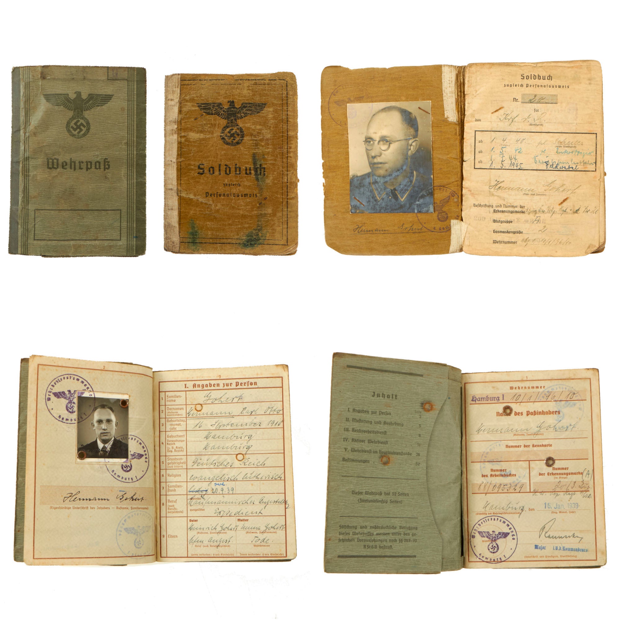 Original Items: One-of-a-kind Set. This is a fantastic genuine German WWII Military Identification set, consisting of a Wehrpaß identification booklet and a Heer Army Soldbuch identification and paybook, both named to Feldwebel Hermann Gohert of Transport Regiment 602. They contain much information regarding Trilling and his service, including promotions, the units he was in, injuries suffered, and awards received.