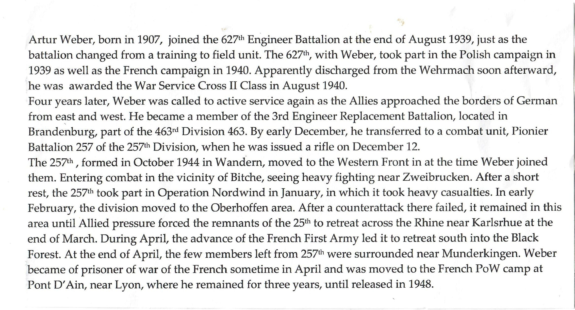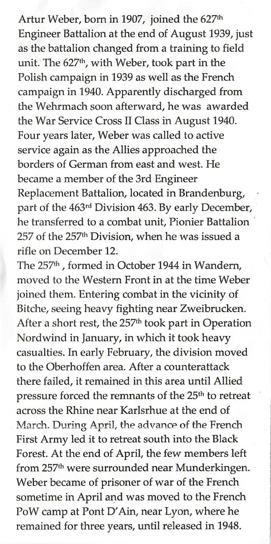 The 257th, formed in October 1944 in Wandern, moved to the Western Front in at the time Weber joined them. Entering combat in the vicinity of Bitche, seeing heavy fighting near Zweibrucken. After a short rest, the 257th took part in Operation Nordwind in January, in which it took heavy casualties. In early February, the division moved to the Oberhoffen area. After a counterattack there failed, it remained in this area until Allied pressure forced the remnants of the 25th to retreat across the Rhine near Karlsrhue at the end of March. During April, the advance of the French First Army led it to retreat south into the Black Forest. At the end of April, the few members left from 257th were surrounded near Munderkingen. Weber became of prisoner of war of the French sometime in April and was moved to the French PoW camp at Pont D'Ain, near Lyon, where he remained for three years, until released in 1948.