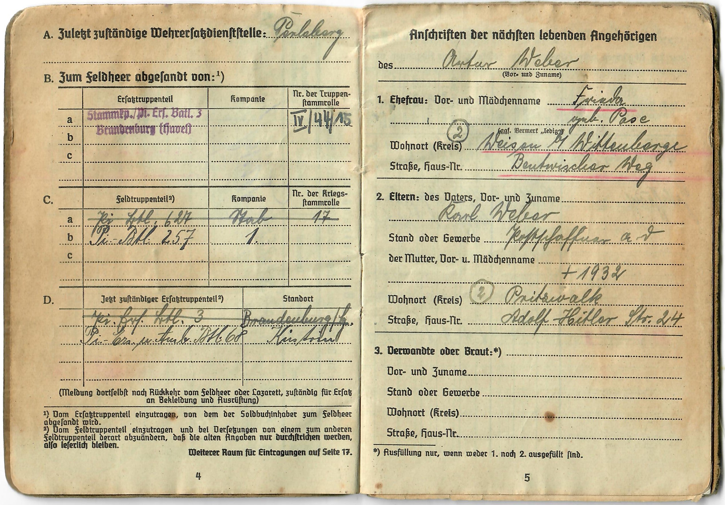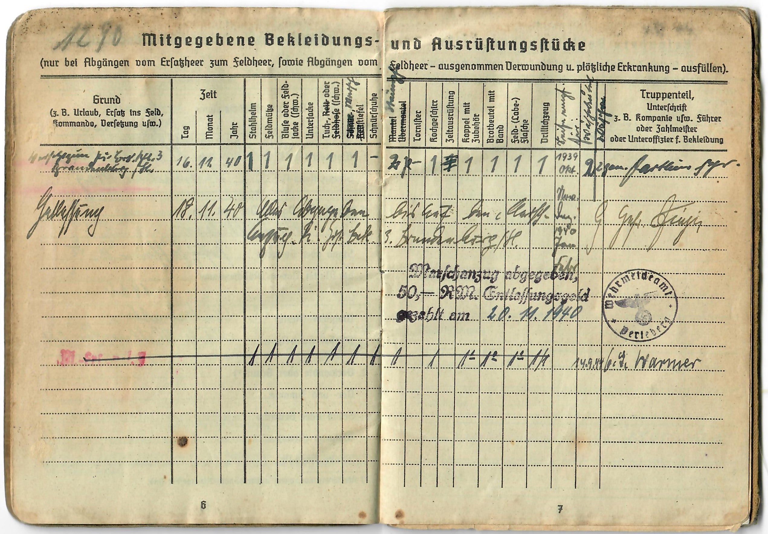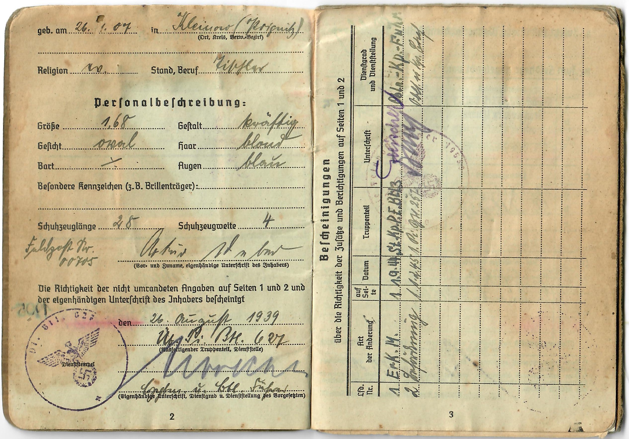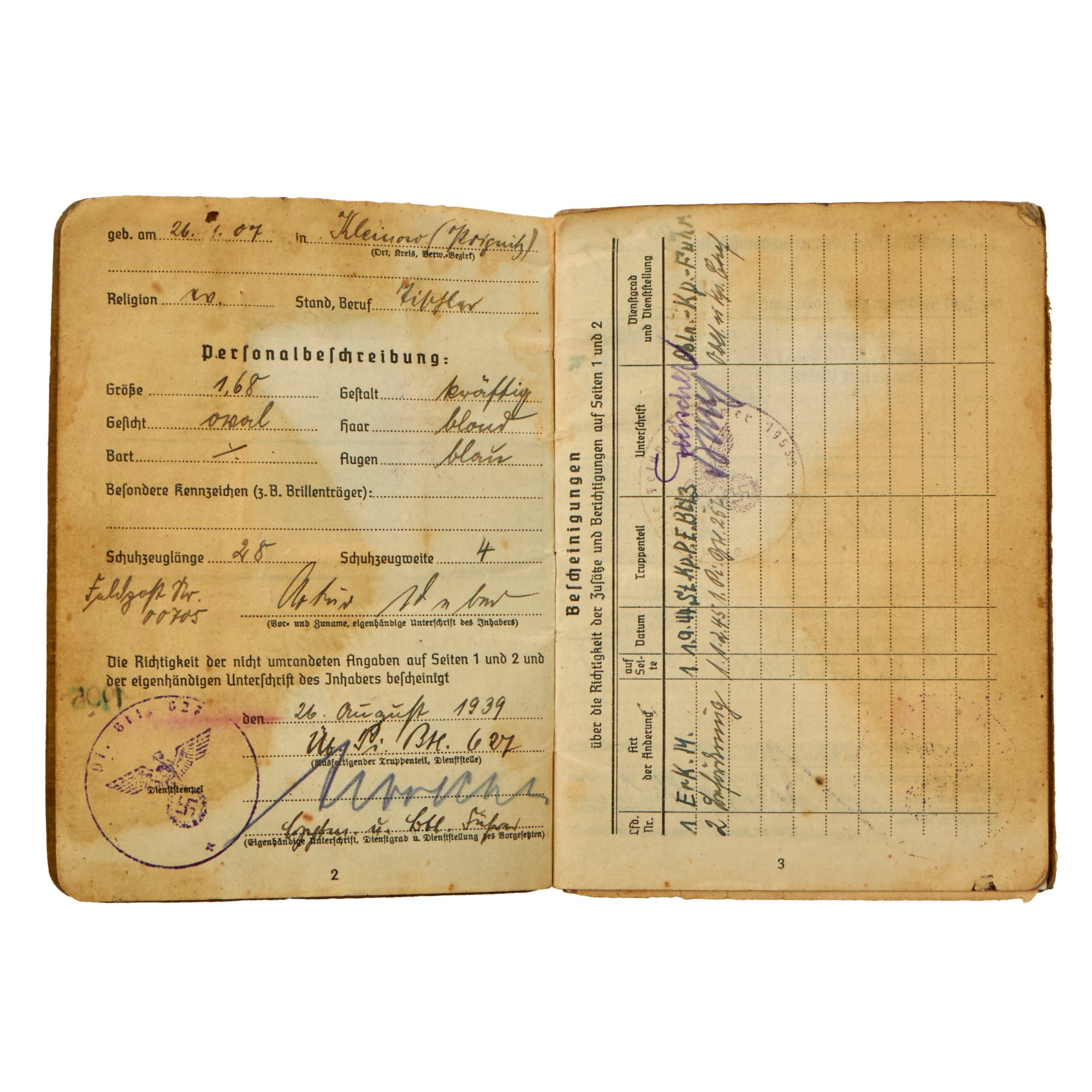 The Soldbuch served the soldier as a personal identification document in wartime and as an authorization to receive pay from his own or outside pay-stations. In addition, it was identification for rail travel, detached service, leave, and for receiving mail. The Soldbuch was always carried by the soldier on his person in a tunic pocket. Leaving the book in one's baggage or in one's quarters was not permitted. The careful preservation of the book was in the best interest of the owner. The Soldbuch had to be kept in an orderly fashion. The owner must see to it, that all changes in pay due to transfer or promotion are immediately entered by his responsible duty station. The Soldbuch was an official document. Entries were only to be made by a Wehrmacht duty station. Making unauthorized changes is punishable as falsification of official documents. The loss of a Soldbuch was to be reported as soon the loss is discovered to the holders unit or duty station, and the issue of a new Soldbuch will be requested.
