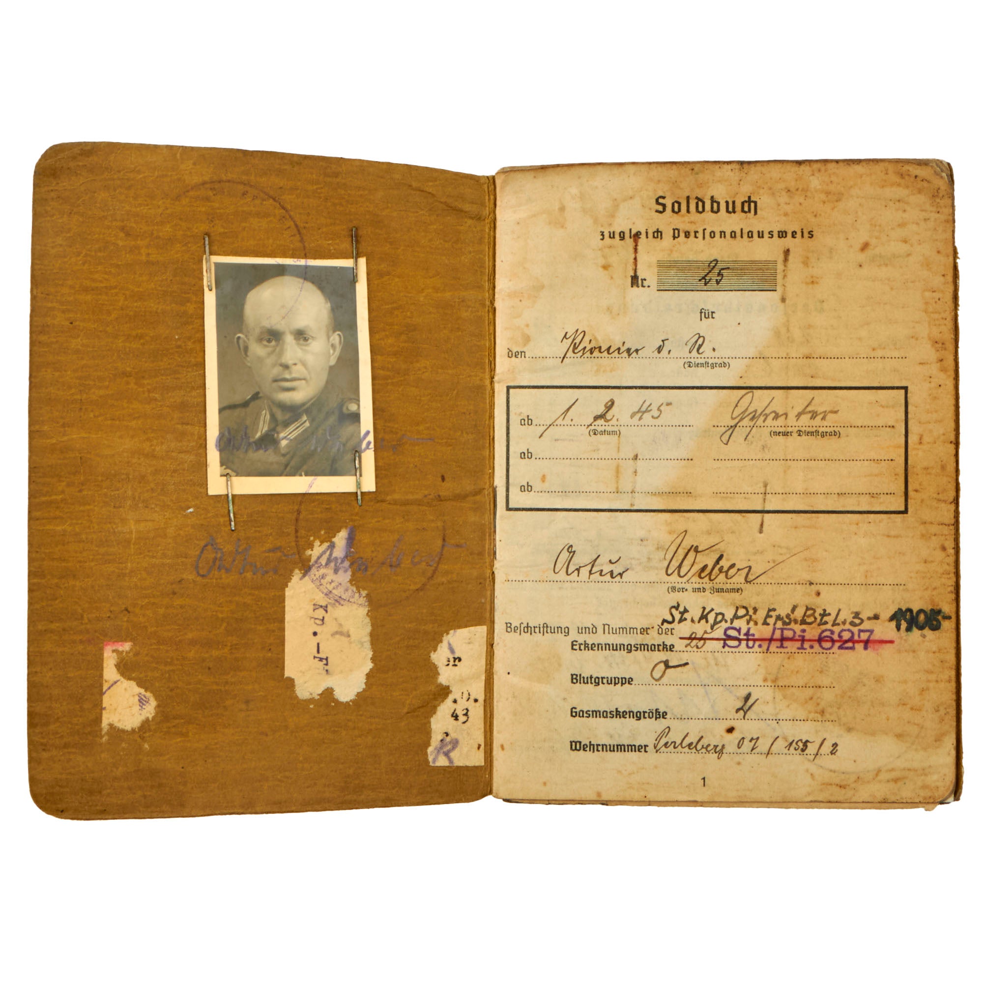 Original Item: One-of-a-kind. This is a fantastic genuine well-used WWII German Soldbuch, issued to Pionier der Reserve and later Gefreiter Artur Weber, a soldier in the Pioneer Corps who would see action in Unternehmen Nordwind (Operation Northwind). This was the last major German offensive of the war, meant to support the stalled Ardennes Offensive campaign Operation Watch on the Rhine, aka the "Battle of the Bulge". These failed to achieve their objectives, and Germany would be on the defensive for the rest of the war.