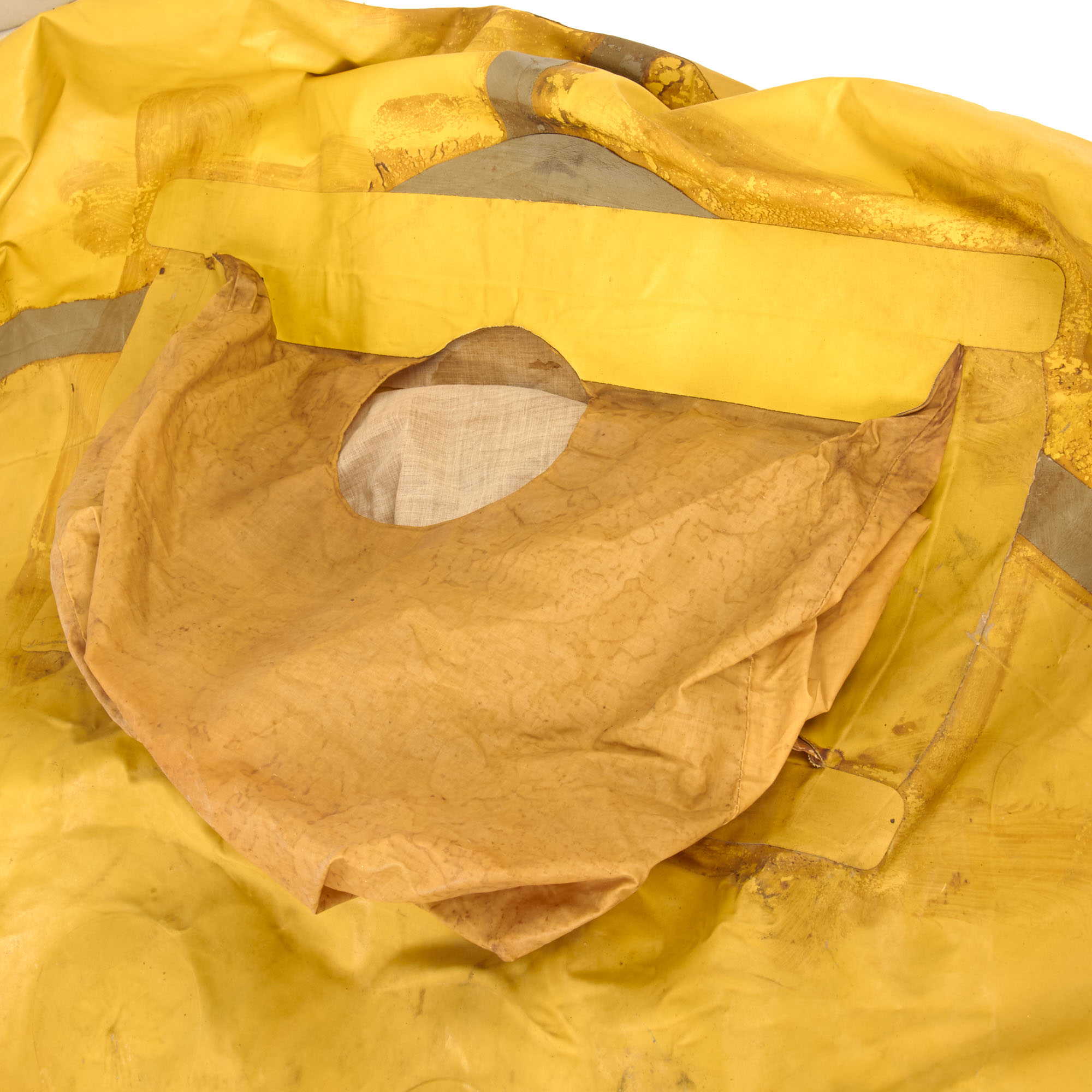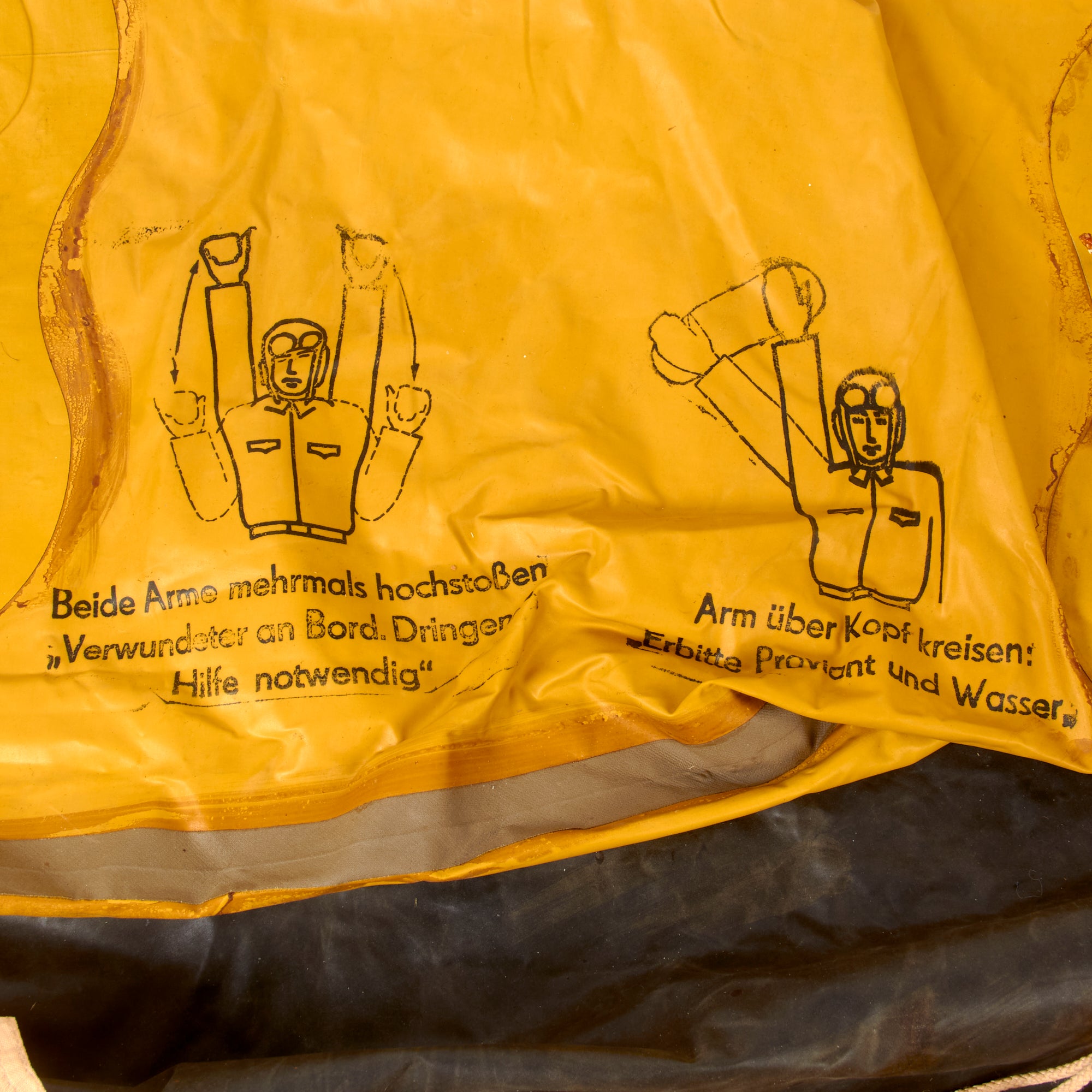 Original Item. Only One Available. This is an outstanding and scarce German Luftwaffe Survival Dinghy, a lifeboat or raft manufactured in a yellow rubberized fabric with one inflatable buoyancy chamber and integral water pocket on the underside. In use this would fill with water and provide stability and ballast. These were issued in Luftwaffe aircraft for bailouts over water. As shown, the raft is still inflatable and holds air without issue! The set comes with several accessories including a Paddle Oar & Foot Air Pump with Bakelite-Capped Rubber Tube, and Emergency Petrol & Water Canteens.