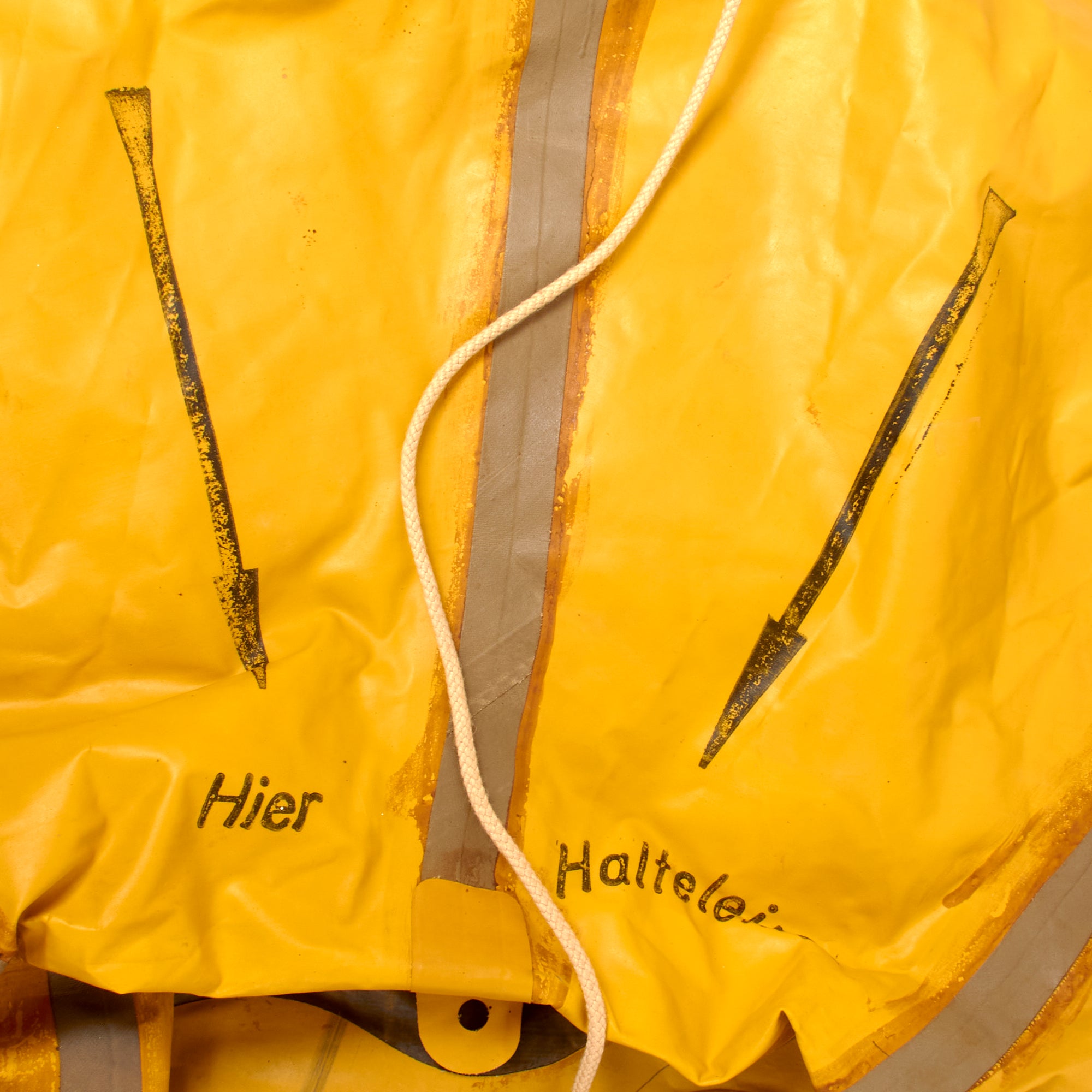 The code “bpl” denotes manufacture by Klepper-Werke of Rosenheim. We looked across the entire raft and found no discernable tears or holes, and we were able to inflate it making for an outstanding display. All of the pieces and rigging are intact, including the long black tube through which air is inflated. When laid out deflated, the raft measures 42 x 62”.