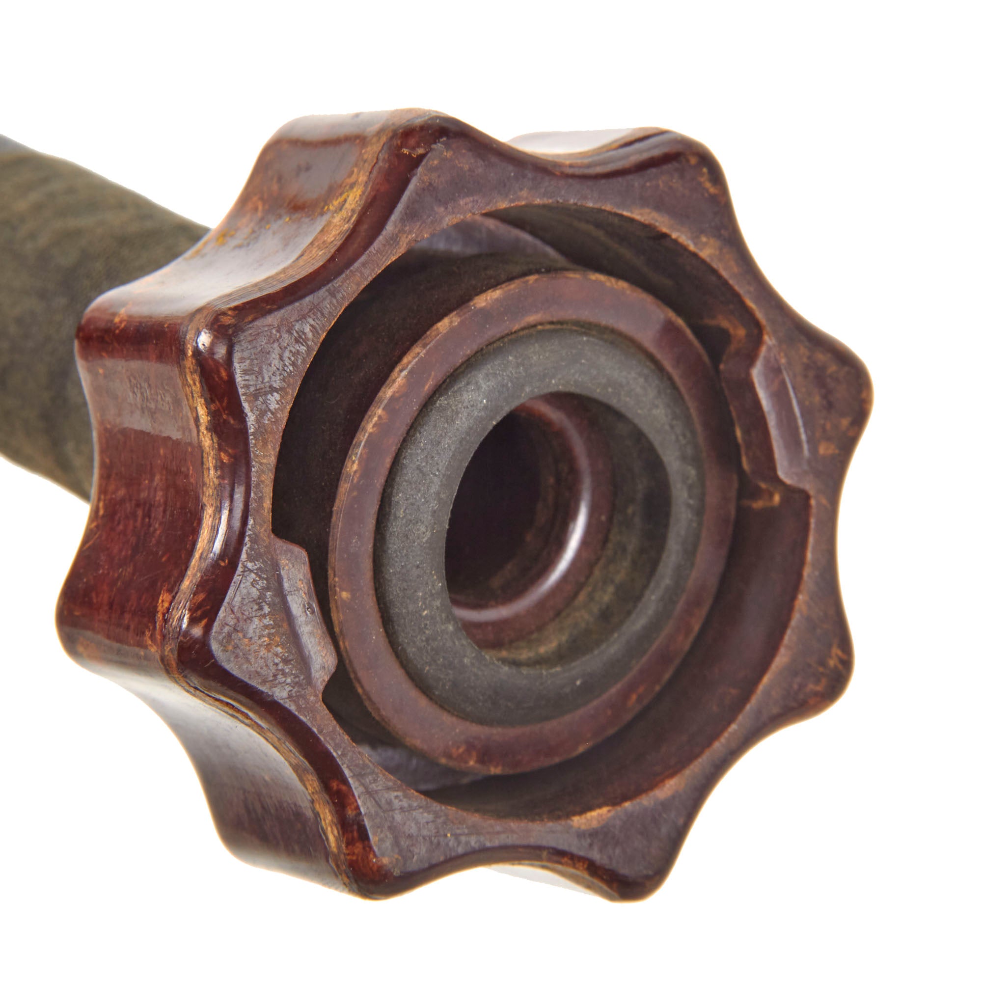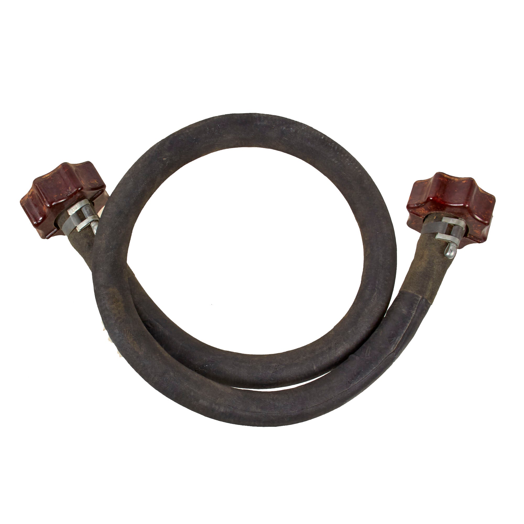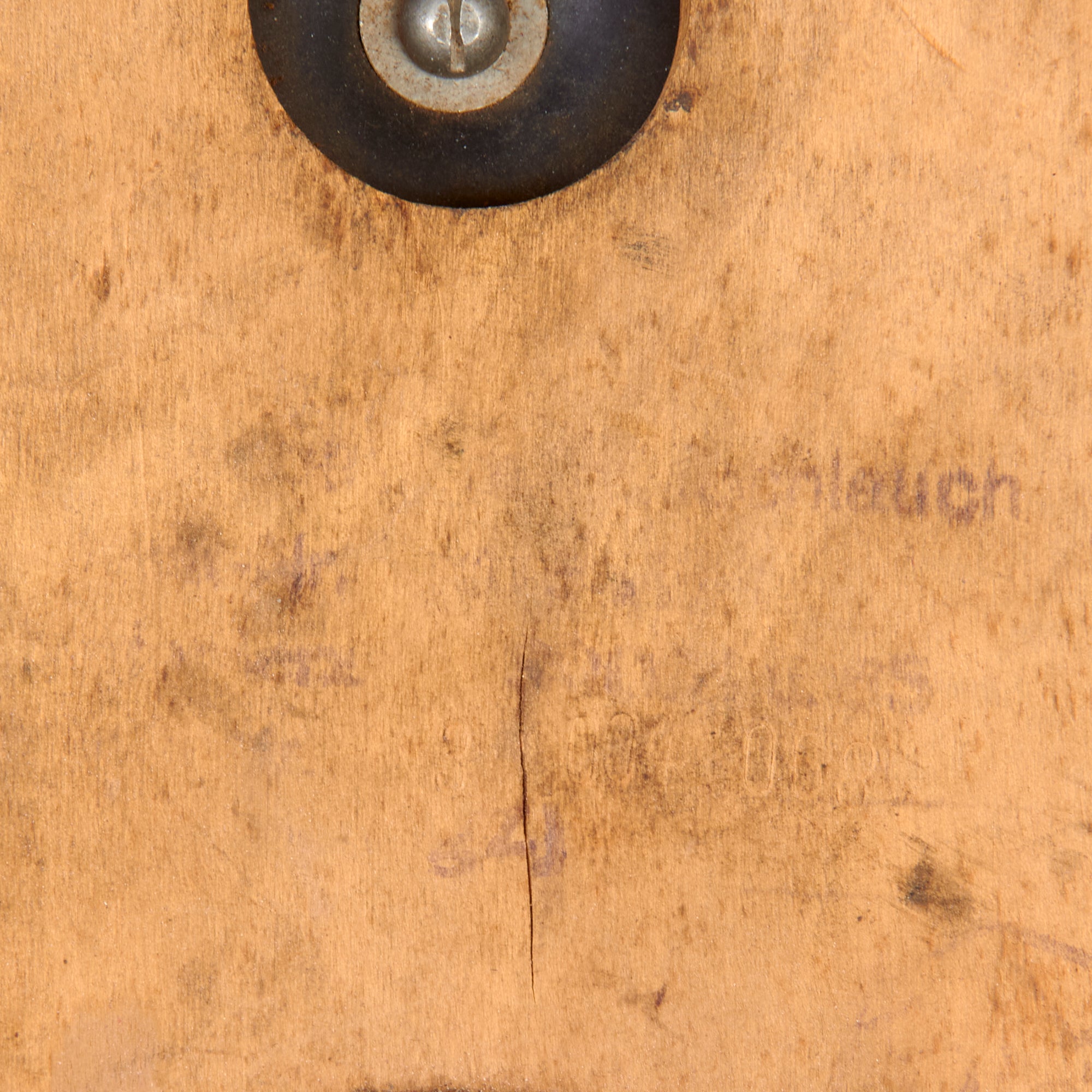 There is basic wear but the set is in great shape. The foot pump is in very good condition for its age. It still works, and the bakelite fittings are in great shape. There are faint stamps in the wood but none of them are intact enough to read. The pump itself measures 7 ¼ x 9 x 12”. The rubberized tube is roughly 36” at the most we could stretch it.