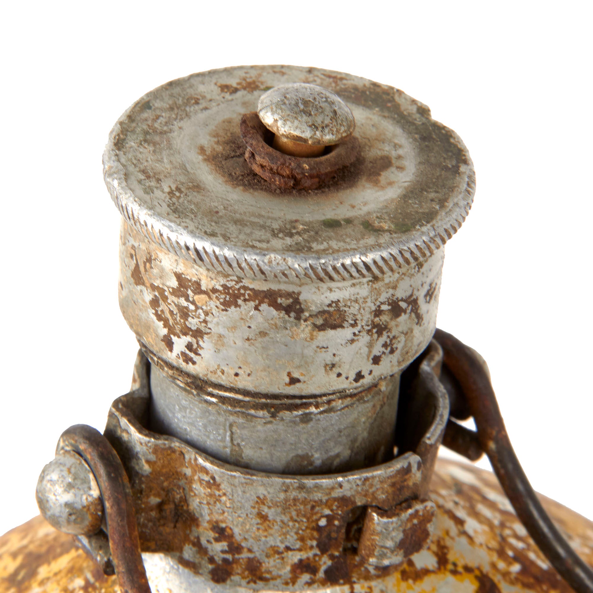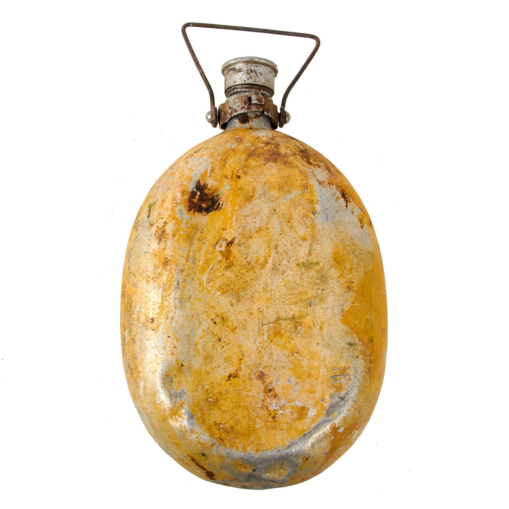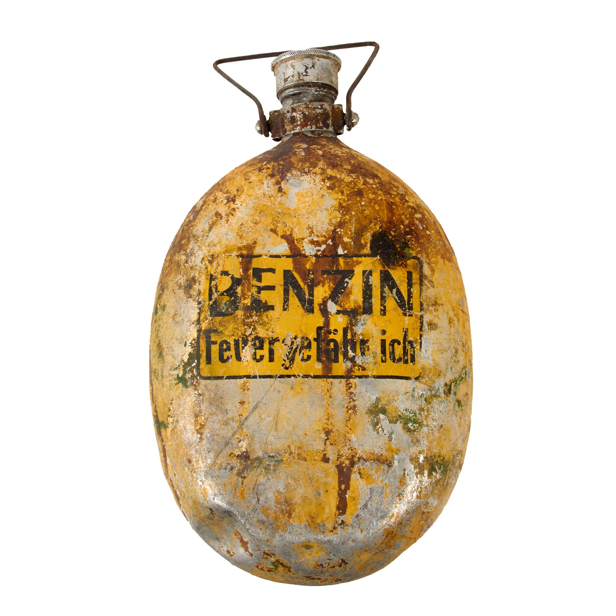 The petrol emergency canteen is painted yellow and has a partially intact painted marking reading BENZIN / Feuergefӓbrich, but there is extreme wear as shown. The wooden handle is gone but the wire handle is still present.