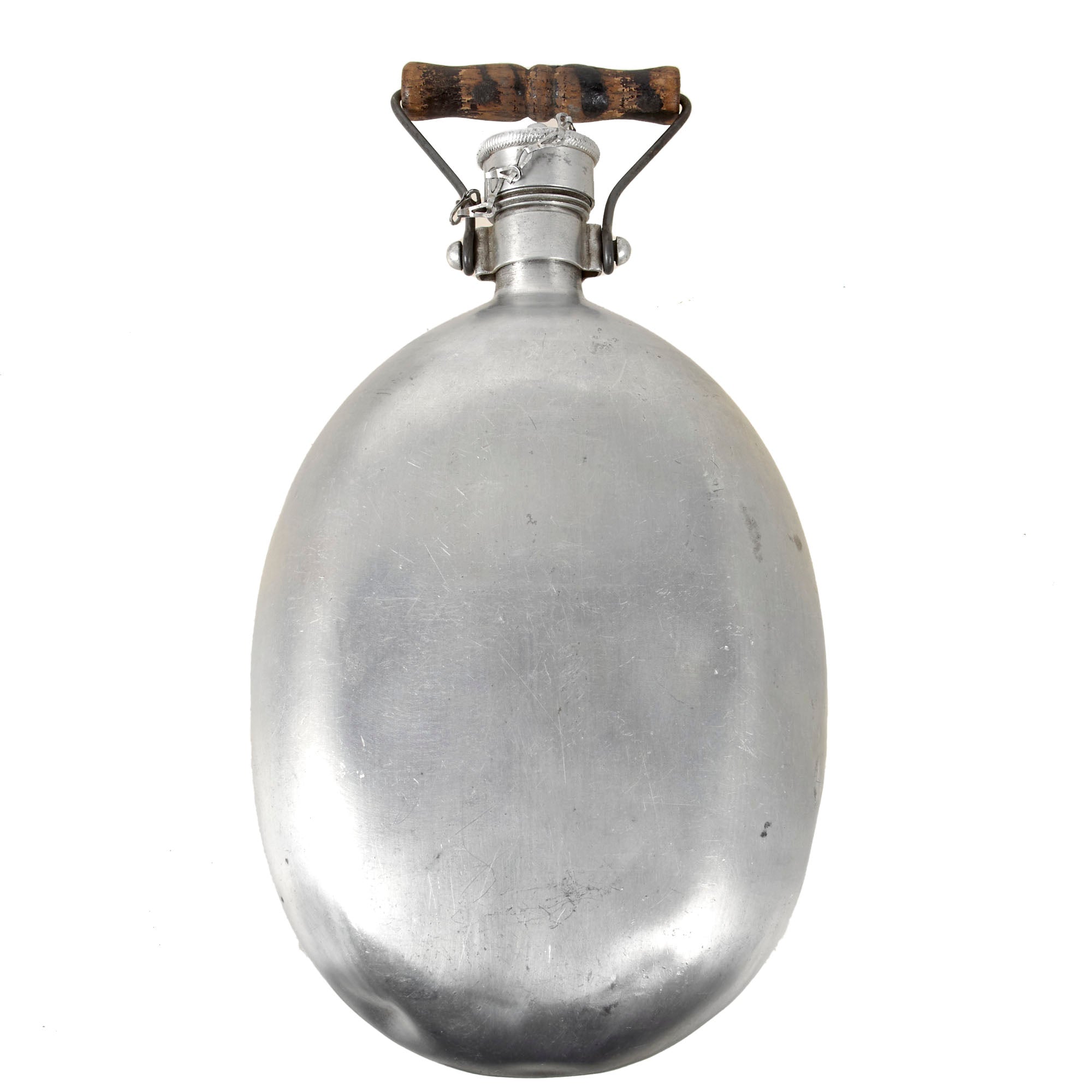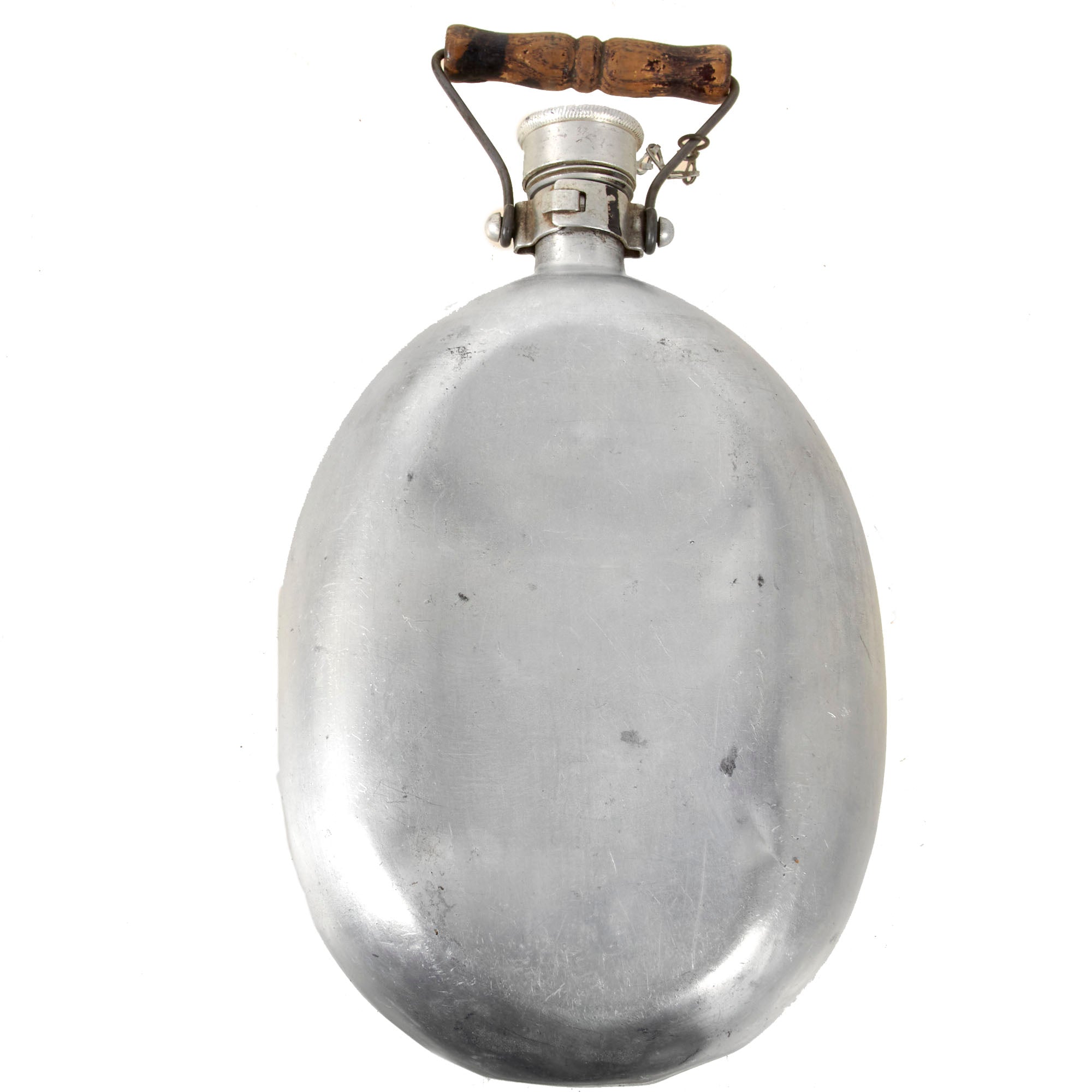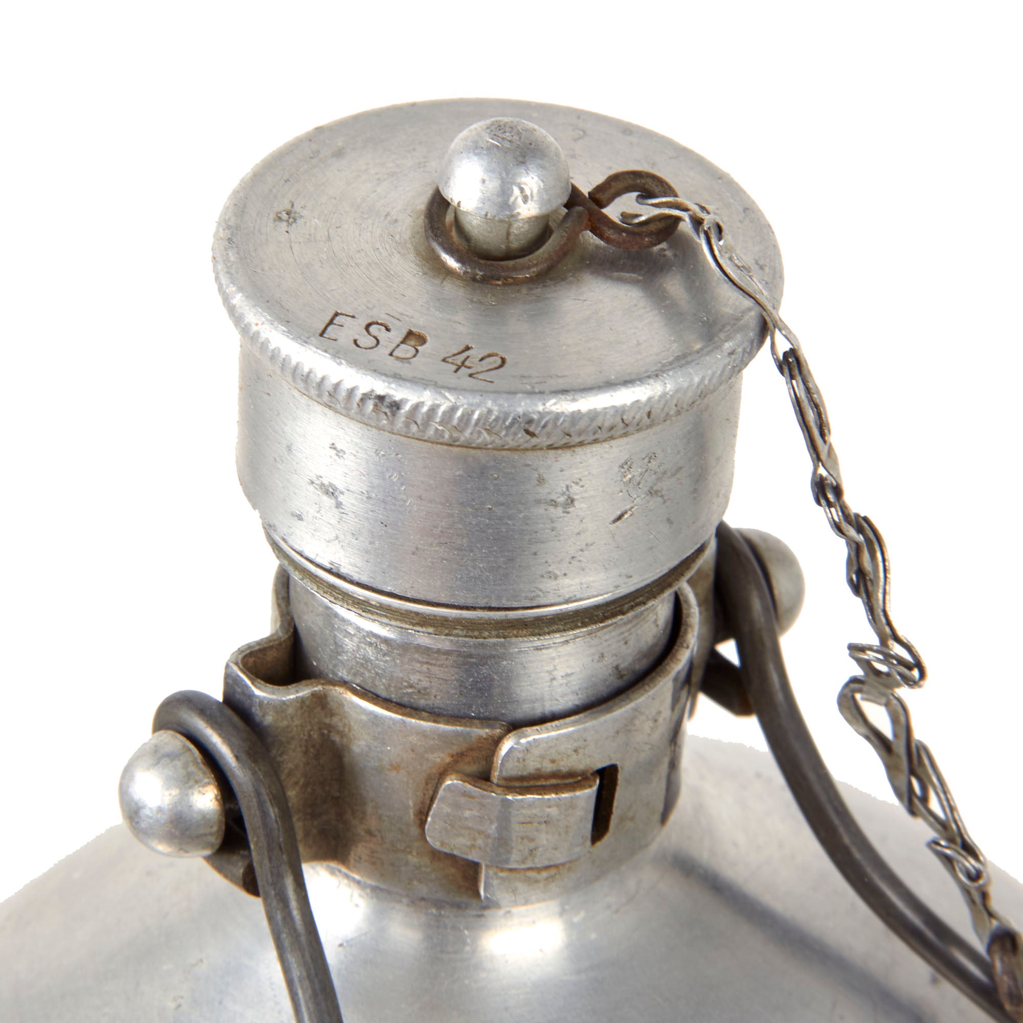 The water emergency canteen is stamped on the cap ESB 42 for Eduard Sommerfeld, Berlin. The original wooden handle is retained but very worn. It and the other canteen measures 11” long without the handle.