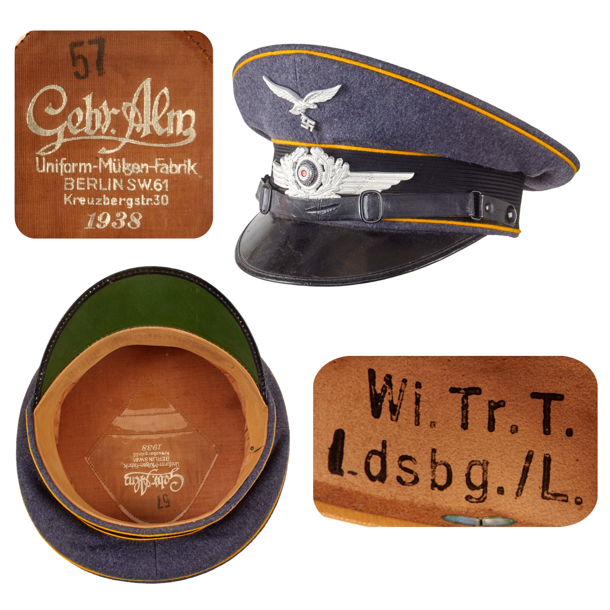 Stamped above the maker mark is the size 57. The tan sweatband is in very good supple condition, showing only light wear and staining from service. On the underside it has a Luftwaffe unit marking of Wi. Tr. T. over Ldsbg. / L., which unfortunately we have not been able to decipher. Definitely some great research potential here!