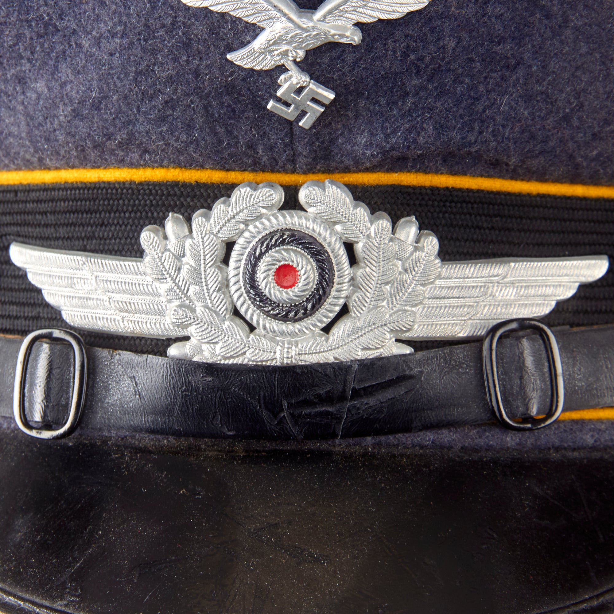 The is decorated with the correct metal insignia, including a finely-detailed aluminum eagle on the peak, and an aluminum oak leaf wreath with stylized wings and central painted tri-color cockade on the band. These are in very good condition, though the paint on the cockade is a bit worn. The dual-buckled black leather chinstrap, designating the wearer to be an enlisted man, is attached to black lacquered buttons on either side. It shows cracking and checking to the finish, very common on patent leather items of this age. The visor is the classic gloss black color with a faux leather stitched edge trim, made of pressed vulcanfibre, with a green underside. It shows crazing and checking on the visor, caused by age, and the edge trim is in wonderful condition and complete. The visor is still solidly attached to the body of the cap.