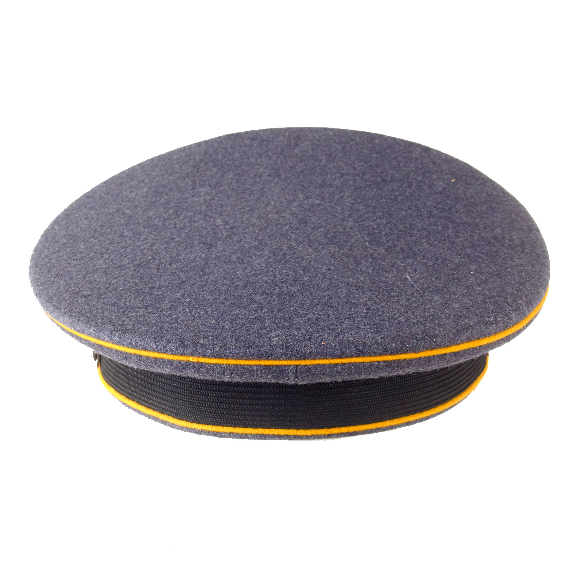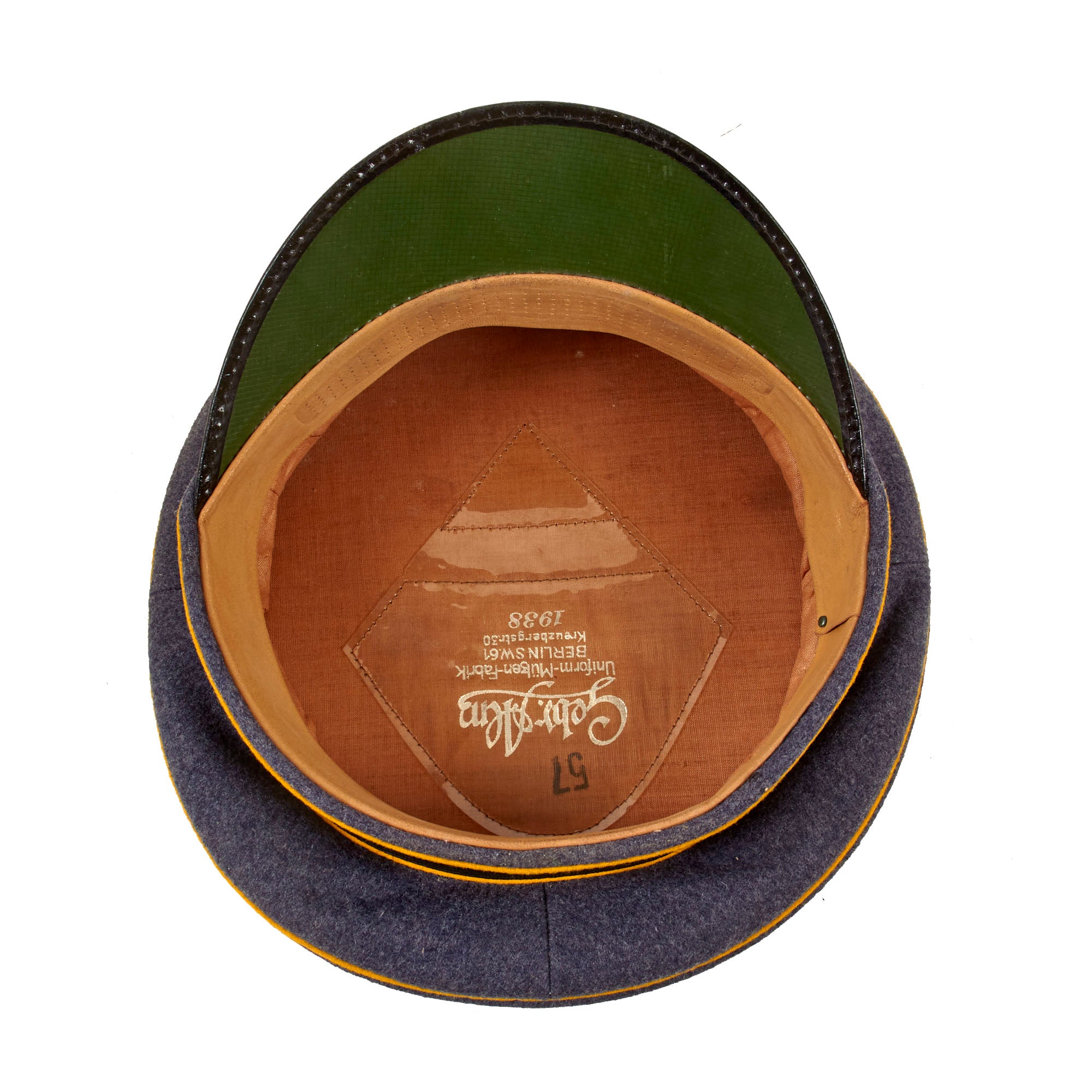 • Original Item: Only One available. This is an excellent condition Luftwaffe Flight Branch EM/NCO Schirmmütze (Visor Cap), made by Gebrüder Alm of Berlin, a known maker of visor caps for the Luftwaffe. It still has the original crown stiffener installed, so the sides have not sunken down over the years, giving it a gently "relaxed" look. This NCO Schirmmütze Visor Cap is an original high quality manufactured cap. It is fabricated in Luftwaffe blue gray Fliegerblau (Flier's Blue) "doeskin" weave wool, with wide black wool cap band, plus three rows of goldgelb (Gold-Yellow) color piping for the flight branch (Waffenfarbe) around the circumference. This included Aviator troops such as pilots and ground personnel as well as Fallschirmjäger (parachute troops).