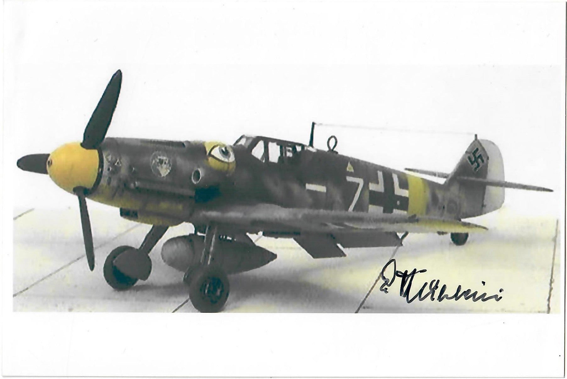● 6" x 4" signed recent photograph of Luftwaffe Ace Pilot Oberfeldwebel Elias Kühlein, who may have been promoted to Leutnant near the end of the war. He flew the Messerschmitt Bf 109 as part of JG51, and achieved 36 confirmed aerial victories by the end of the war in 600 missions.