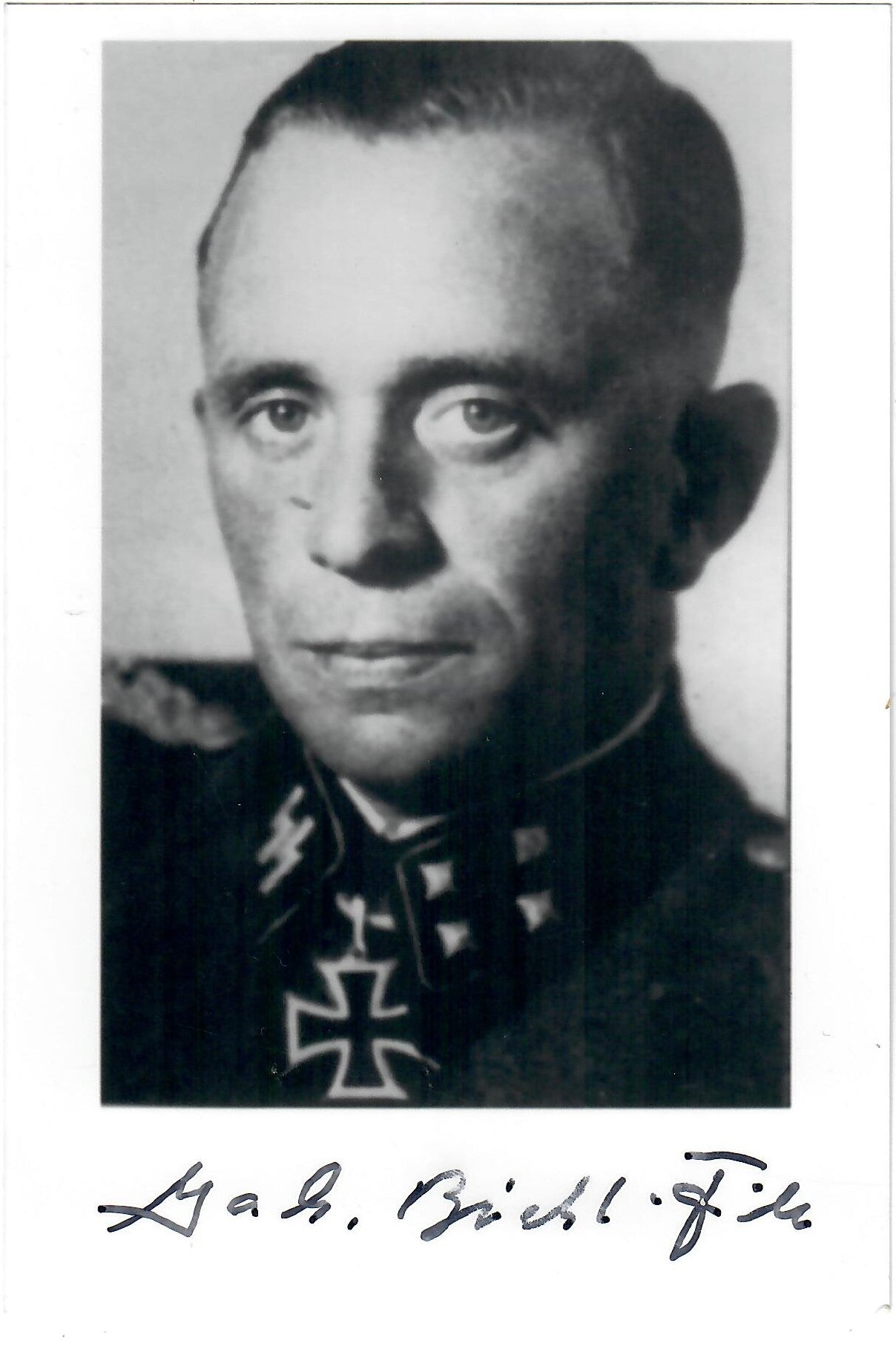 ● 4" x 5 7/8" signed recent photograph of SS-Standartenführer Jakob Fick, Knight's Cross Recipient, who after the war changed his name to Jacob Briehl Fick. He saw a good amount of service during the war, and personally led a sortie on his own initiative that resulted in his KC award.