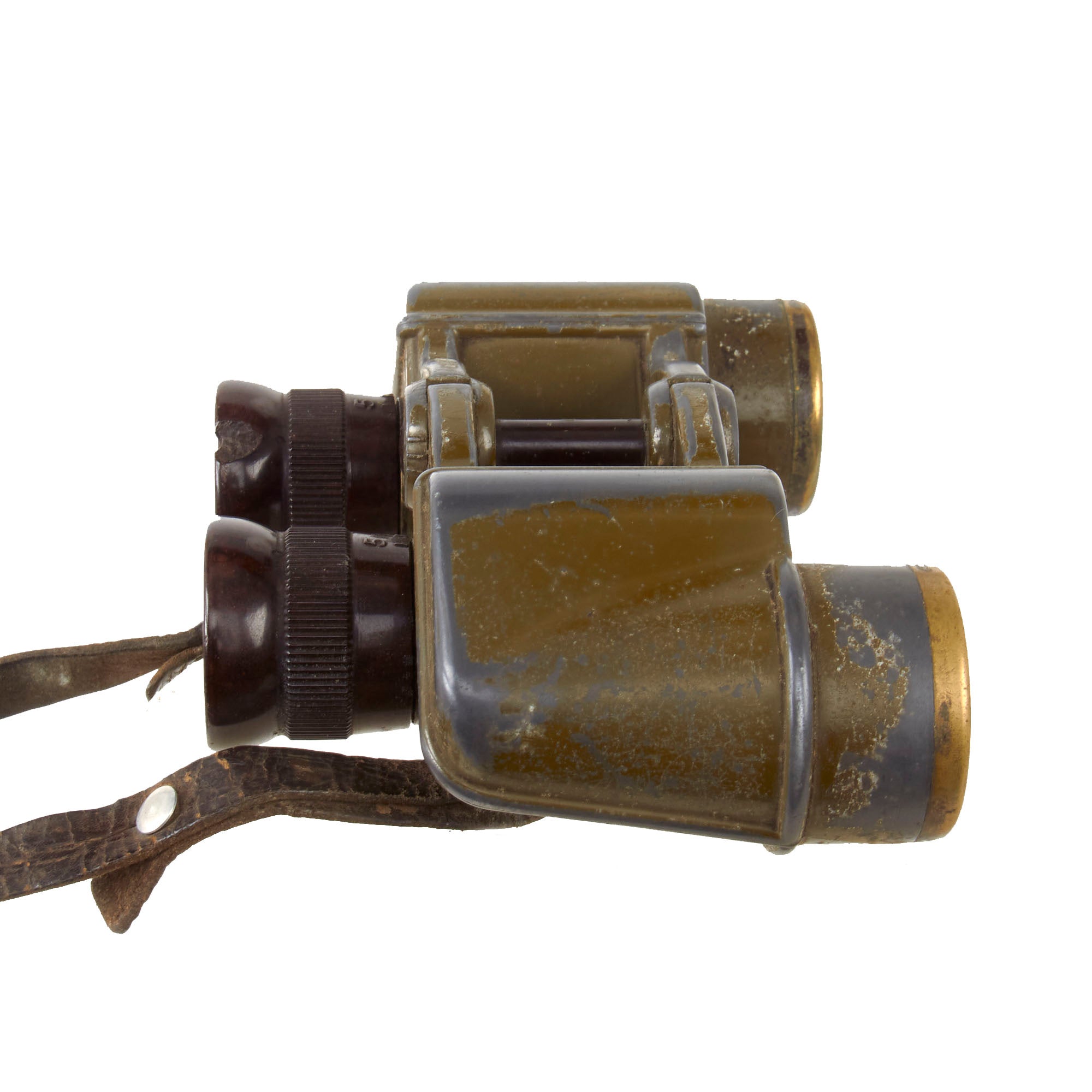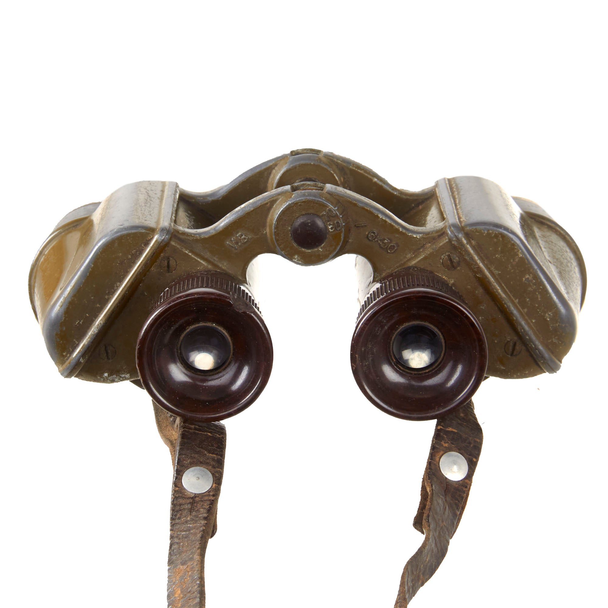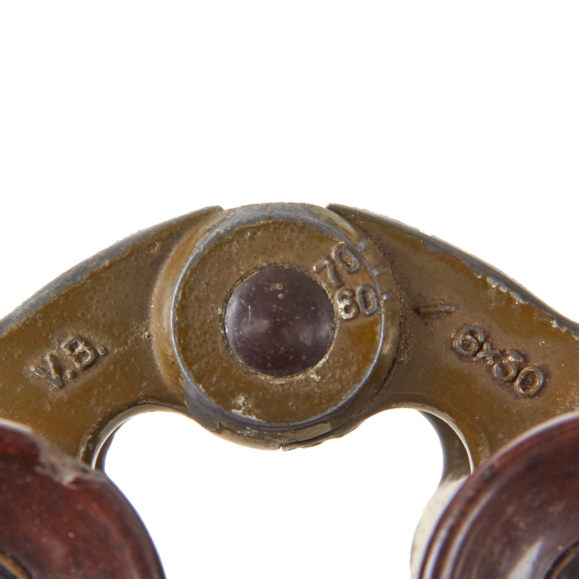 This is a good example of the scarce VB Voigtlander Braunschweig Labyrinth 6x30 Binoculars in the popular “Military Green” color. They are marked V.B. and 6 x 30 on the barrels, and 11-1004 on the other side of one. The eyepieces are bakelite, and both are retained but there is one large chip in one of them.