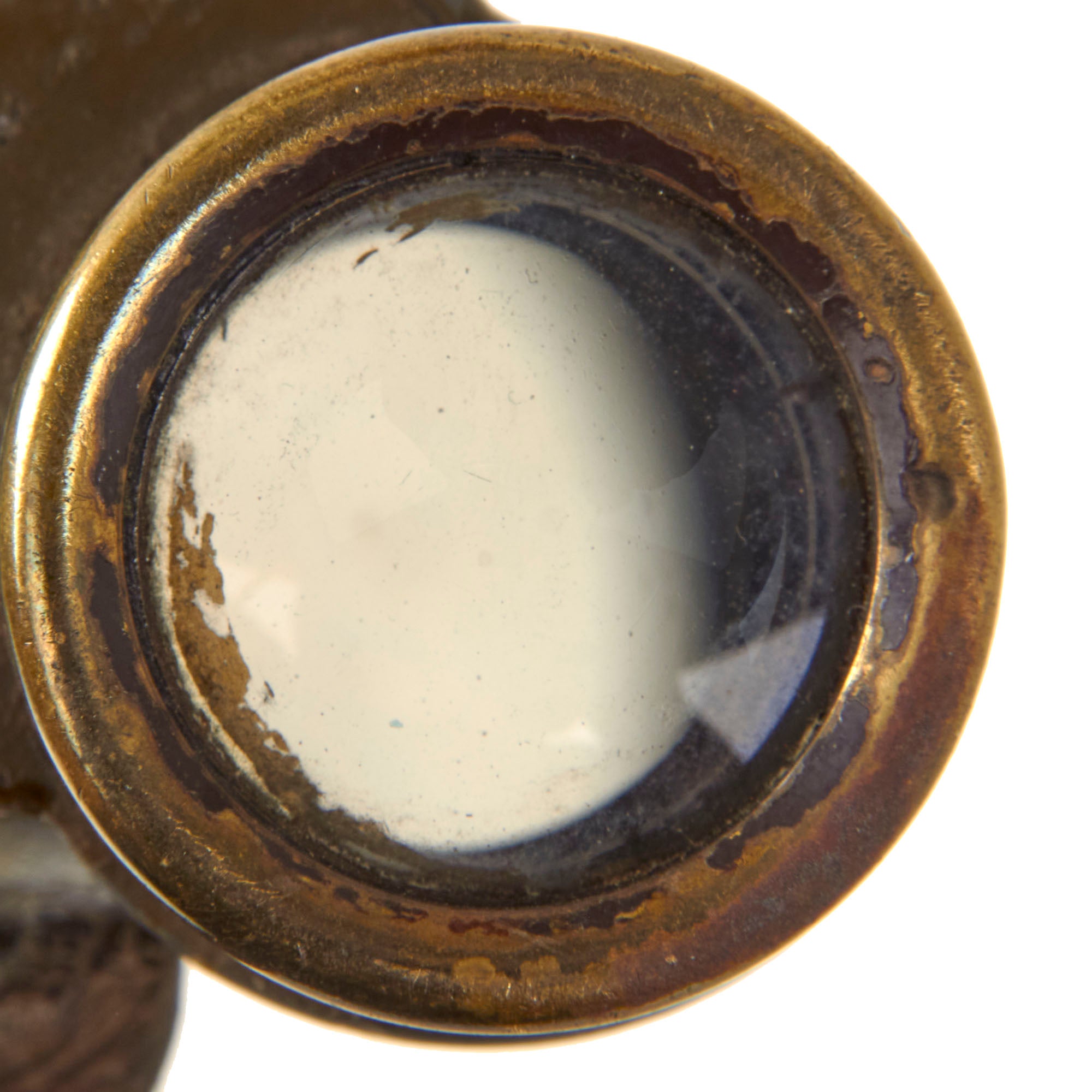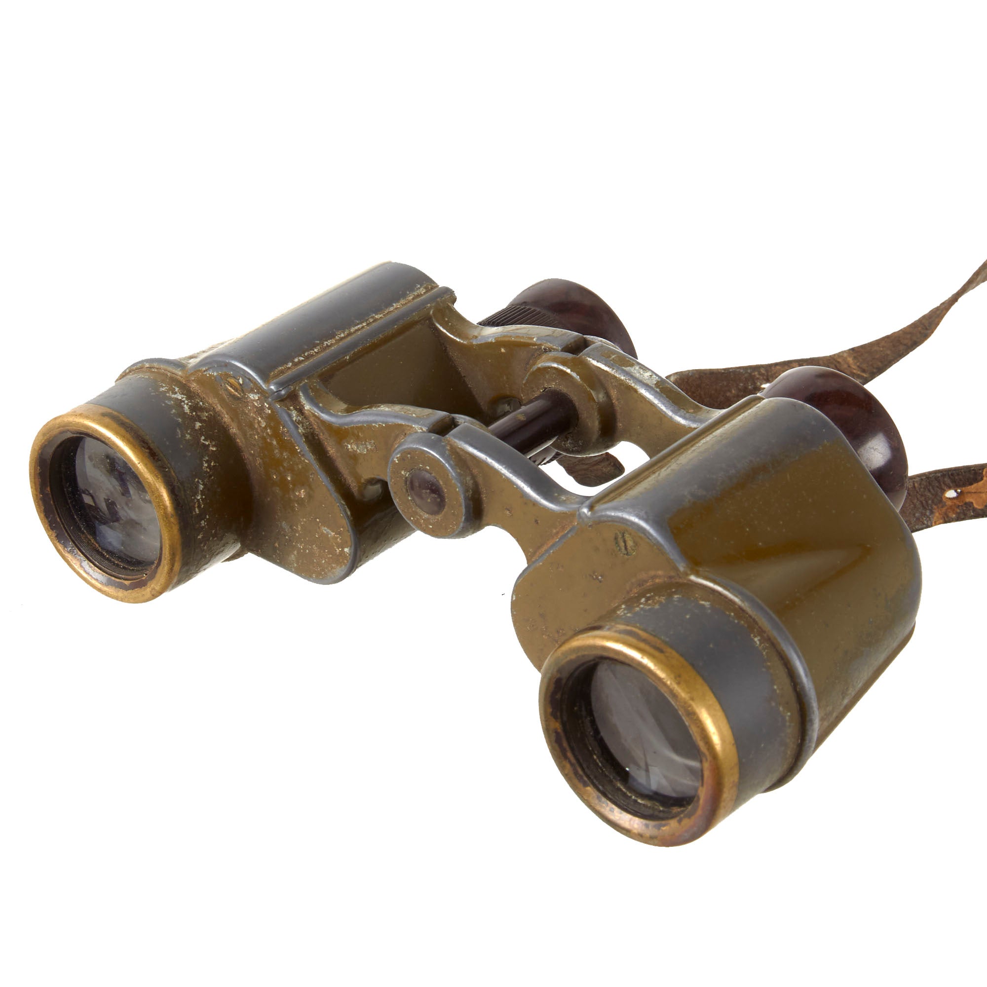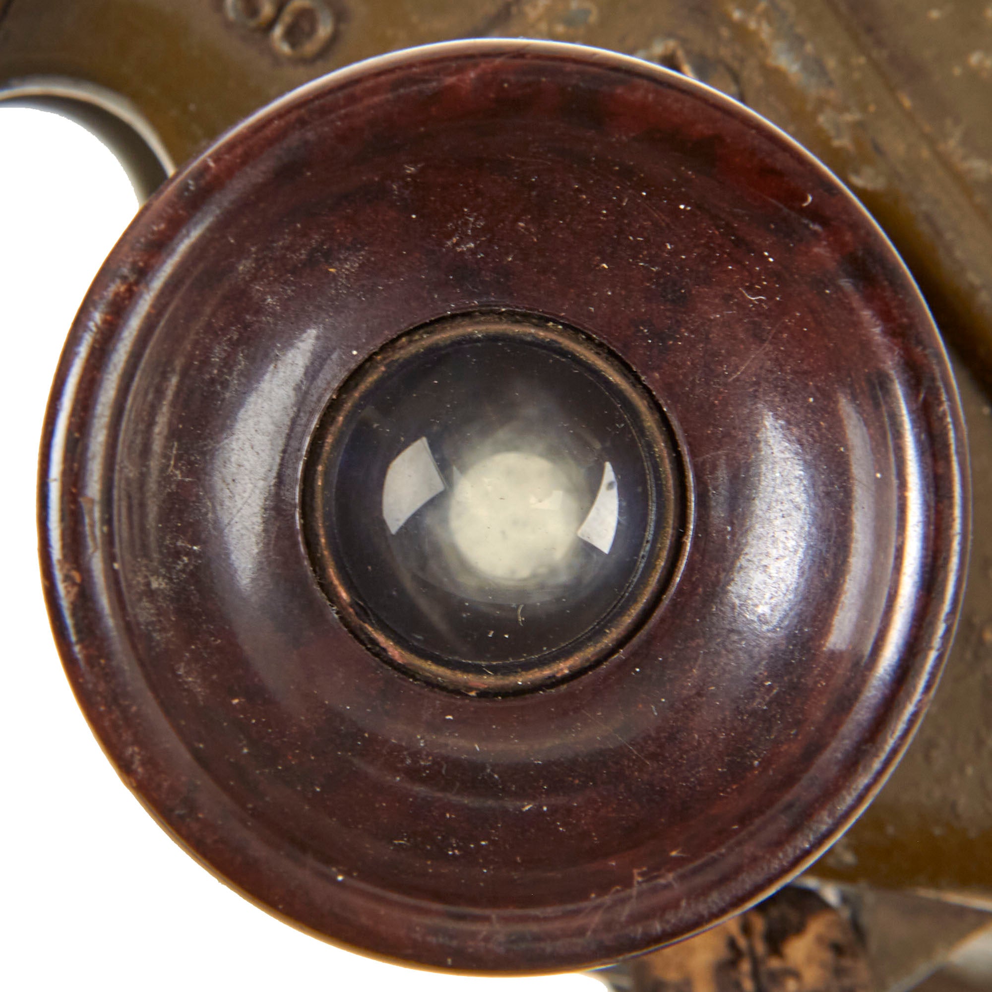 This is a good example of the scarce VB Voigtlander Braunschweig Labyrinth 6x30 Binoculars in the popular “Military Green” color. They are marked V.B. and 6 x 30 on the barrels, and 11-1004 on the other side of one. The eyepieces are bakelite, and both are retained but there is one large chip in one of them.