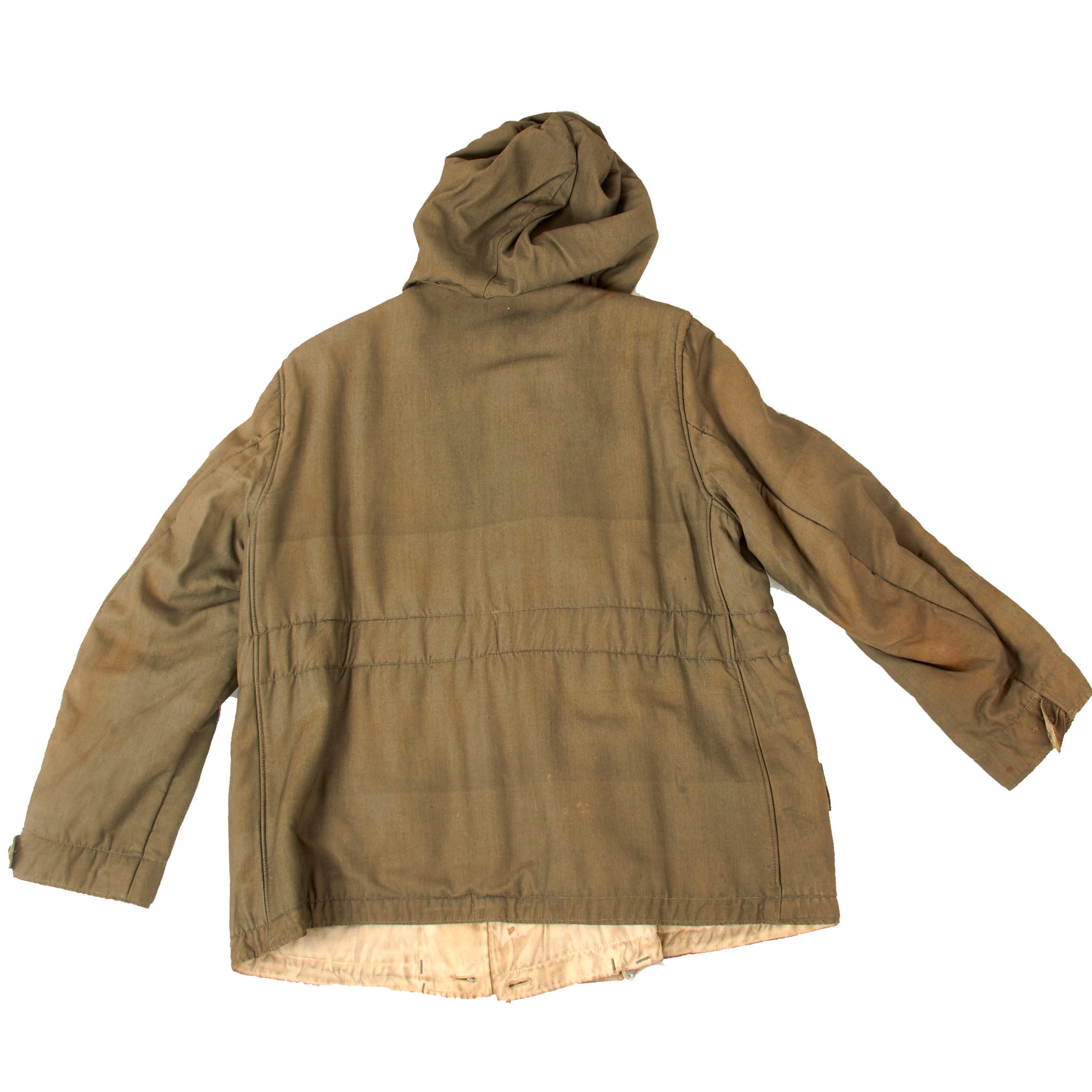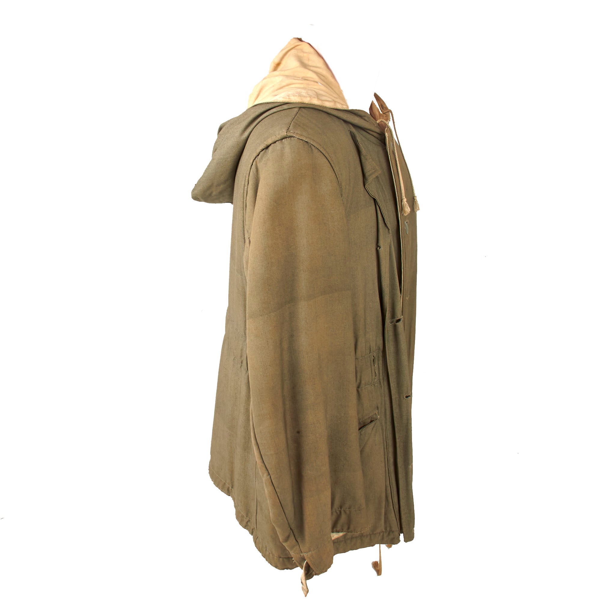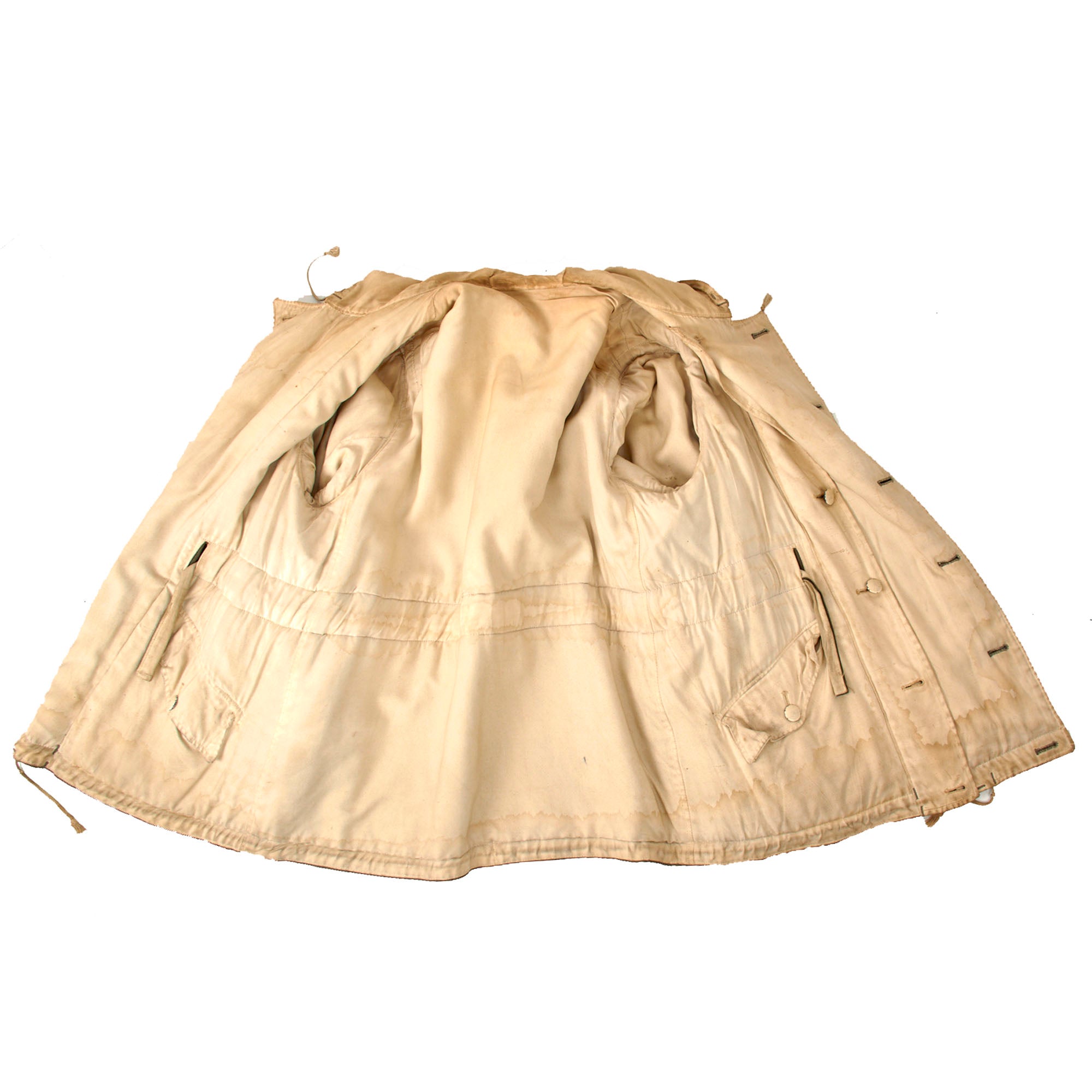 After the catastrophic winter of 1941-42 on the Eastern Front, the German military rapidly designed improved cold weather clothing. This included both uniform parkas as well as headgear, and the designs for these changed rapidly throughout the war. The Heer Army quickly fielded some early designs, and the Waffen SS of course were quick to field their own versions, which were in many ways improvement over the standard Army Design. This is a lovely German WWII Waffen-SS 1st Pattern Mouse Grey Reversible Parka, which features the very early scalloped pocket flaps on both sides. Unlike the Heer version, it is cotton on both sides with insulation inside the outer shell. It has "storm flaps" on both sides, and it is "double breasted", with a double row of 6 buttons. However, in this case they are meant to actually be used, which with the addition of the extra flap would make it very hard for cold air, rain, or anything else to get inside. We checked, and it still has faded markings under the white side storm flap, which read:-