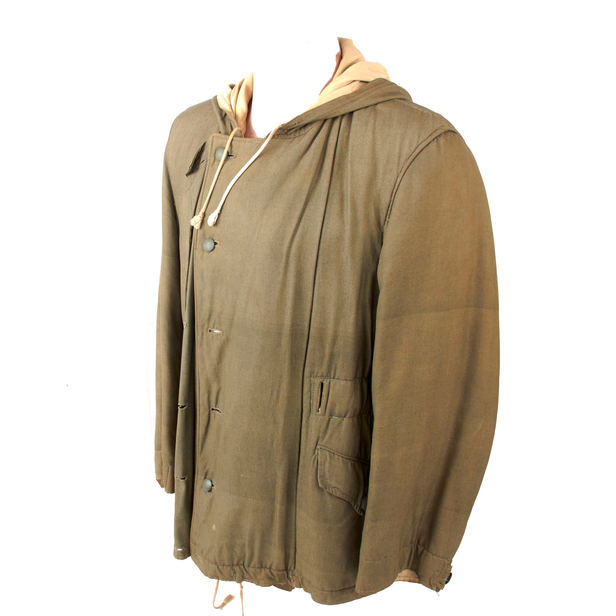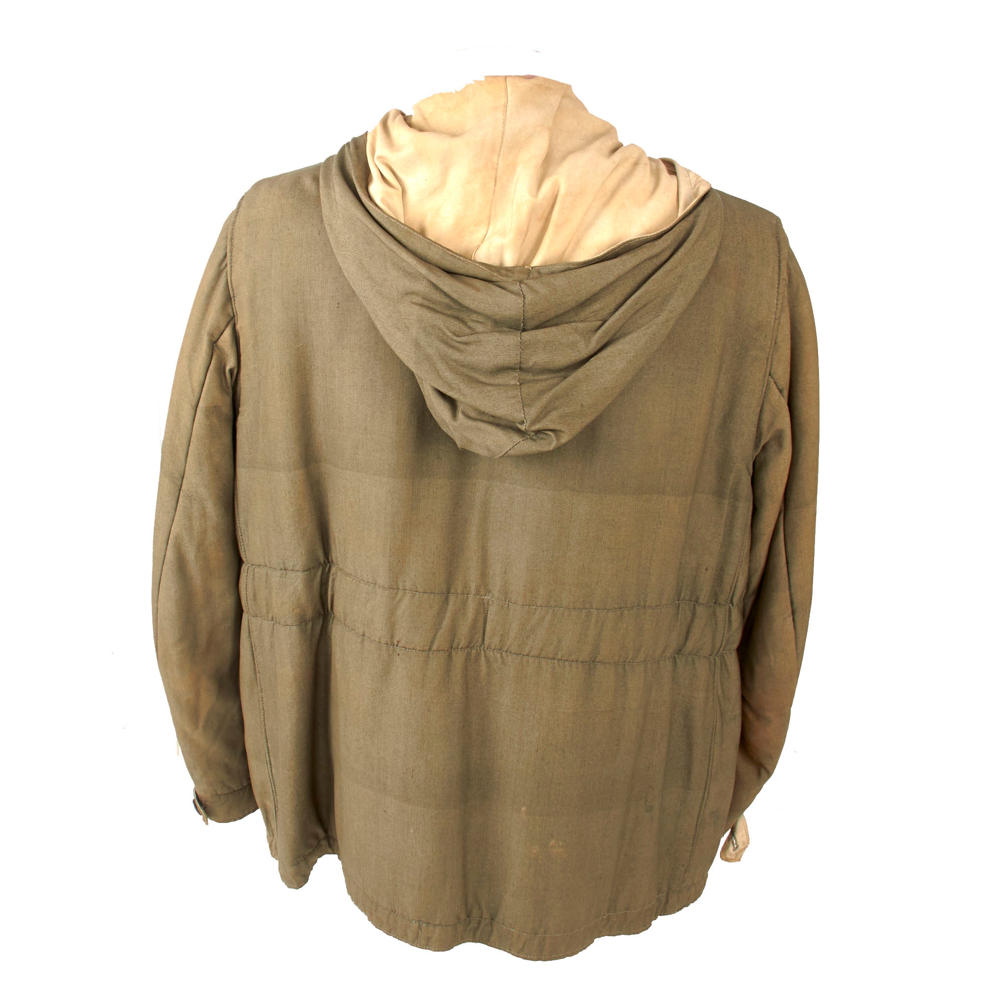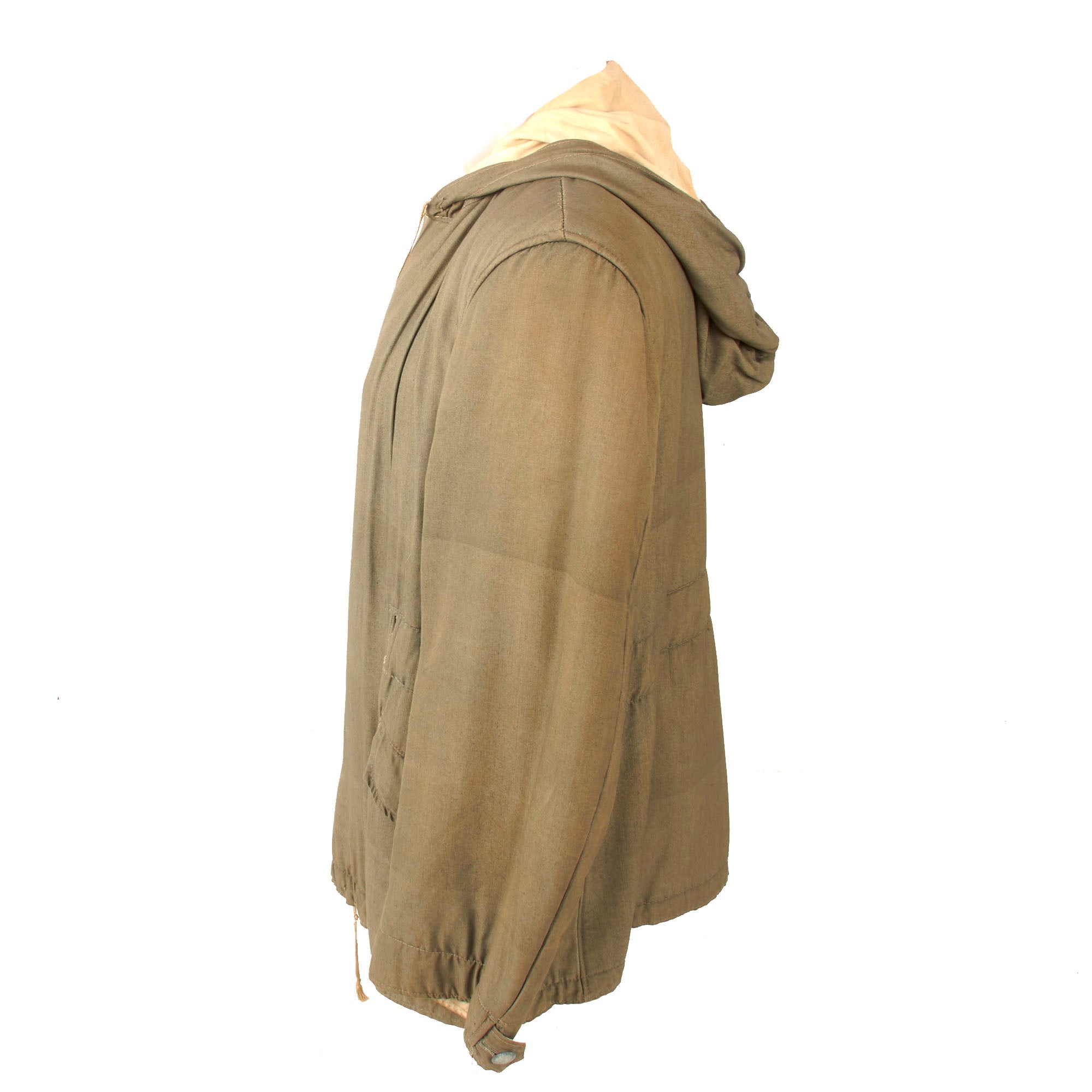 After the catastrophic winter of 1941-42 on the Eastern Front, the German military rapidly designed improved cold weather clothing. This included both uniform parkas as well as headgear, and the designs for these changed rapidly throughout the war. The Heer Army quickly fielded some early designs, and the Waffen SS of course were quick to field their own versions, which were in many ways improvement over the standard Army Design. This is a lovely German WWII Waffen-SS 1st Pattern Mouse Grey Reversible Parka, which features the very early scalloped pocket flaps on both sides. Unlike the Heer version, it is cotton on both sides with insulation inside the outer shell. It has "storm flaps" on both sides, and it is "double breasted", with a double row of 6 buttons. However, in this case they are meant to actually be used, which with the addition of the extra flap would make it very hard for cold air, rain, or anything else to get inside. We checked, and it still has faded markings under the white side storm flap, which read:-