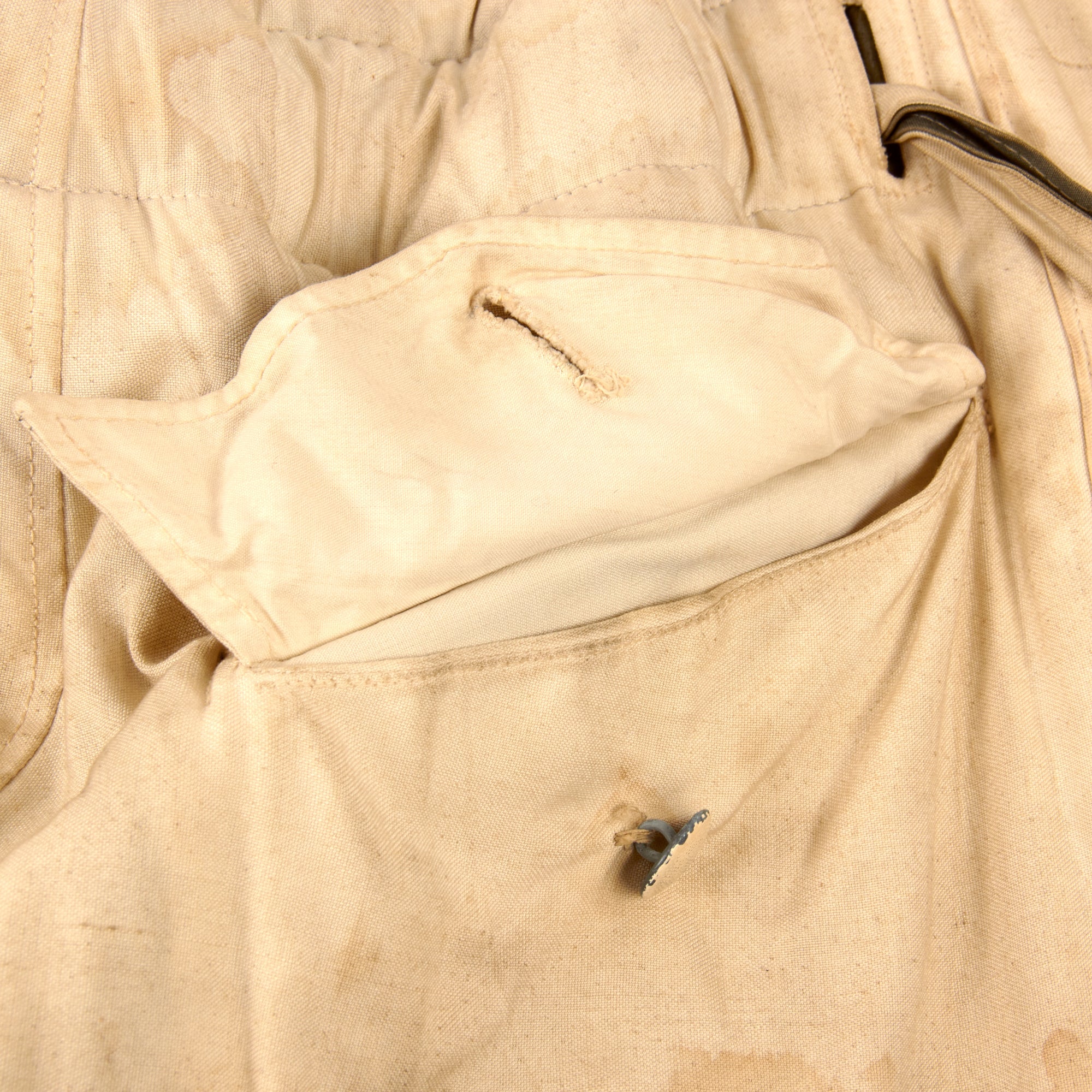 Both the hood and bottom drawstrings are present and move easily. The waist adjustment band is still present inside its sleeve, and is double sided, with one mouse gray and one white side. There are no buckles on it, so we assume that it was tied to the other side prior to buttoning up the parka. The buttons are all non-magnetic and painted, much of which is still retained. We did note that two of the mouse gray side front closure buttons are missing, probably having popped off long ago.