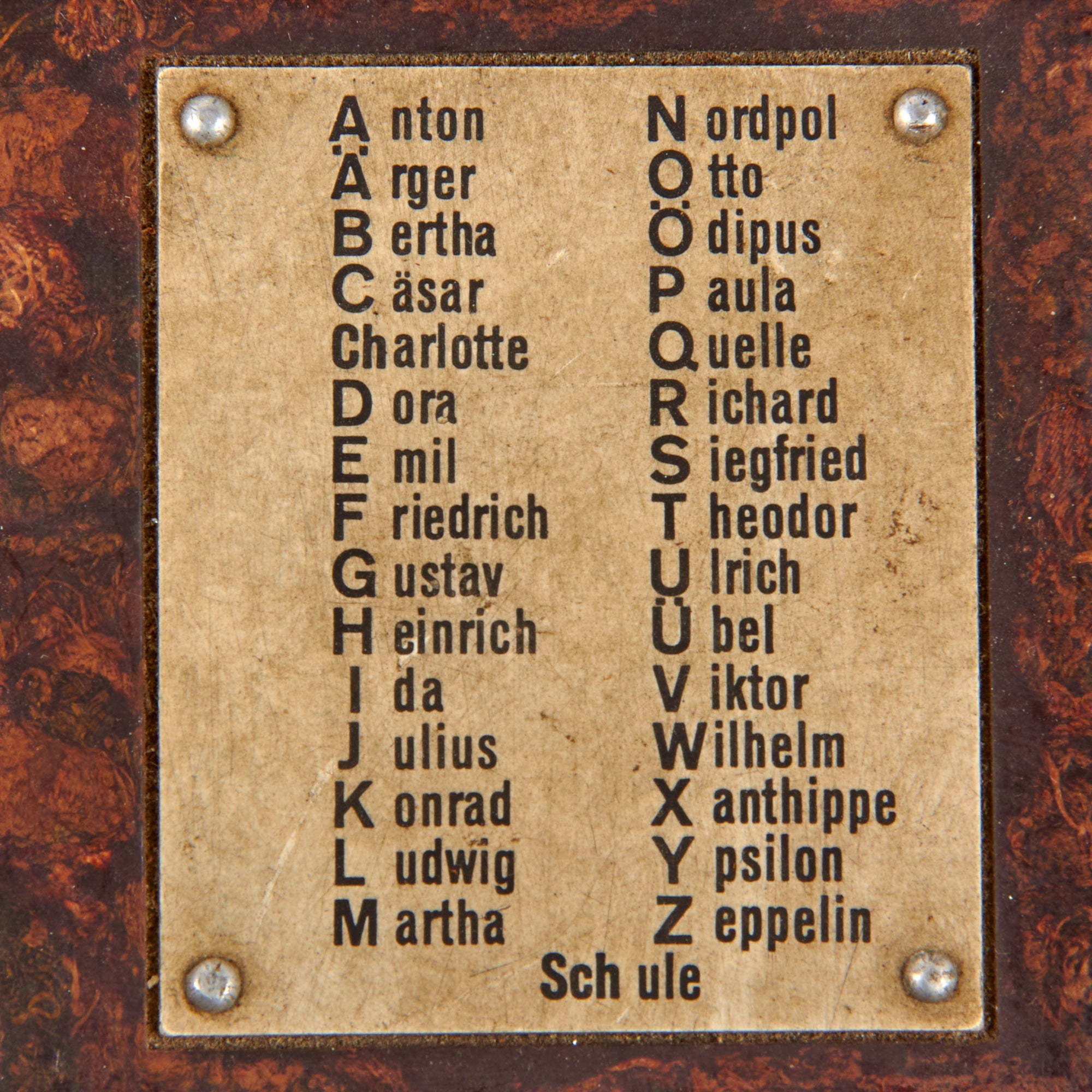 The set is housed in a bakelite case which consists of two parts, is hinged and fastened with a press to release spring latch. On the top of the case are two white panels. The panel on the left is used to record temporary information such as call signs or station number while the panel on the right is inscribed with the German phonetic alphabet. A dust cover on the front can be swung open to give access to two jacks; both jacks are common and also common to the incoming line terminations on the top of the phone. The jacks are used when patching two phones together or when connecting a field phone to an exchange line via an exchange line adaptor. The grill on the front of the case ports the sound of the ringer. On the right side of the case is another access plate which protects the port for installing the crank onto the generator. Sockets are located on each side of the lower case along the edge for installing a carrying strap. The leather carrying strap is usually missing from these telephones and is quite hard to find.