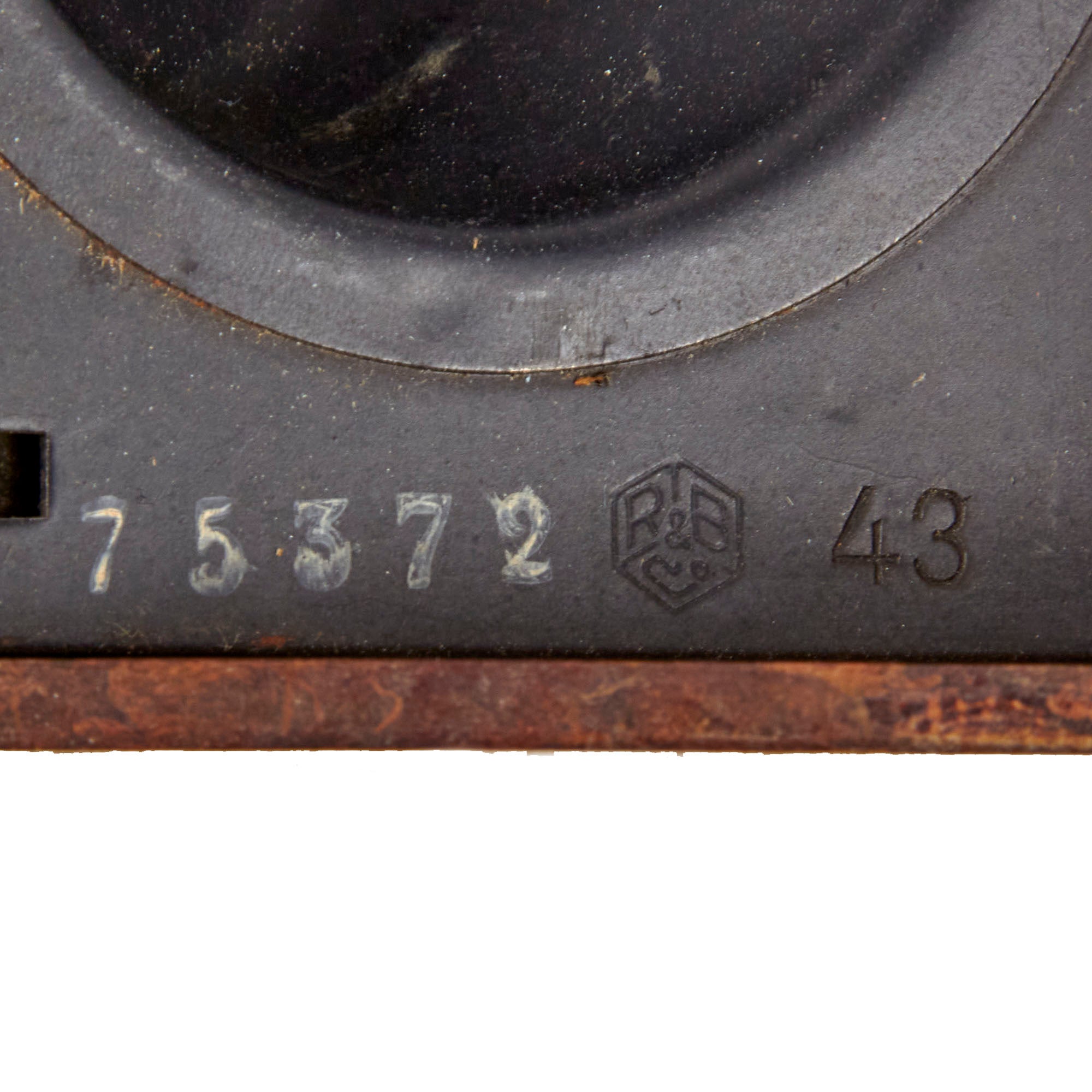 This phone is dated 1943 making it a mid-WWII issue, and comes complete with the winding handle. It is marked on the metal cradle with 75372 R&B Co 43., and has a Waffenamt inspection mark on the handset. We have no way to test its functionality. Overall condition is very good, with no cracks or chips in the bakelite case but there is heavy wear across. The carrying strap is missing.