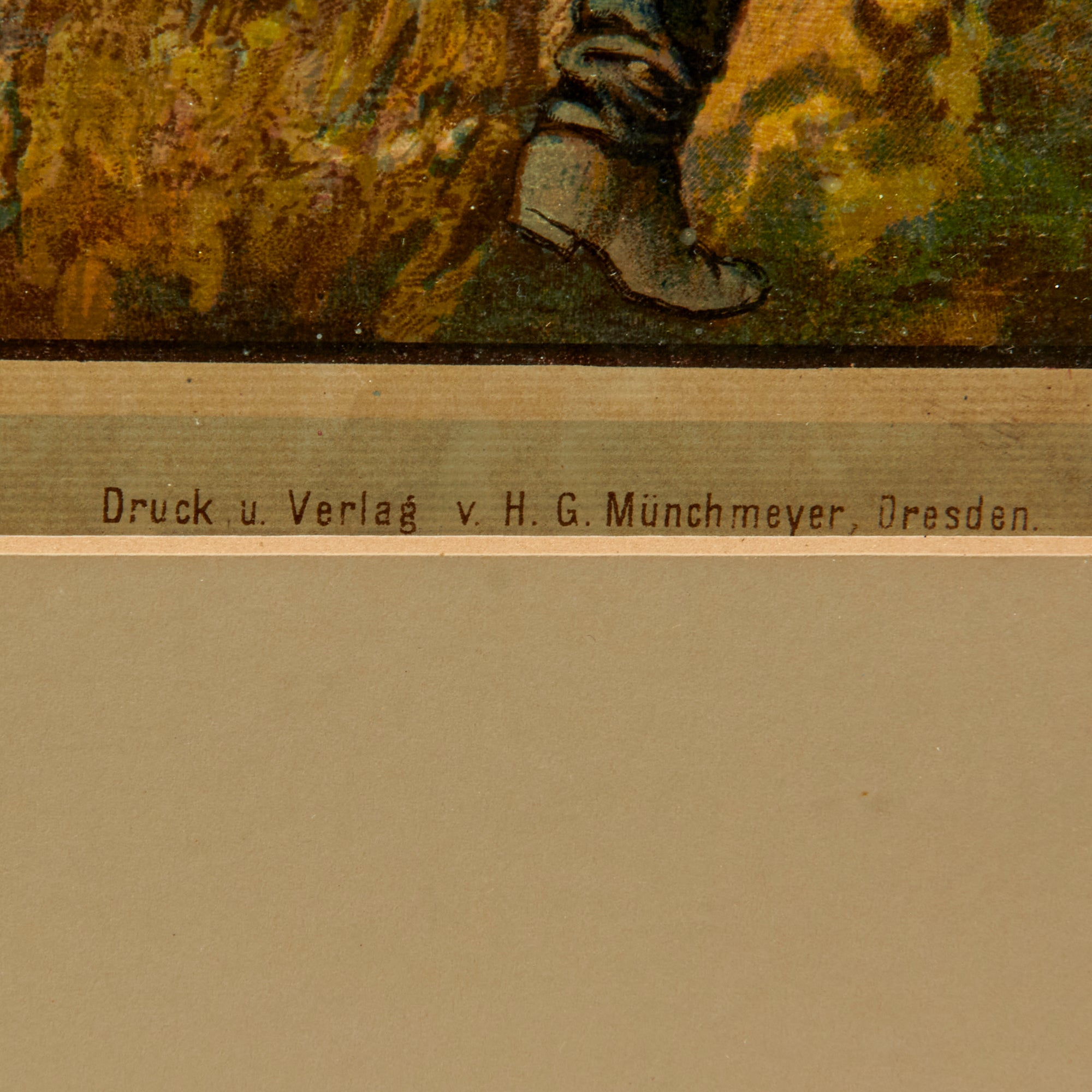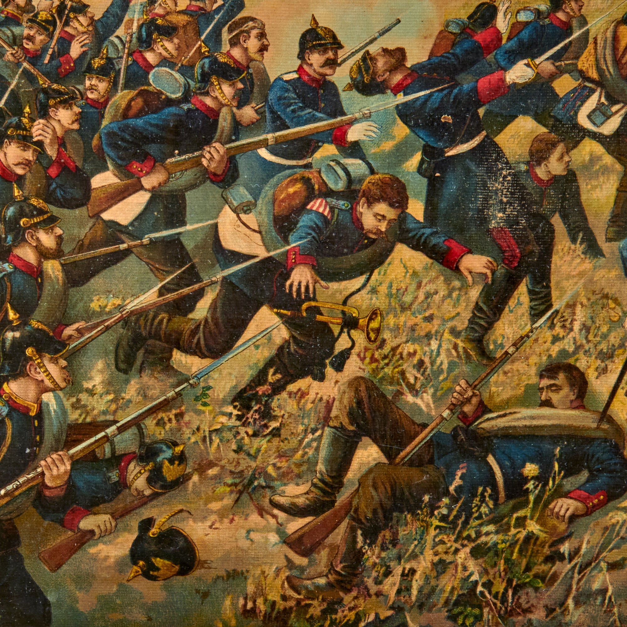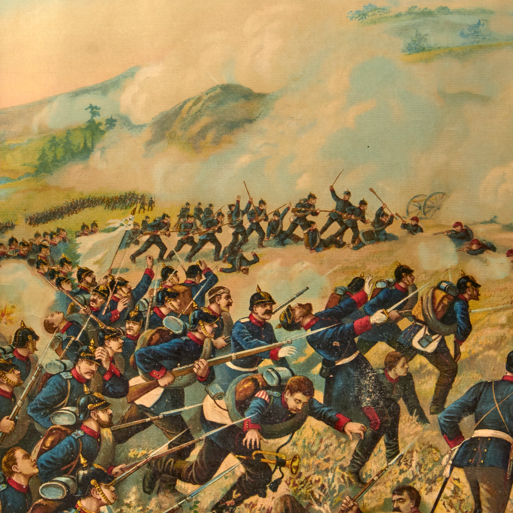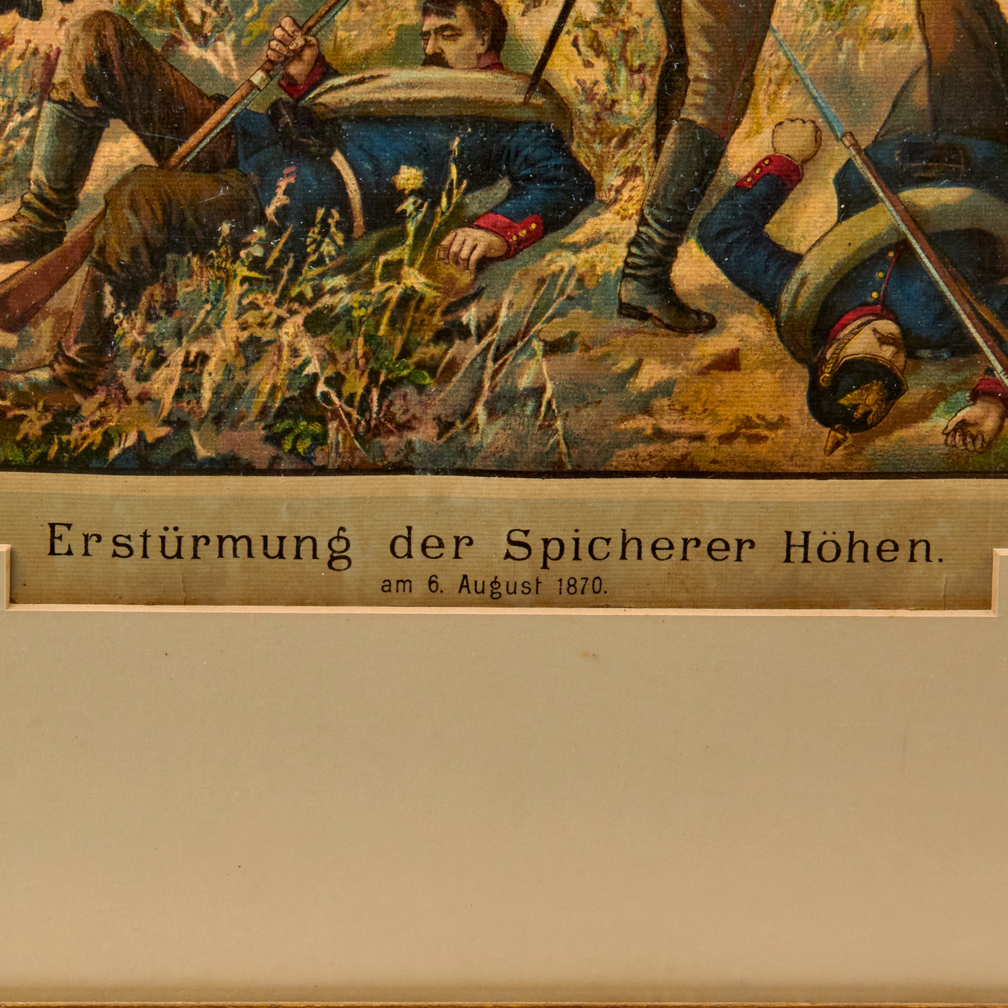 This is a great period print titled Erstürmung der Spicherer Höhen am 6. August 1870, or "The Storming of Spicheren Heights August 6th, 1870". The print is framed and measures 26 3/4 x 29 ¾”. It’s in great shape overall with the hanging wire still retained.