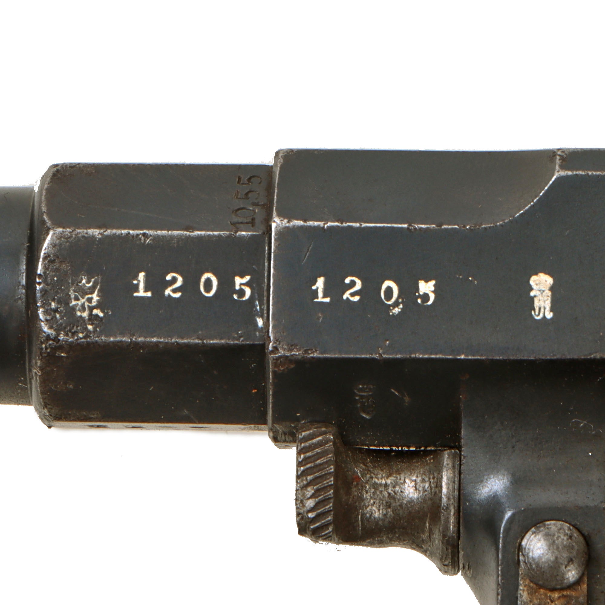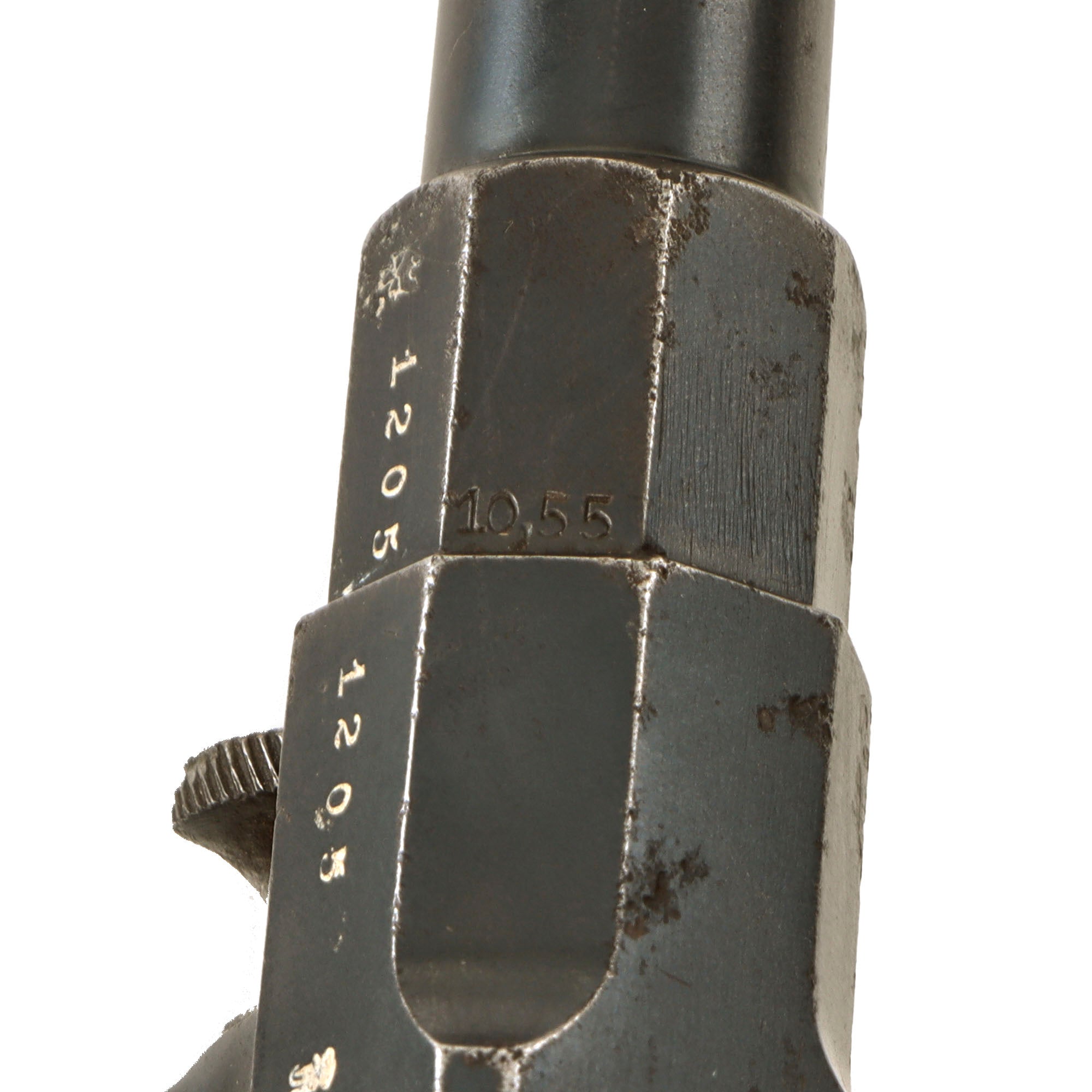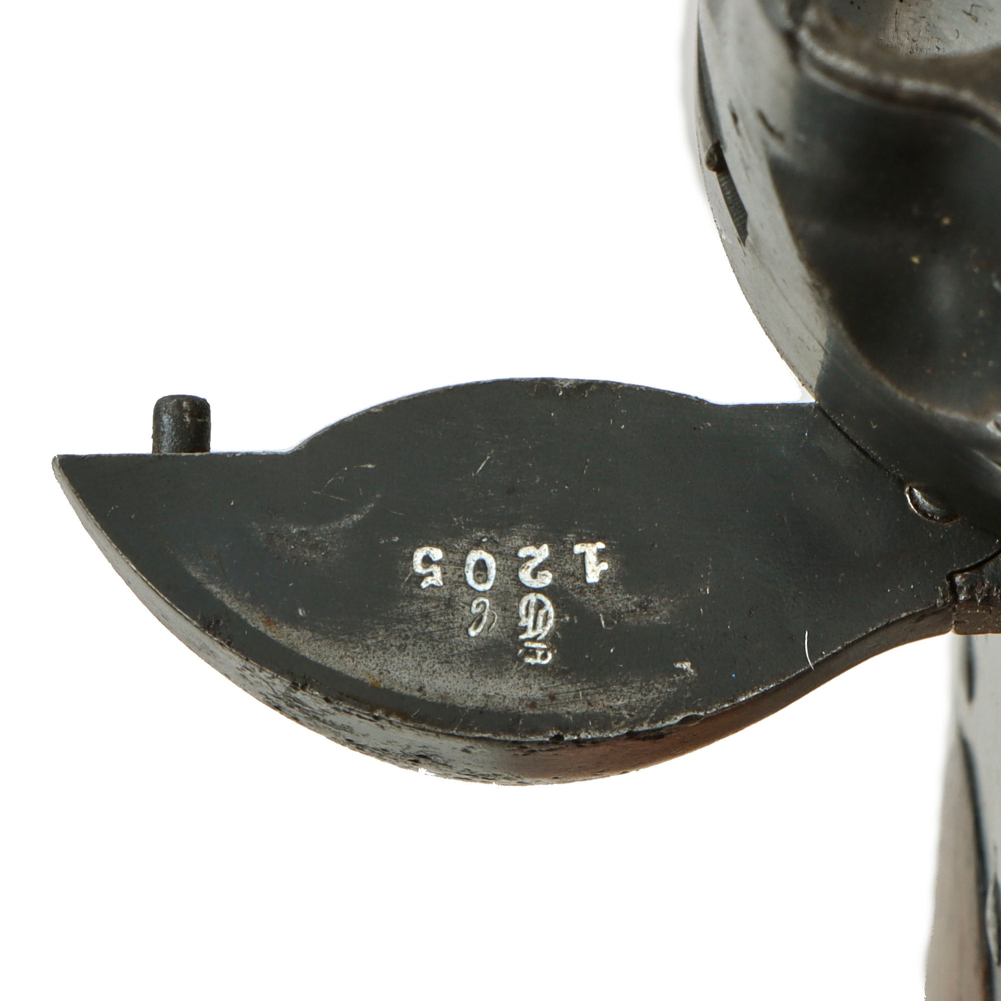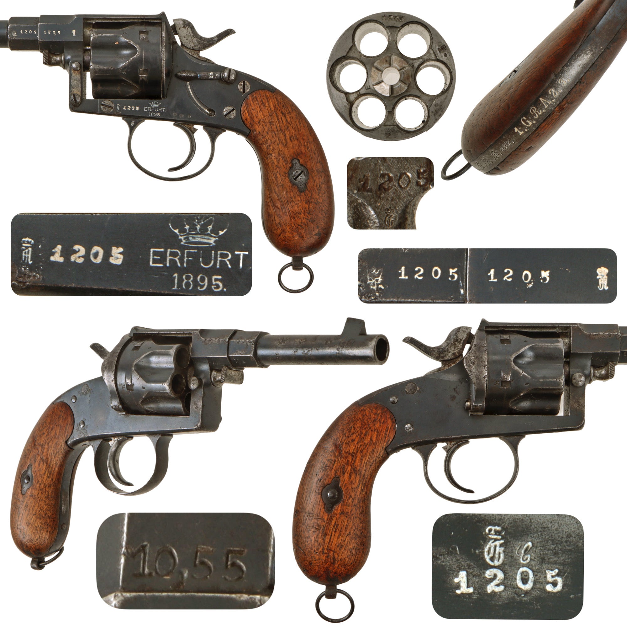 There were made by various different makers, and this example is marked somewhat faintly with CROWN / ERFURT / 1895 on the left frame, indicating manufacture at the Imperial Arsenal in Erfurt Germany during 1895. This marking and many others have been highlighted in white to make them easier to see. Our Revolver also bears ALL MATCHING serial number 1205 on all major parts of the gun, even on the inside of the grip scales and the small screws (05). It is also marked with the caliber 10,55 on the left side of the barrel, and there are various proof marks on the different parts of the gun, including multiple German Imperial Eagle proofs.