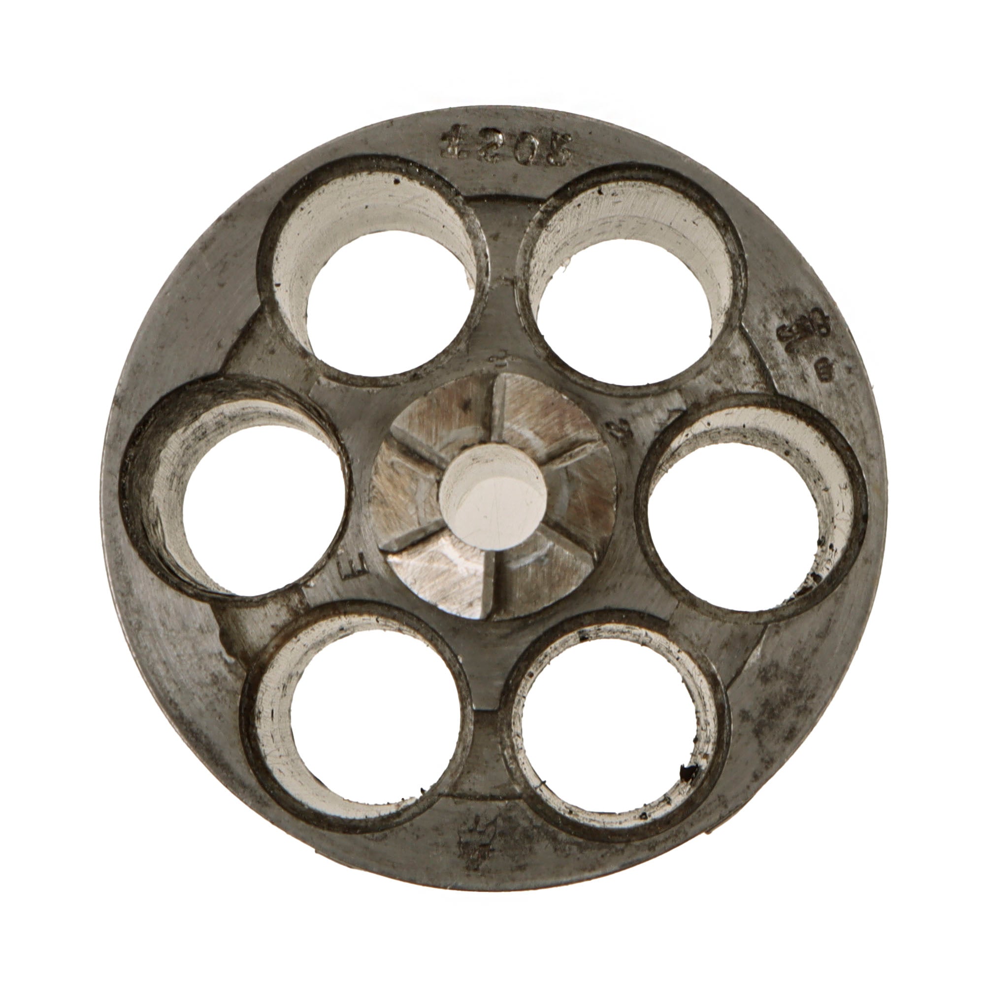 The revolver functions well, with no mechanical deficiencies to note. It indexes perfectly with a strong cylinder lockup and crisp dry fire, and the safety is fully functional, holding the hammer at the fully forward or safety positions when set. The cylinder base pin can be removed when the securing latch is pushed in from the right side, allowing the cylinder to be removed for cleaning. The loading gate is present and fully functional as well. We checked the bore, and it is in very good condition. showing a mostly bright finish with clear lands and grooves. There is a bit of wear, and some small spots of past fouling and oxidation, now cleaned away. It looks like it only saw light use, and was relatively well maintained.