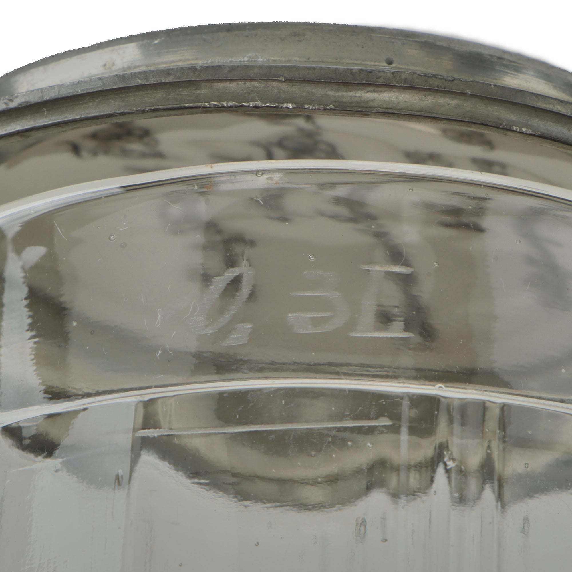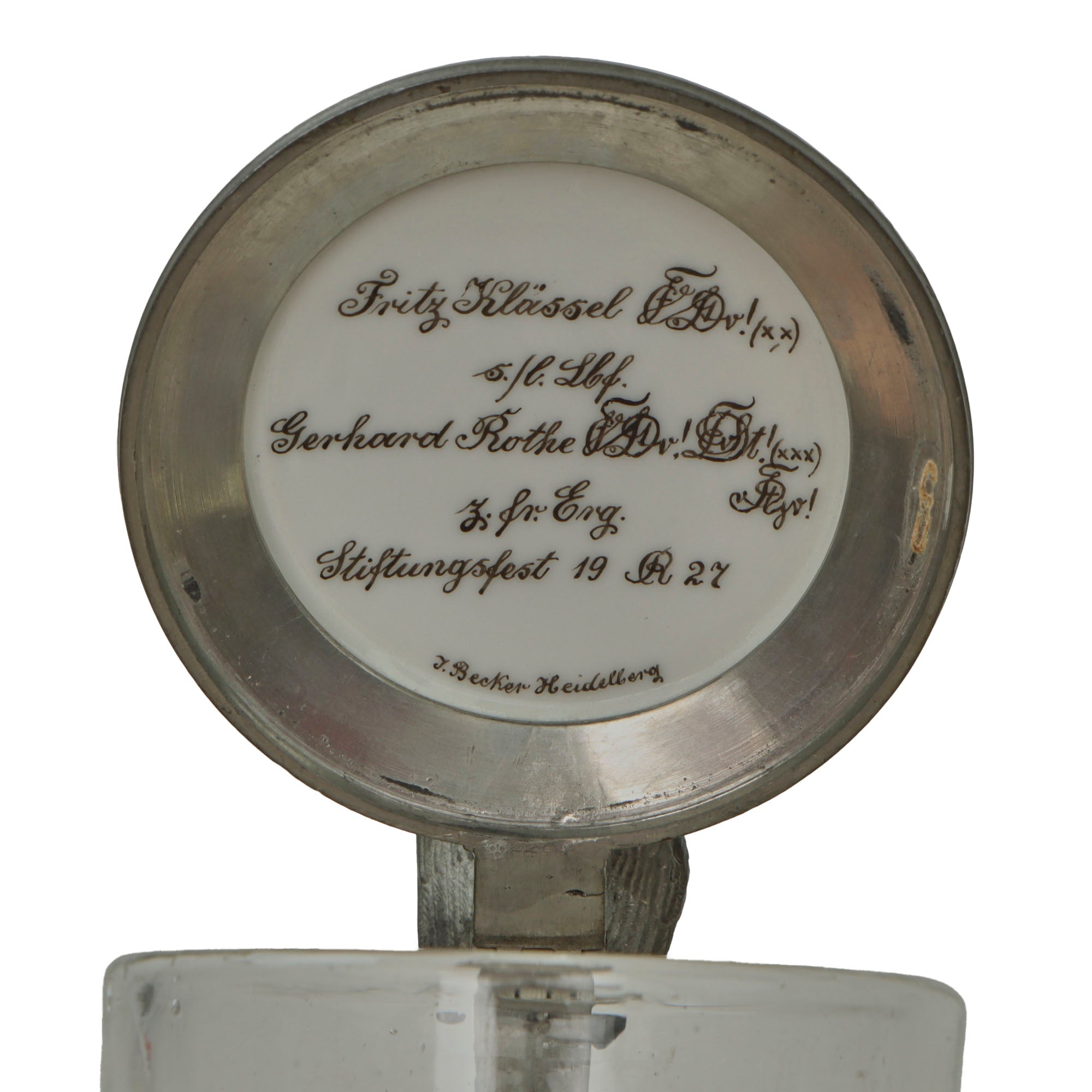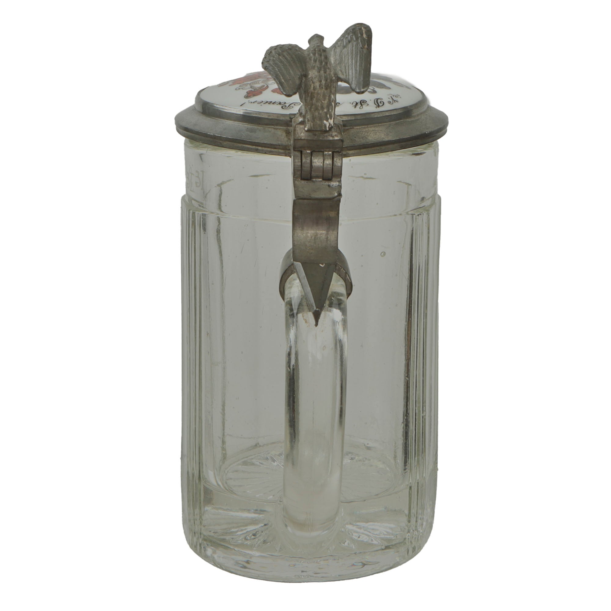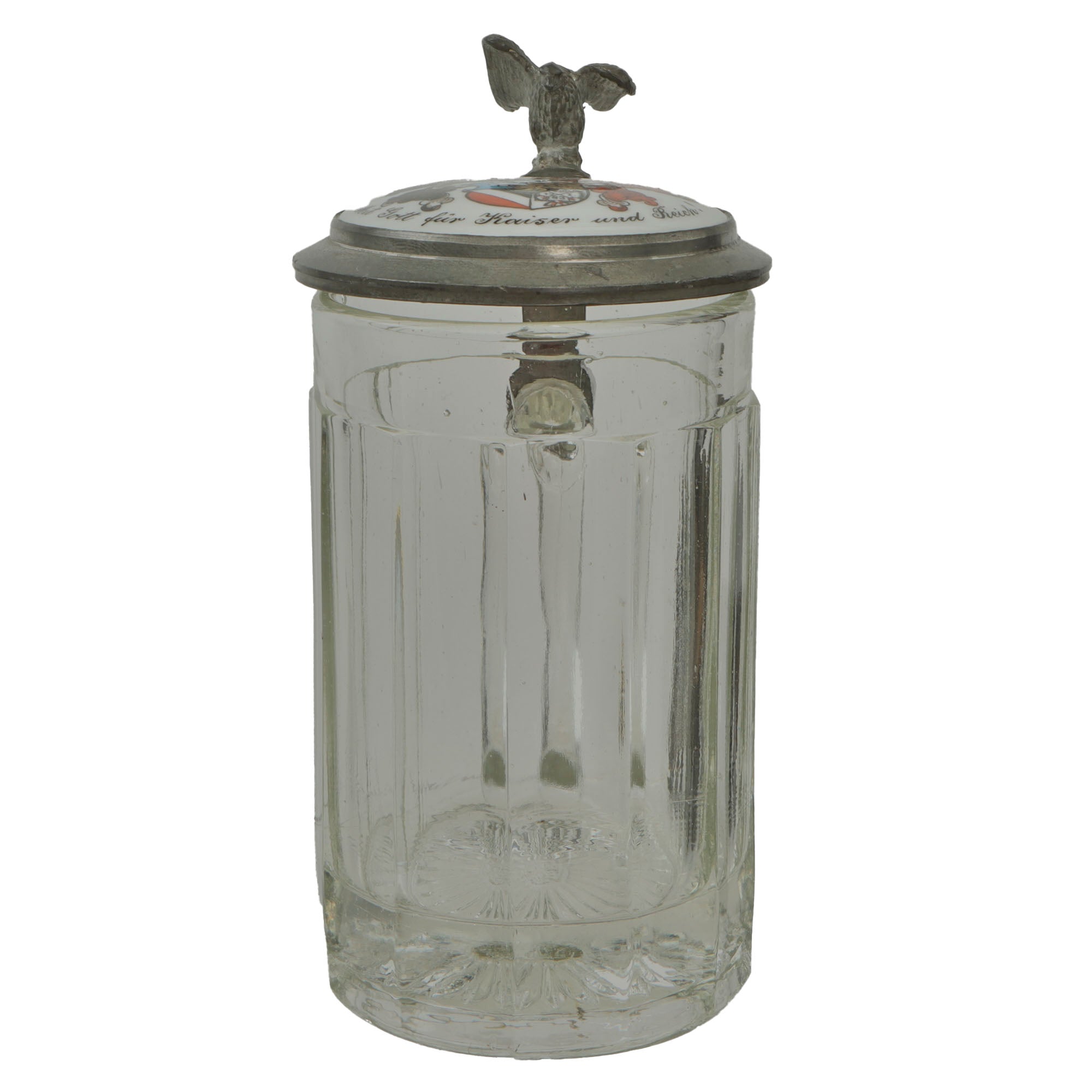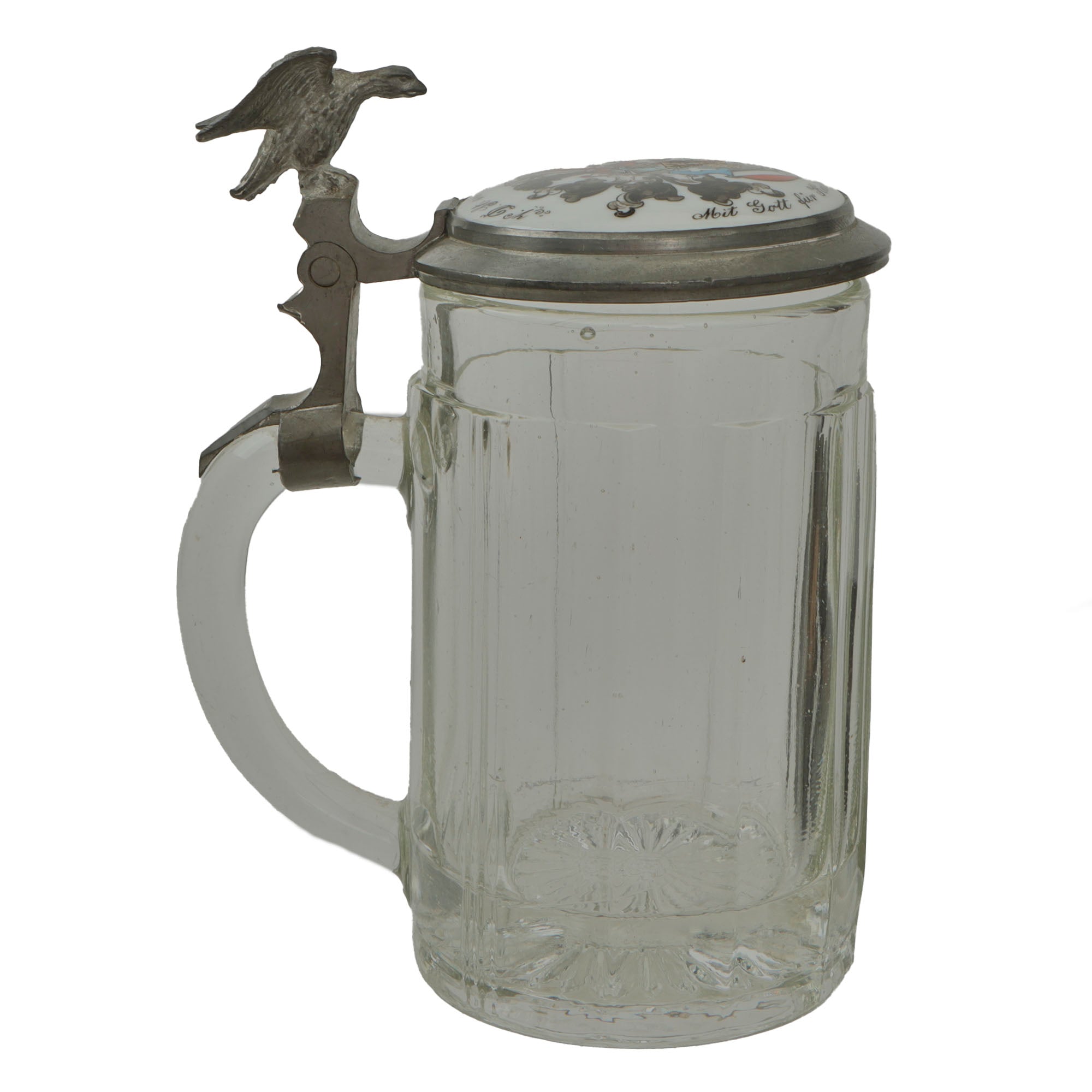 This is a lovely high quality Imperial German glass beer stein. The body is not decorated, but is capacity marked 0.3 L for 1/3rd of a Liter. The lid of the stein has a hand-painted ceramic disc in the center, the top of which is painted with a German coat of arms under a Knight’s helmet and plumes. The text surrounding this reads: