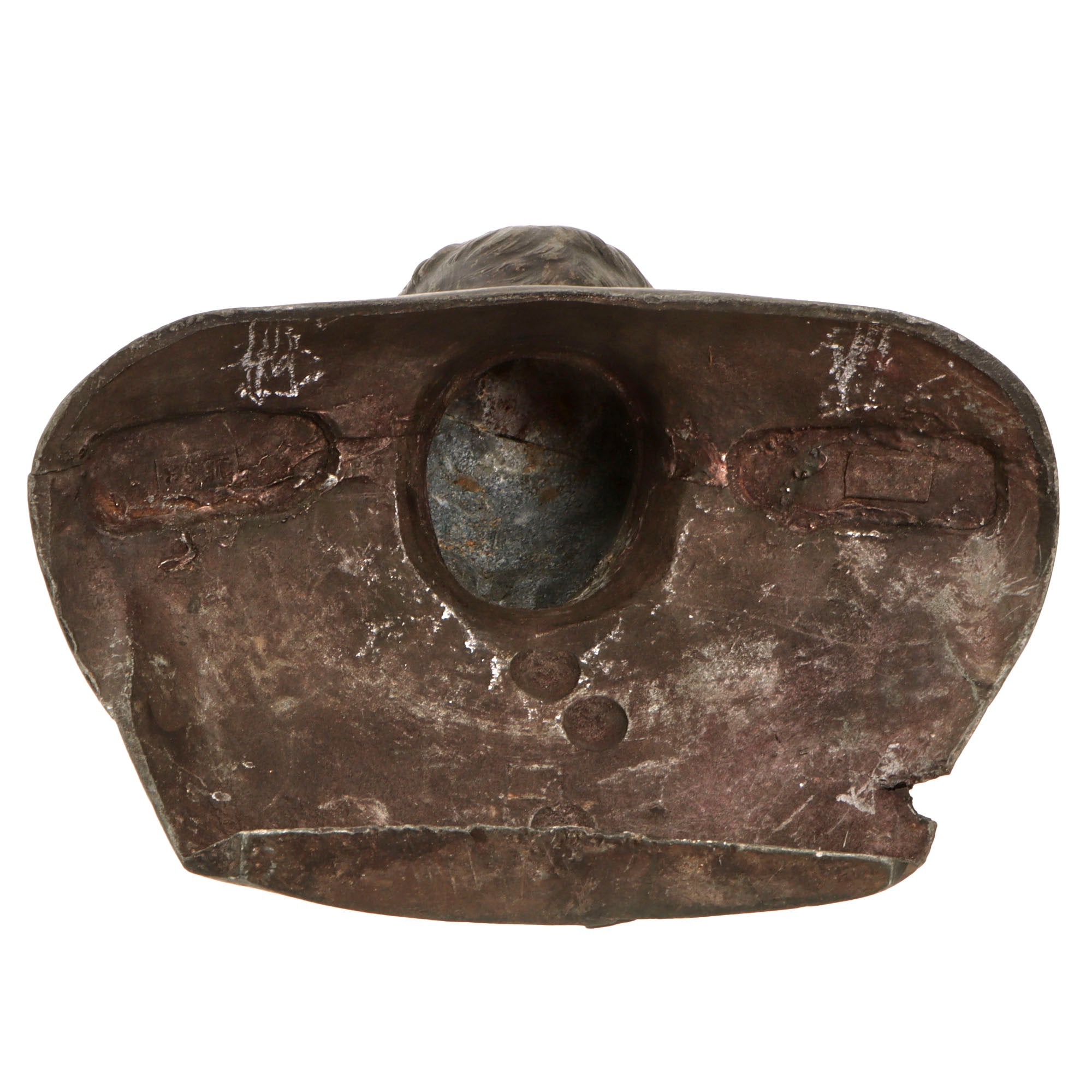 This is an outstanding bronze or steel bust of Frederick III, German Emperor The bust measures 6 ⅜” tall, 5” wide, and 8” long. Frederick’s iconic beard is well-retained, and he wears the 1870 Iron Cross along with the Pour le Mérite. The underside of the bust is embossed 1563, likely the model number. There is some damage as shown, with a bit of metal missing from the right side of his chest and some cracks in other places.