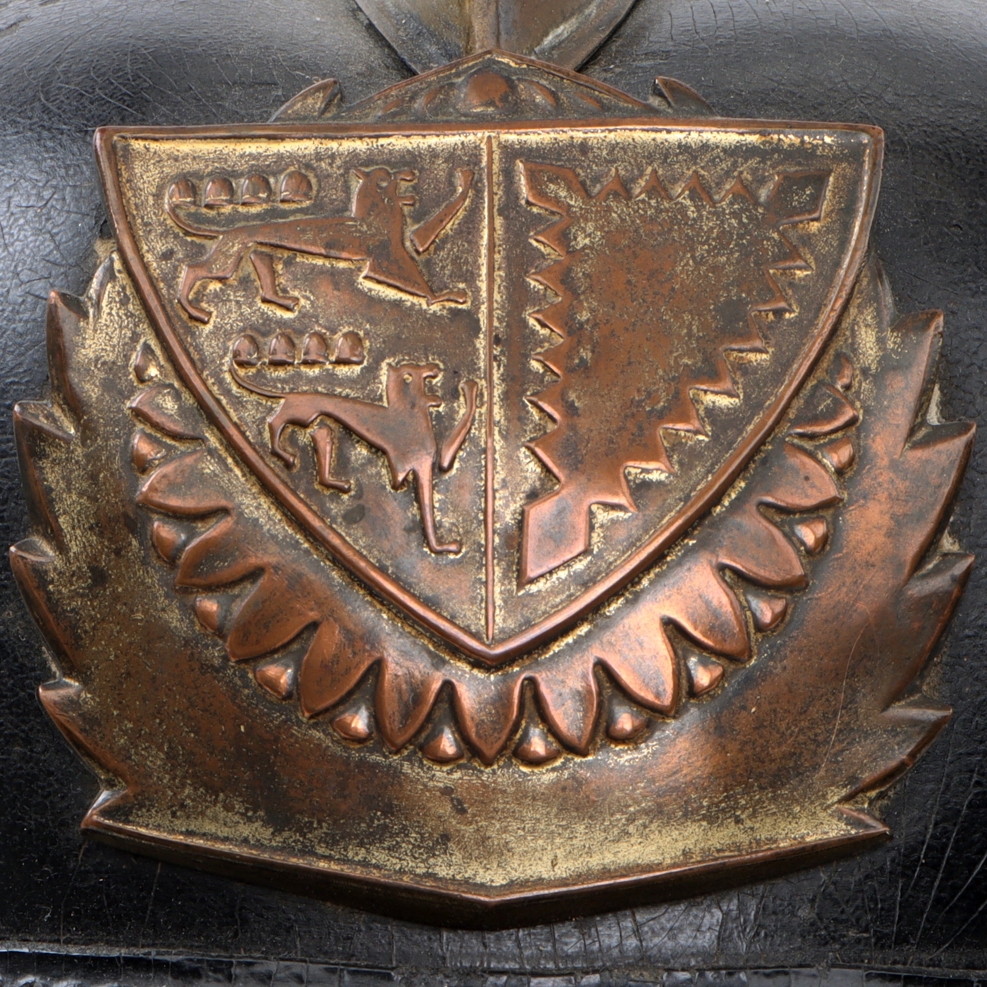 Original Item: Only One Available. This is a very good condition, turn of the century pickelhaube-style German Fire helmet, with a boiled leather body, brass front plate (wappen), brass central comb, and brass fittings. The central plate has a shield featuring the Coat of Arms for the German state of Schleswig-Holstein. Contrary to the hopes of German Schleswig-Holsteiners, the area did not gain its independence, but was annexed as a province of Prussia in 1867. Also following the Austro-Prussian War in 1866, section five of the Peace of Prague stipulated that the people of Northern Schleswig would be consulted in a referendum on whether to remain under Prussian rule or return to Danish rule. This condition, however, was never fulfilled by Prussia. During the decades of Prussian rule within the German Empire, authorities attempted a Germanisation policy in the northern part of Schleswig, which remained predominantly Danish. The period also meant increased industrialization of Schleswig-Holstein and the use of Kiel and Flensburg as important Imperial German Navy locations. The northernmost part and west coast of the province saw a wave of emigration to America, while some Danes of North Schleswig emigrated to Denmark.