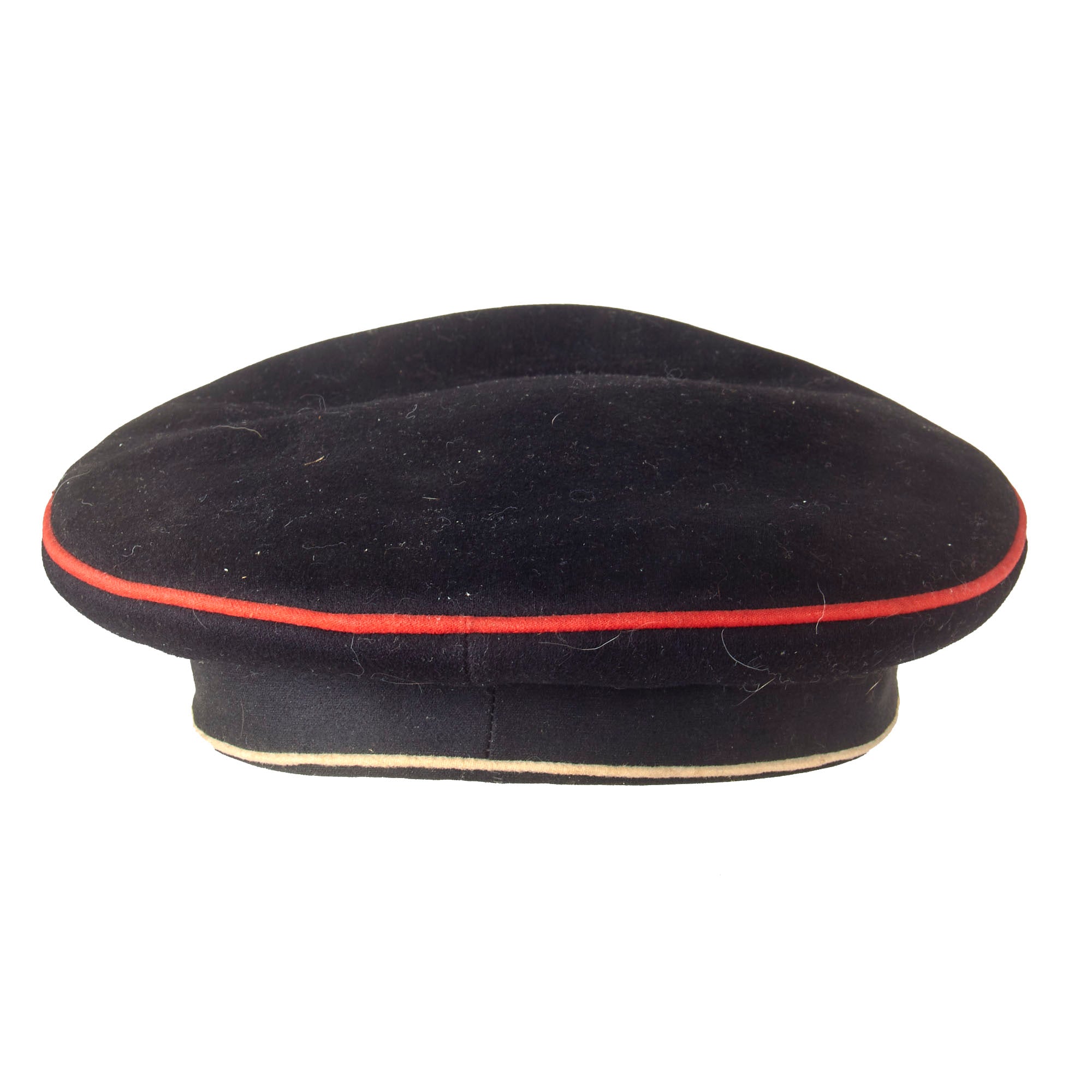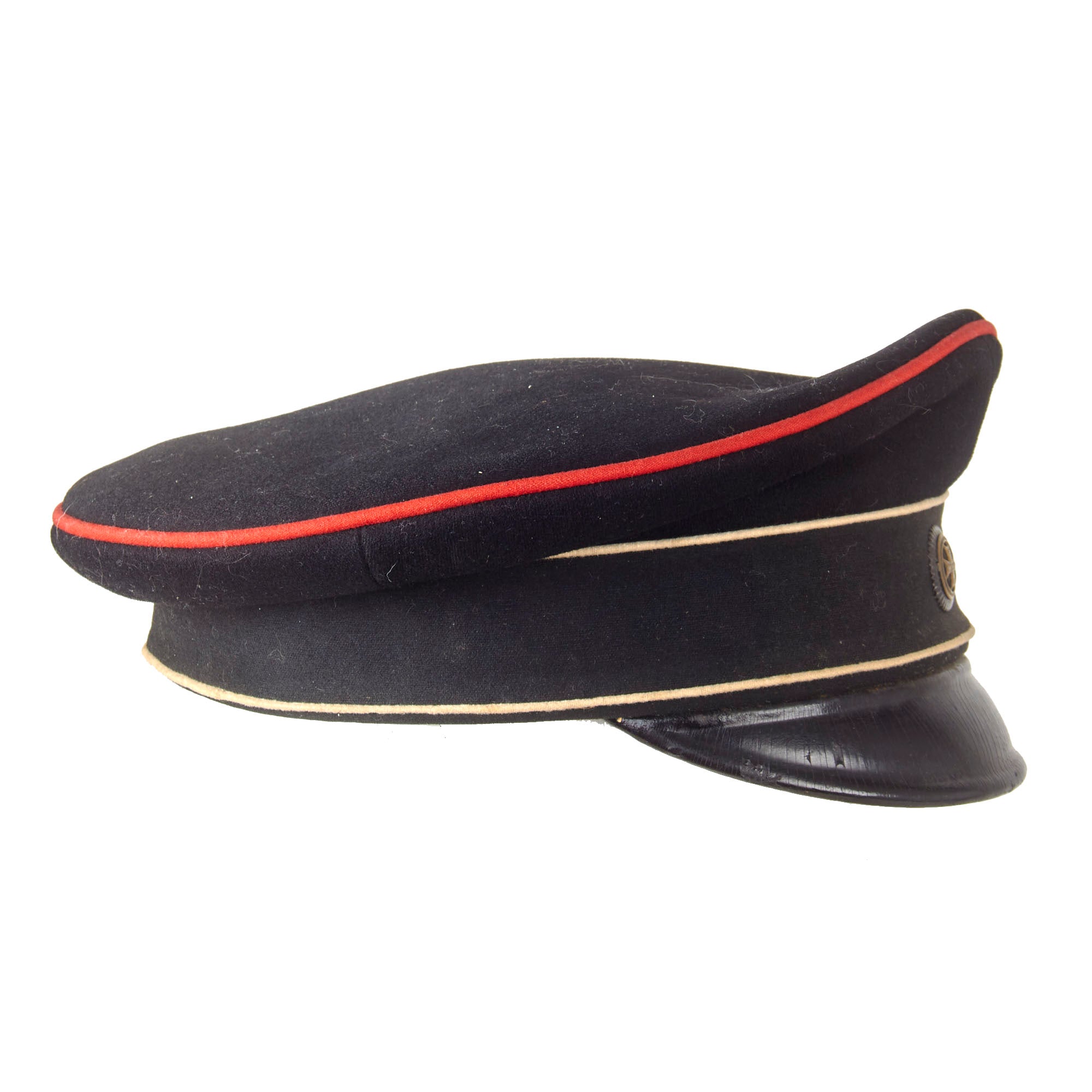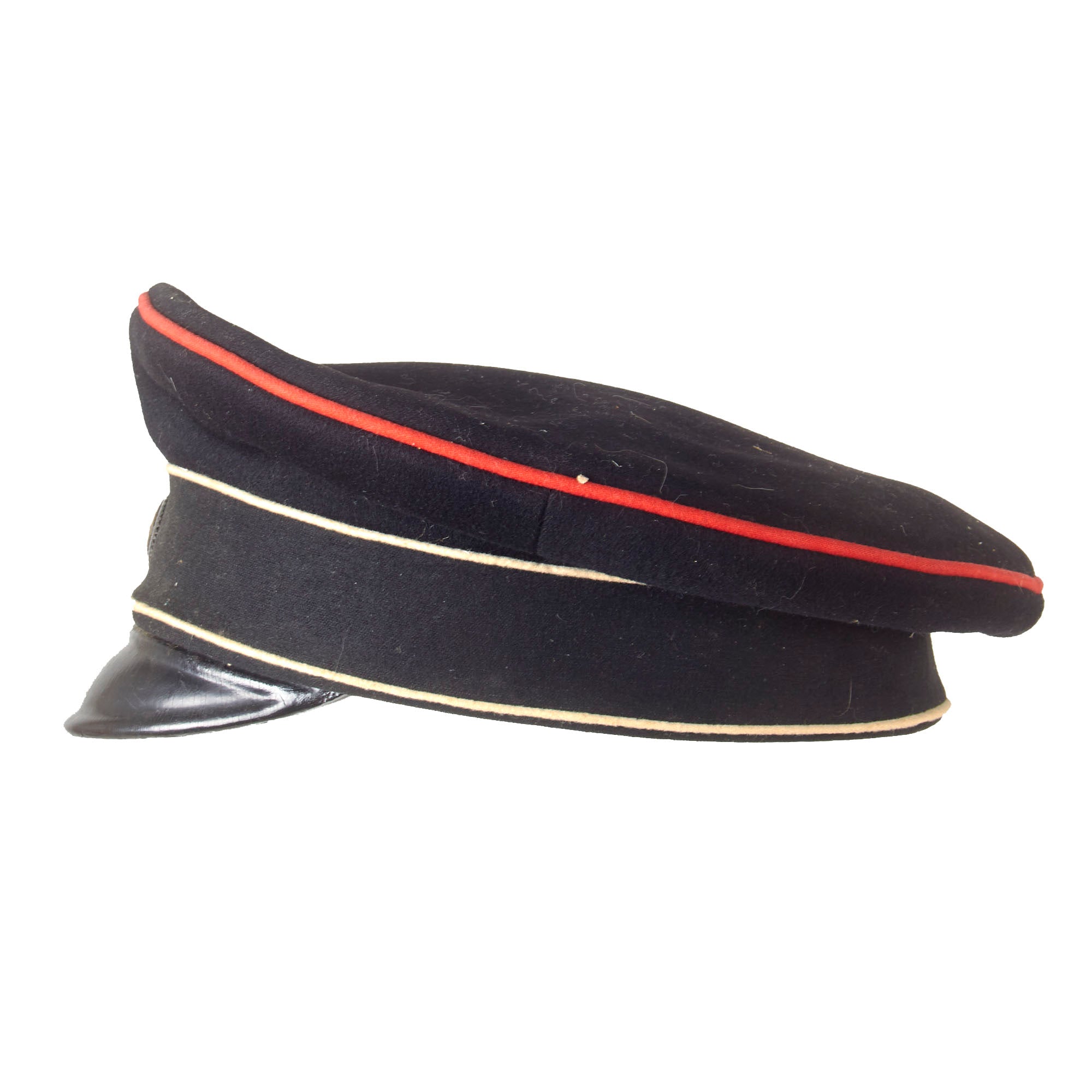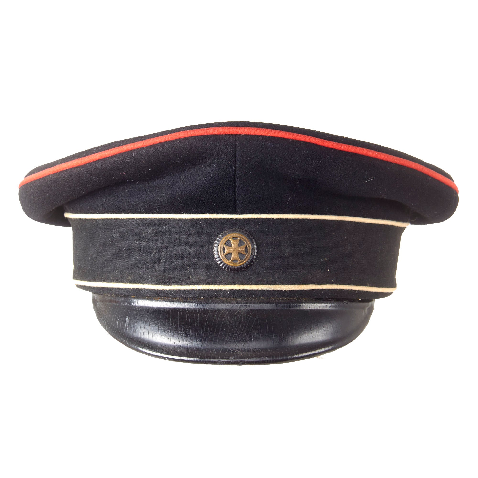 Original Item: Only One Available. This is a very nice example of an Imperial German NCO Visor Cap (Schirmmütze), in black with red piping. The cap is constructed of black wool, and has Ponceaurot (poppy red) piping, and a Schwarz (black) velvet cap band. The front of the cap has a Prussian cockade with a Landwehr cross inside, denoting issue to the Reserve (Landwehr). The front of the cap has a nice visor, which looks to be made of vulcanfibre, but it is partially detached at one end.