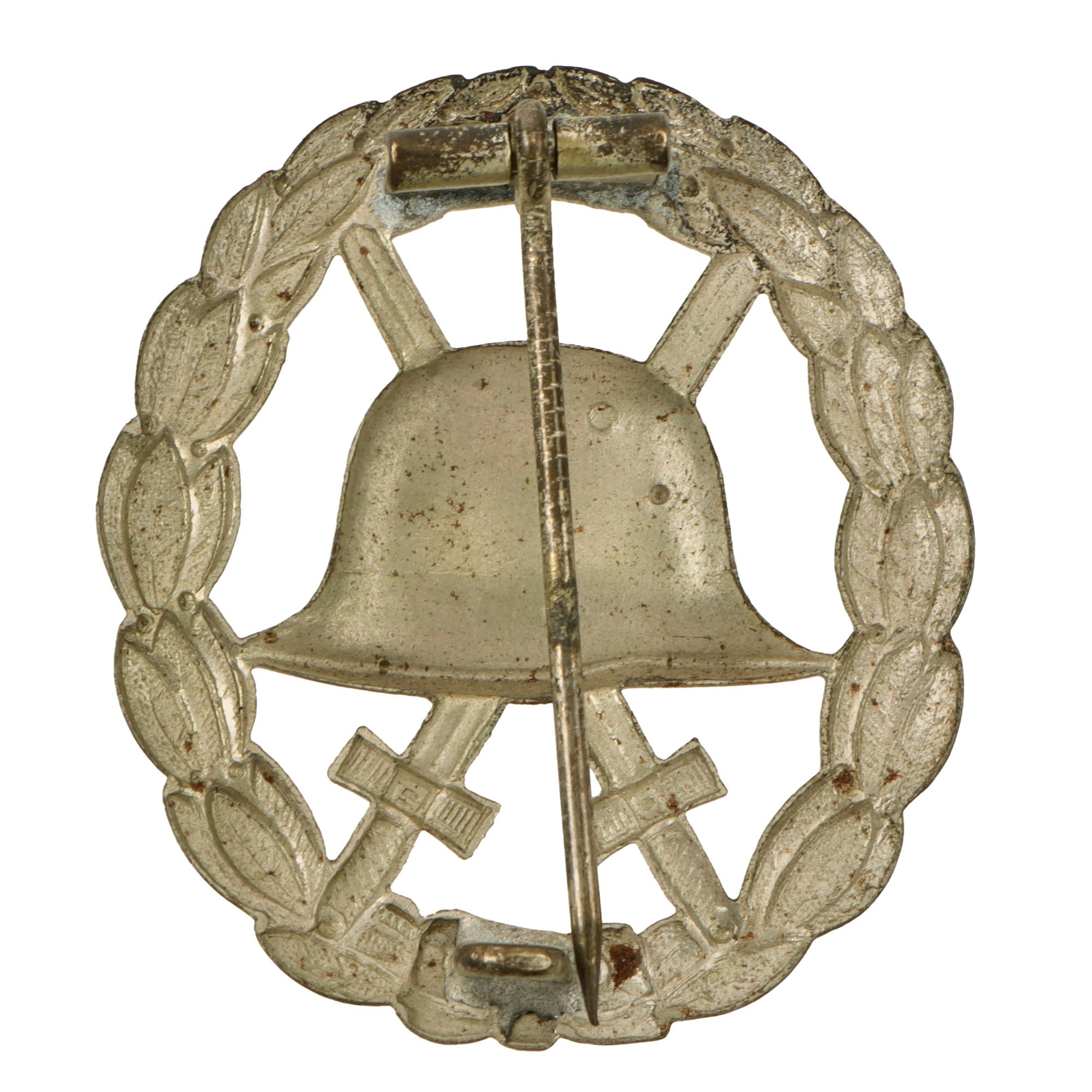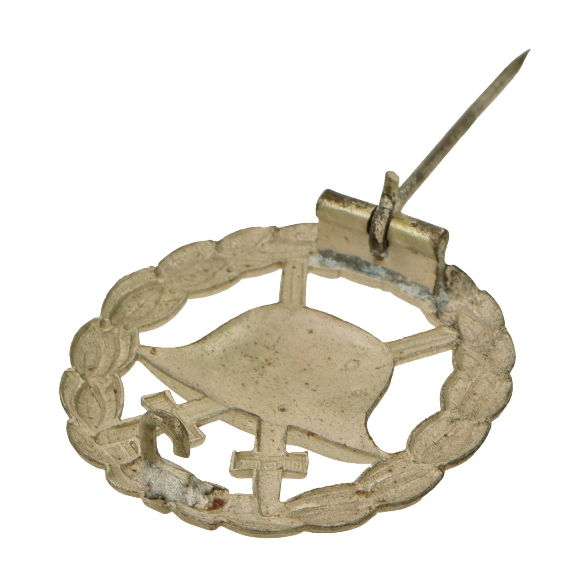 Like all of the "cut-out" badges, it made of steel. The pin, hinge and catch are all intact and in well-working condition. The silver wash on this example is partially retained, with some loss in the wreath and helmet with oxidation on one of the swords. Most of these badges over time completely lose the wash and turn gray. The back of these examples were not heavily plated, and there is some oxidation on the back. The badge measures approximately 1.75 inches high by 1.5 inches wide.
