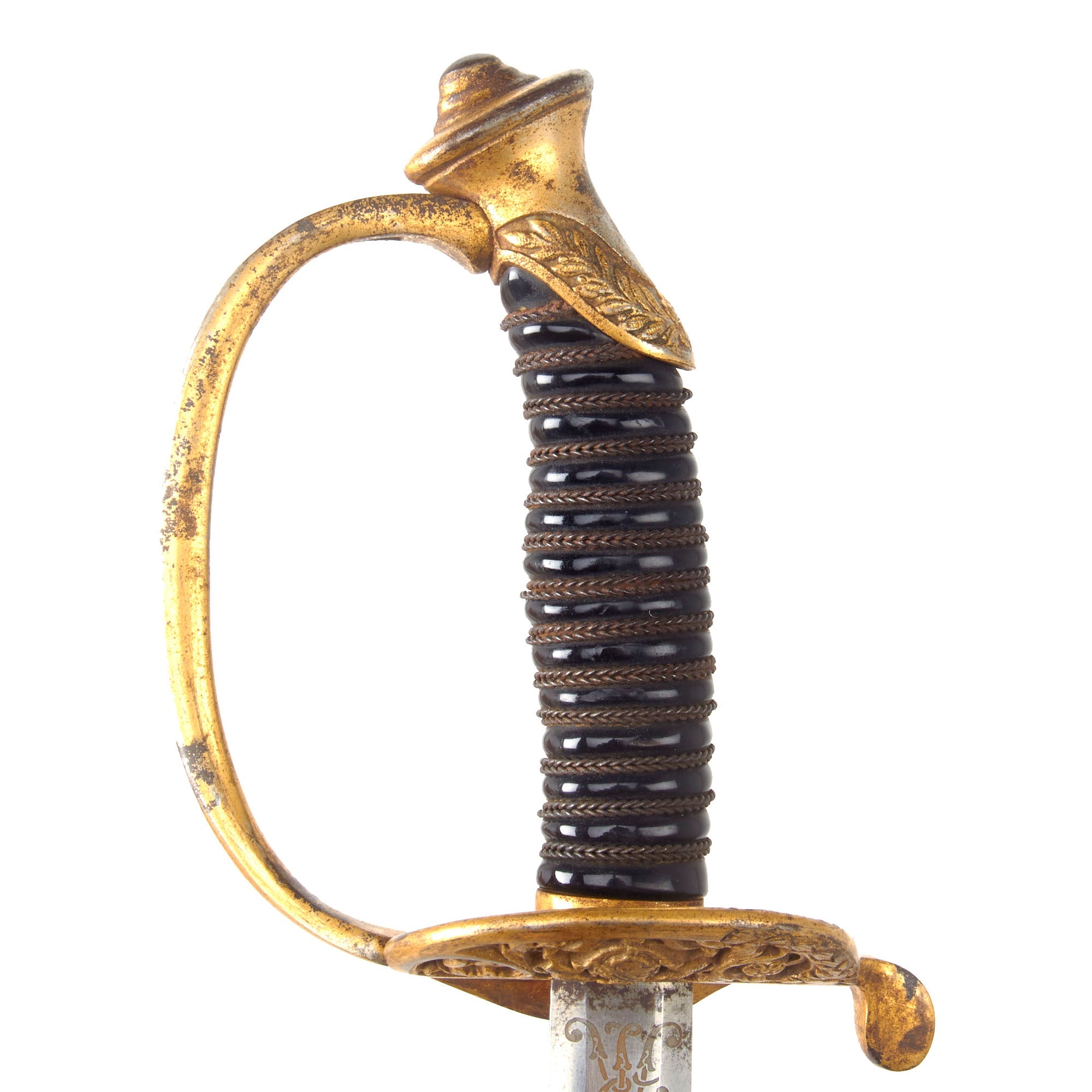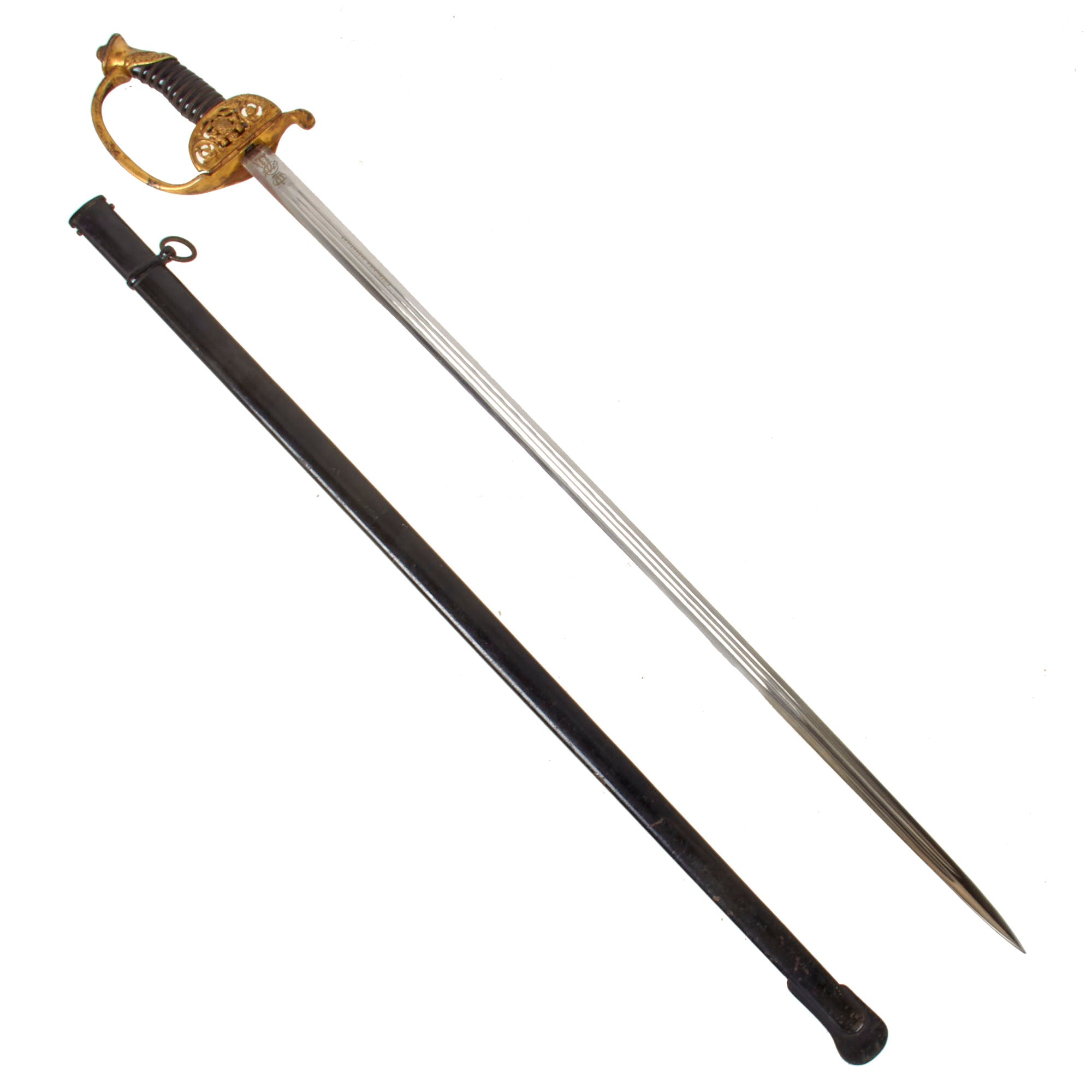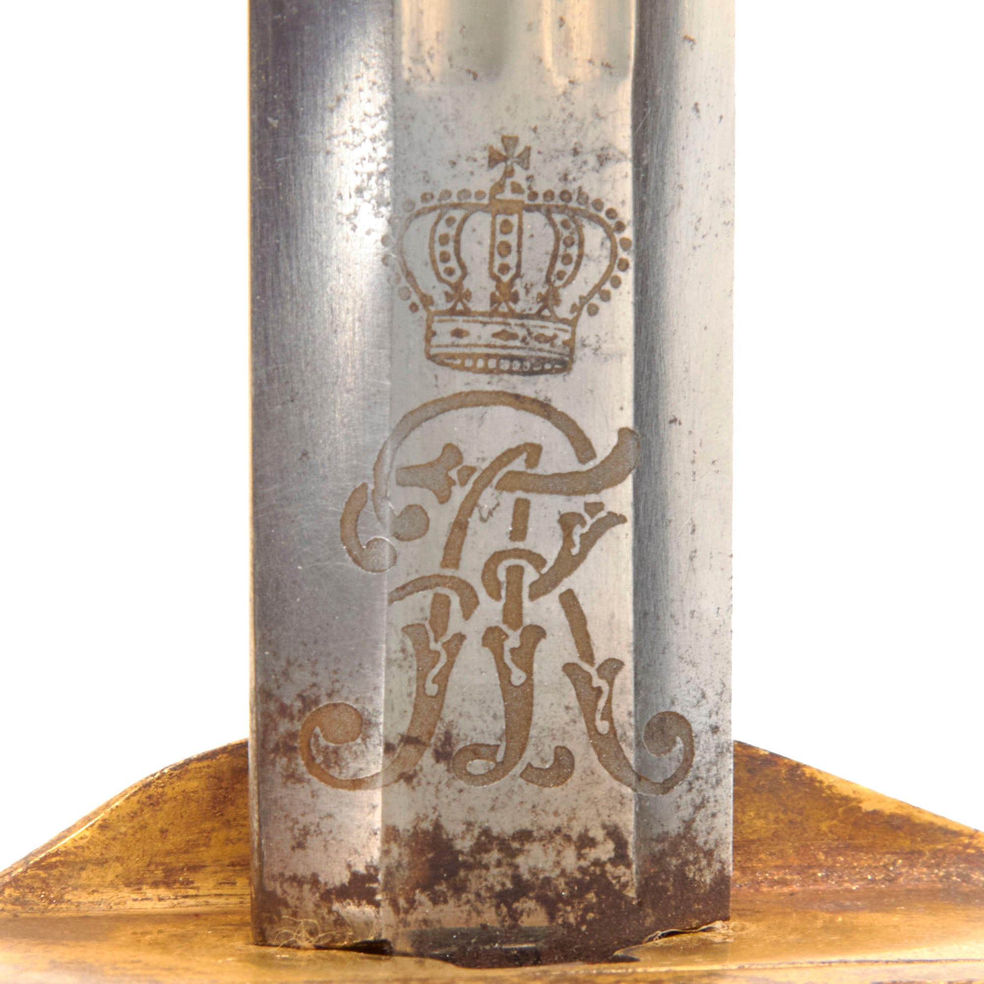 The nickel plated double edged straight blade is in good condition and has a triple fuller on each side and is 29 3/8 inches from the spear point to the hilt. The nickel plate is retained very well, with only some light wear from the scabbard, and minor oxidation though it appears that it could clean up nicely. The sword ricasso is etched with a CROWN over an interlocking FA monogram, which is one of the three known types used by Saxon King Frederick Augustus III. He reigned from 1904 until the end of the Monarchy following WWI in 1918. Overall length of the sword is 34 7/8 inches, and the leather blade buffer is missing.