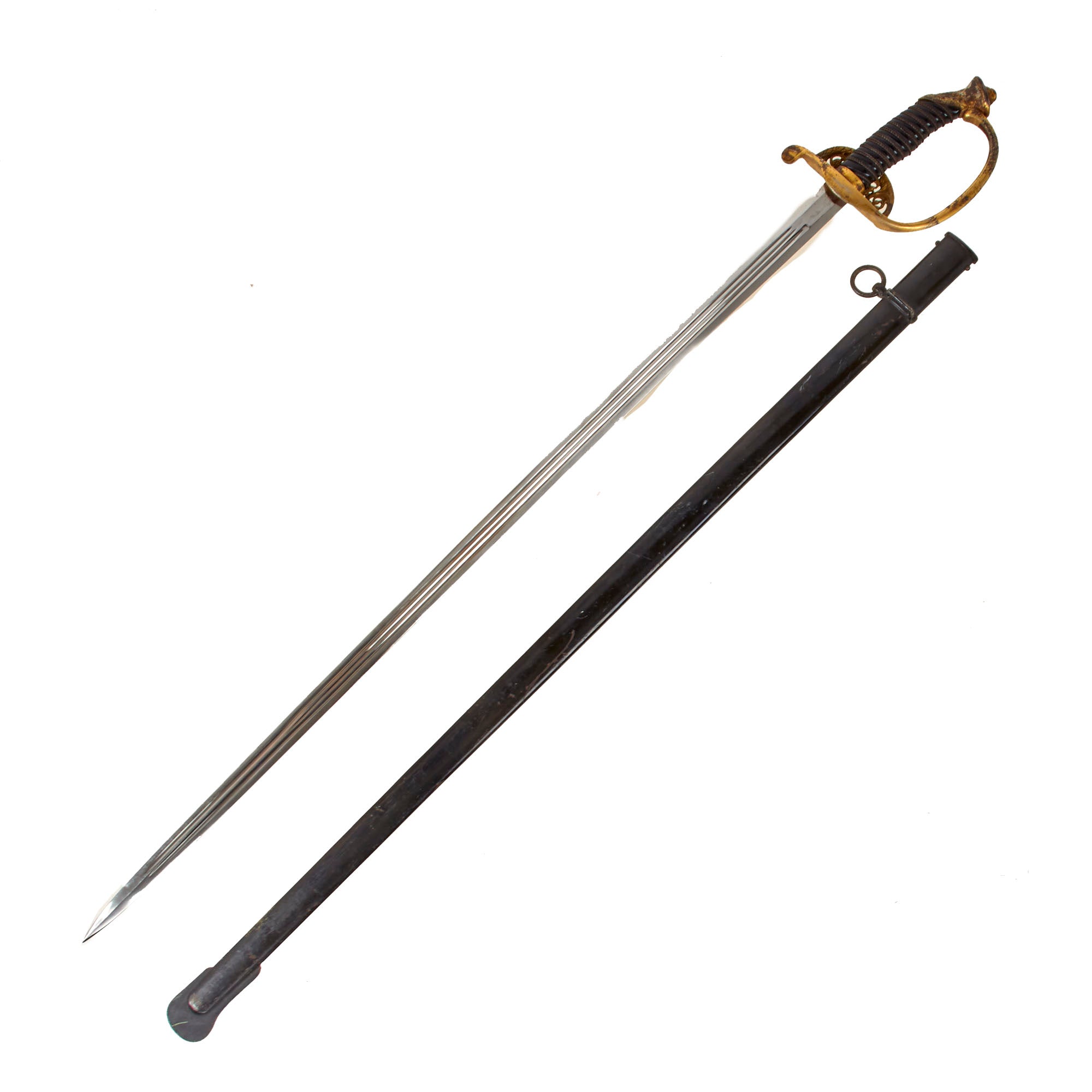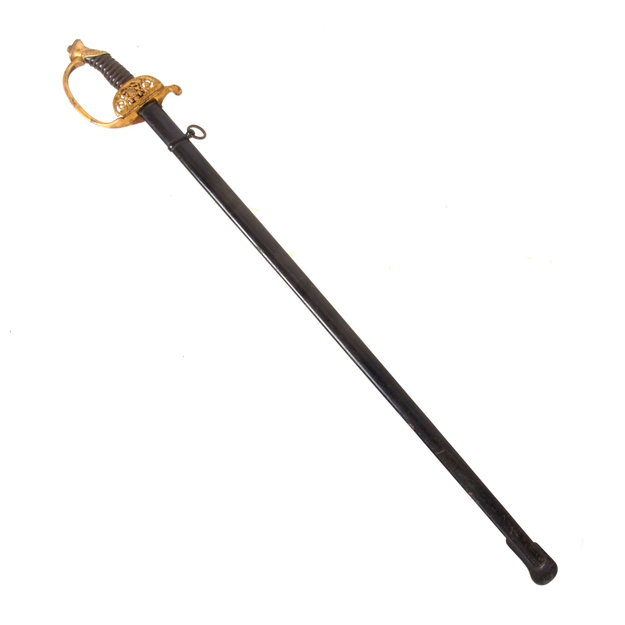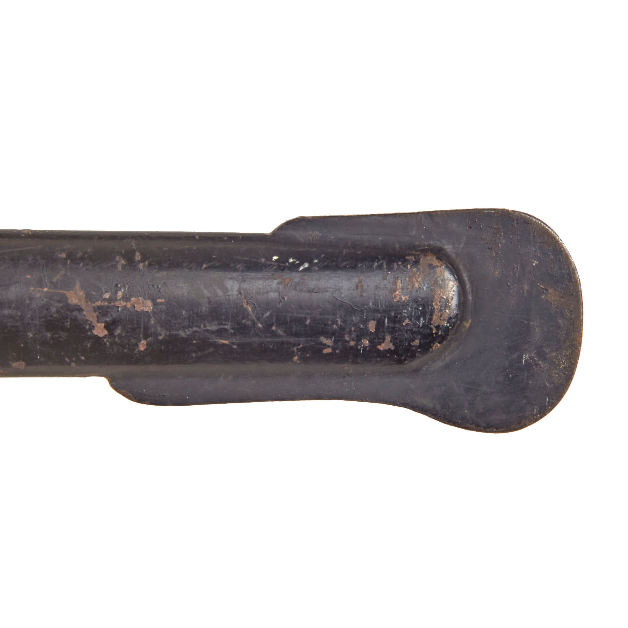 The steel scabbard has a single hanging ring, as the second fitting was for a hook on the hanger. It has the standard black enamel finish, which has worn off in some areas, and the underlying steel has oxidized. The scabbard has some moderate denting but nothing that hinders sheathing.