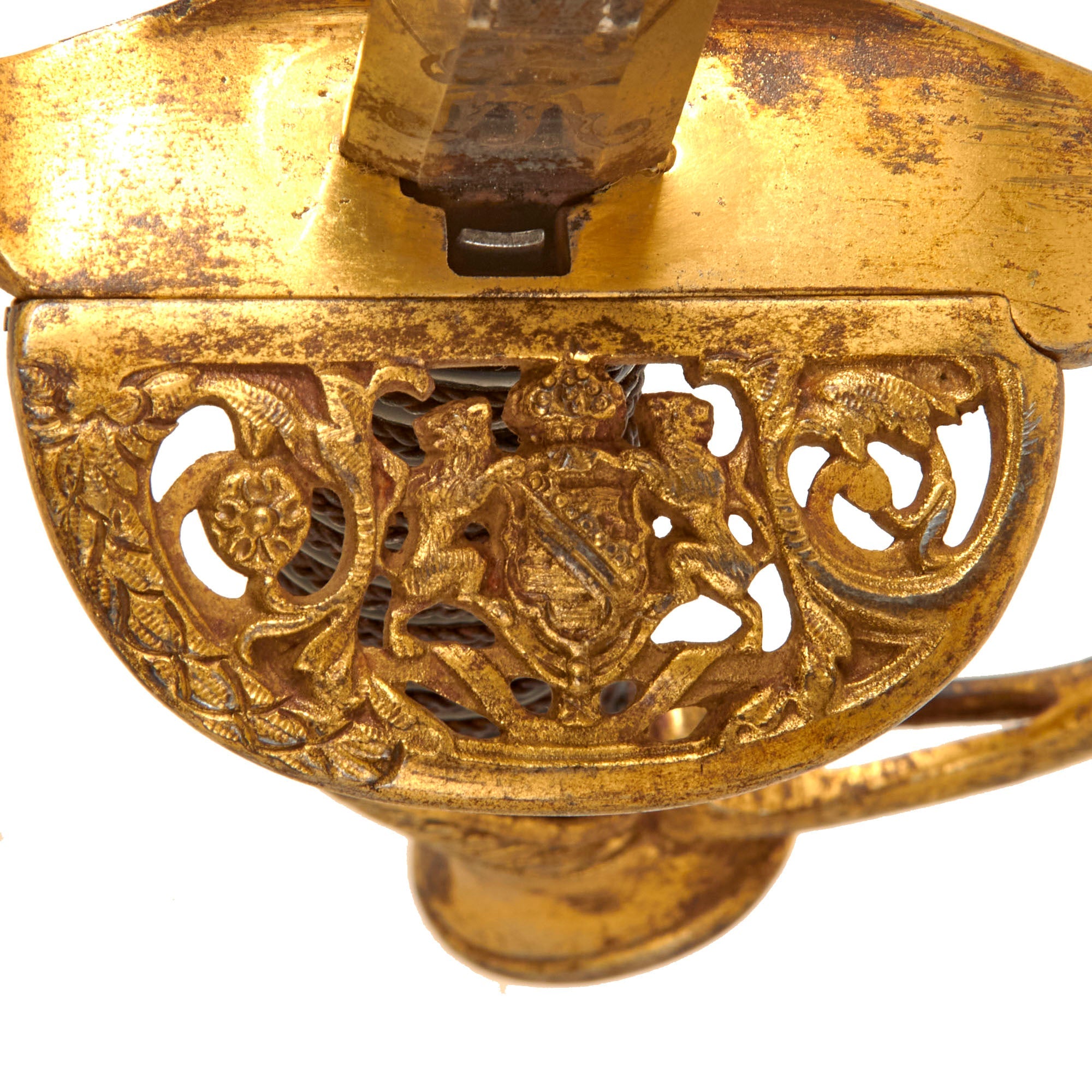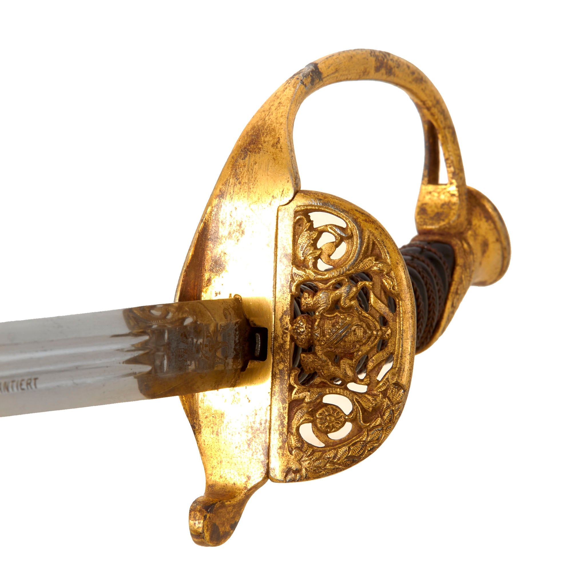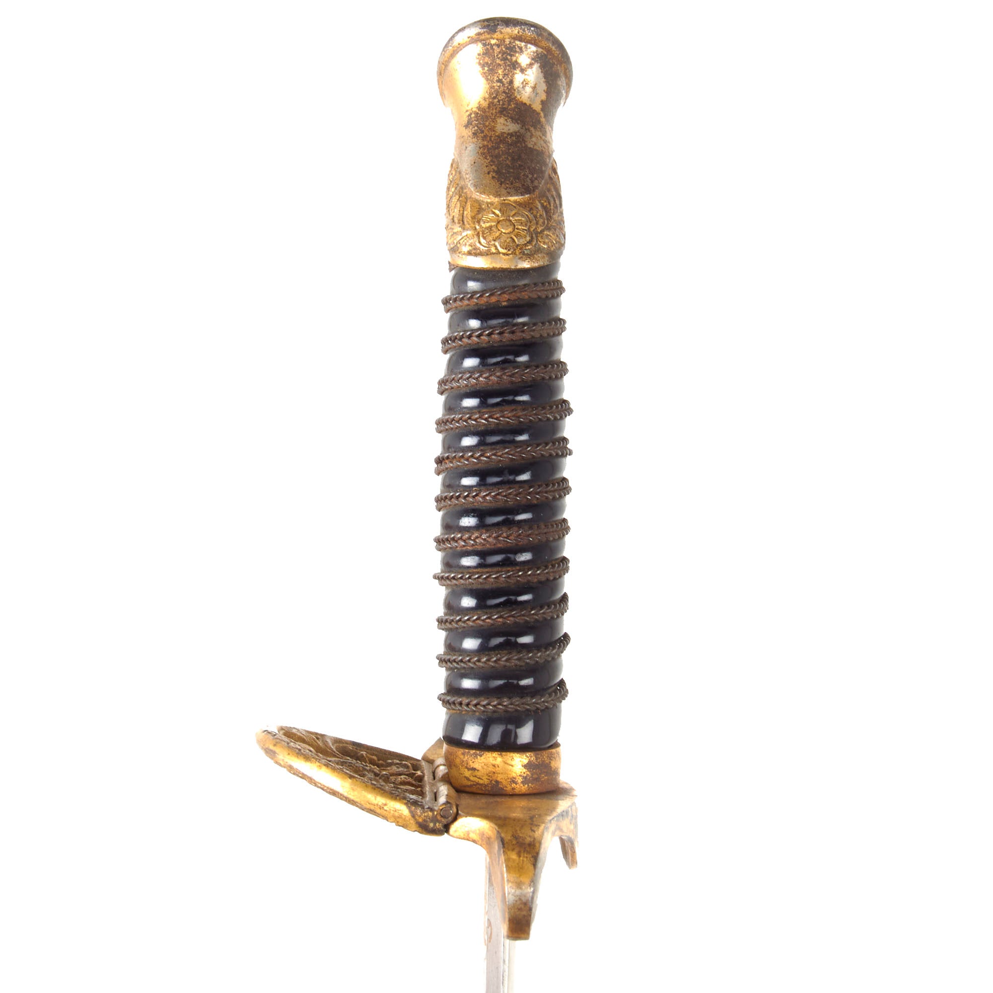 Original Item: Only One Available. This is a very nice Imperial German WWI era dress sword from the Kingdom of Saxony, which was one of the member states of the German empire. Offered in good condition, it features a shape-fold-away guard with the Coat of Arms of the Kingdom of Saxony on it. The grip is brass wire bound over polished celluloid, most likely with wood underneath. The grip is in very good condition, and the hilt is tight to the tang. This model of sword is somewhat similar to the Prussian Model of 1889, but the blade is definitely different. The hilt looks to be made entirely of brass alloy.
