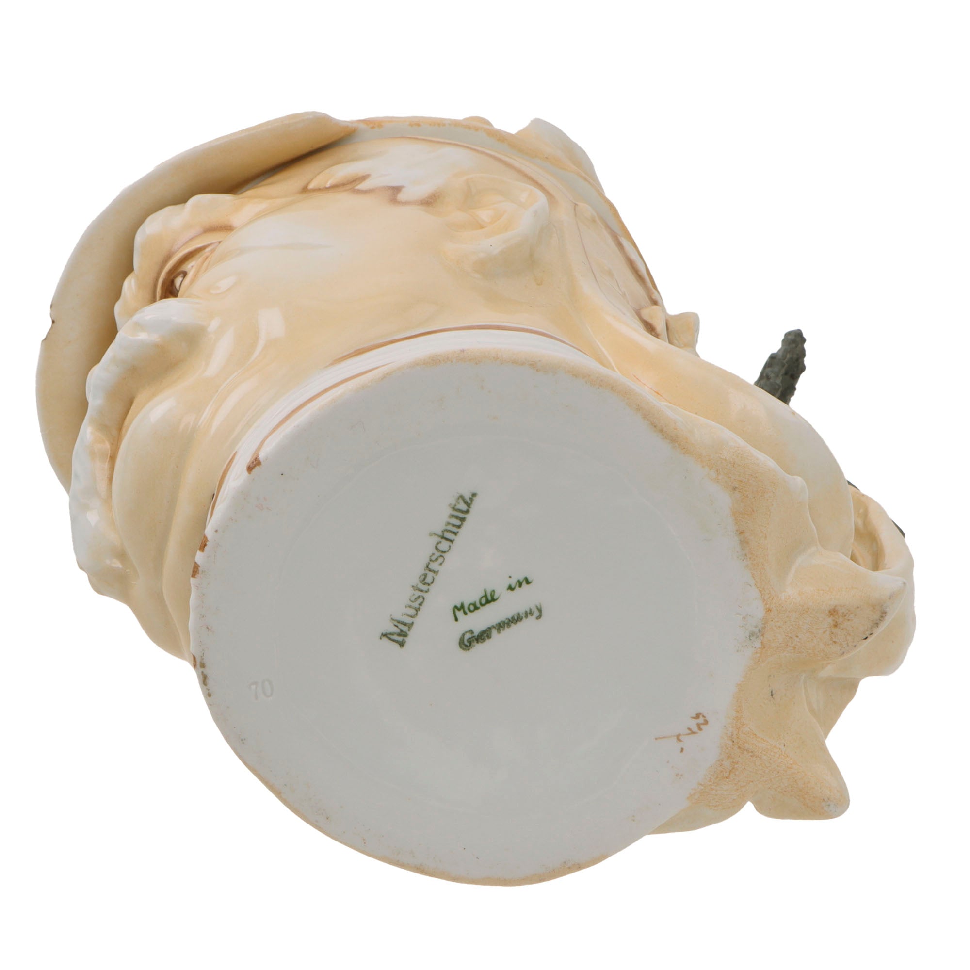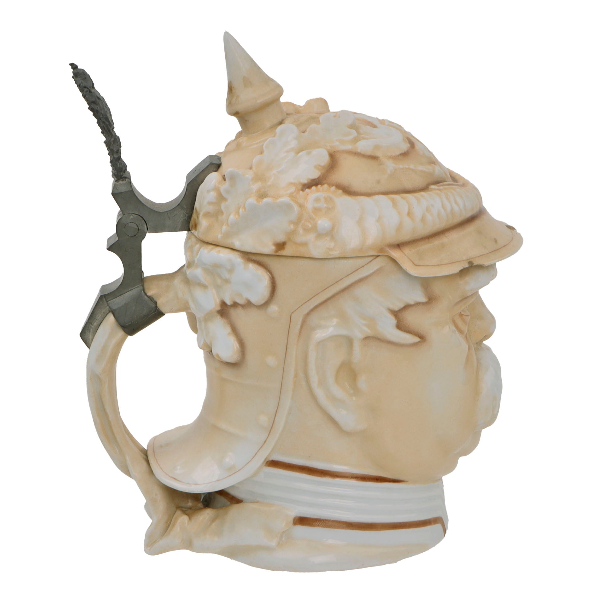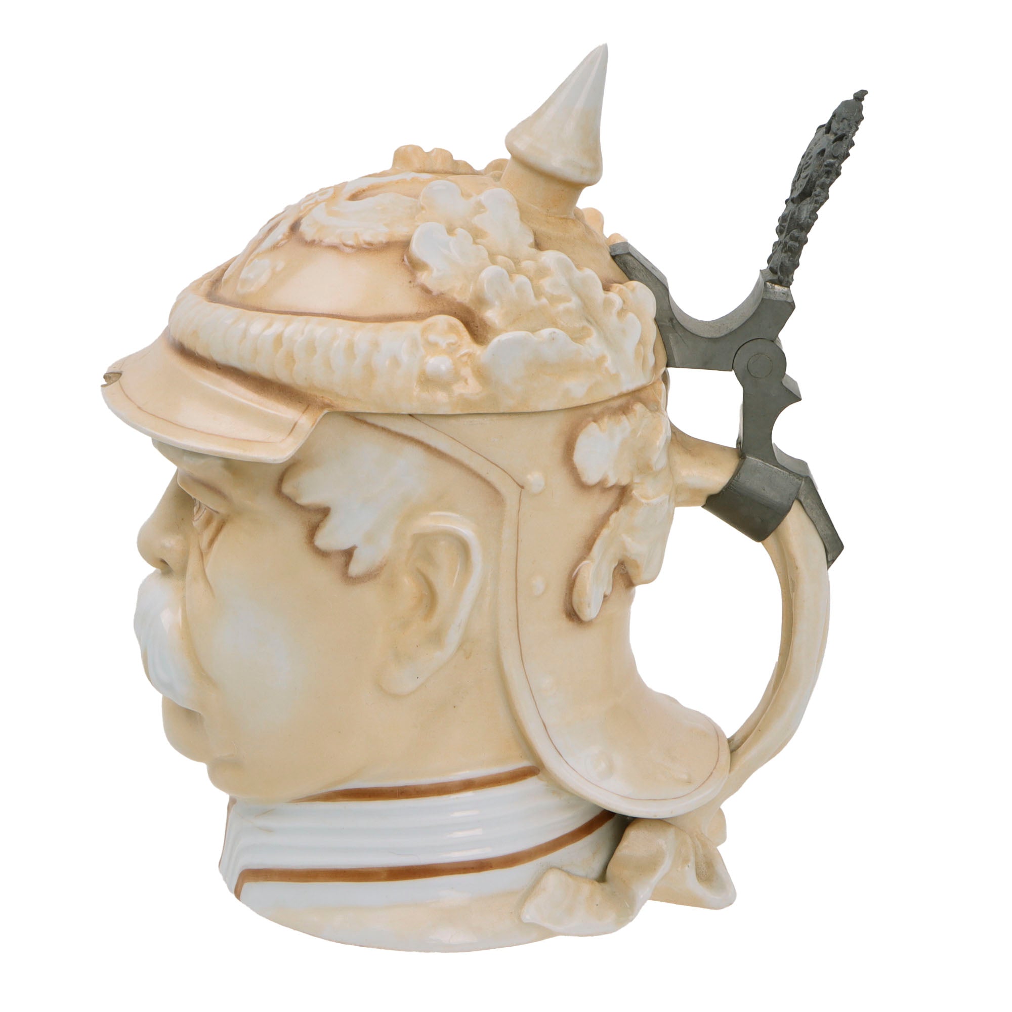 This is a great WWI era character stein, depicting the bust of Otto von Bismarck wearing his signature Kurassier pickelhaube with laurel leaves coming from the back. The bottom of the stein is marked MUSTERSCHUTZ, the maker. The hinged lid has a lovely design and is still tight.