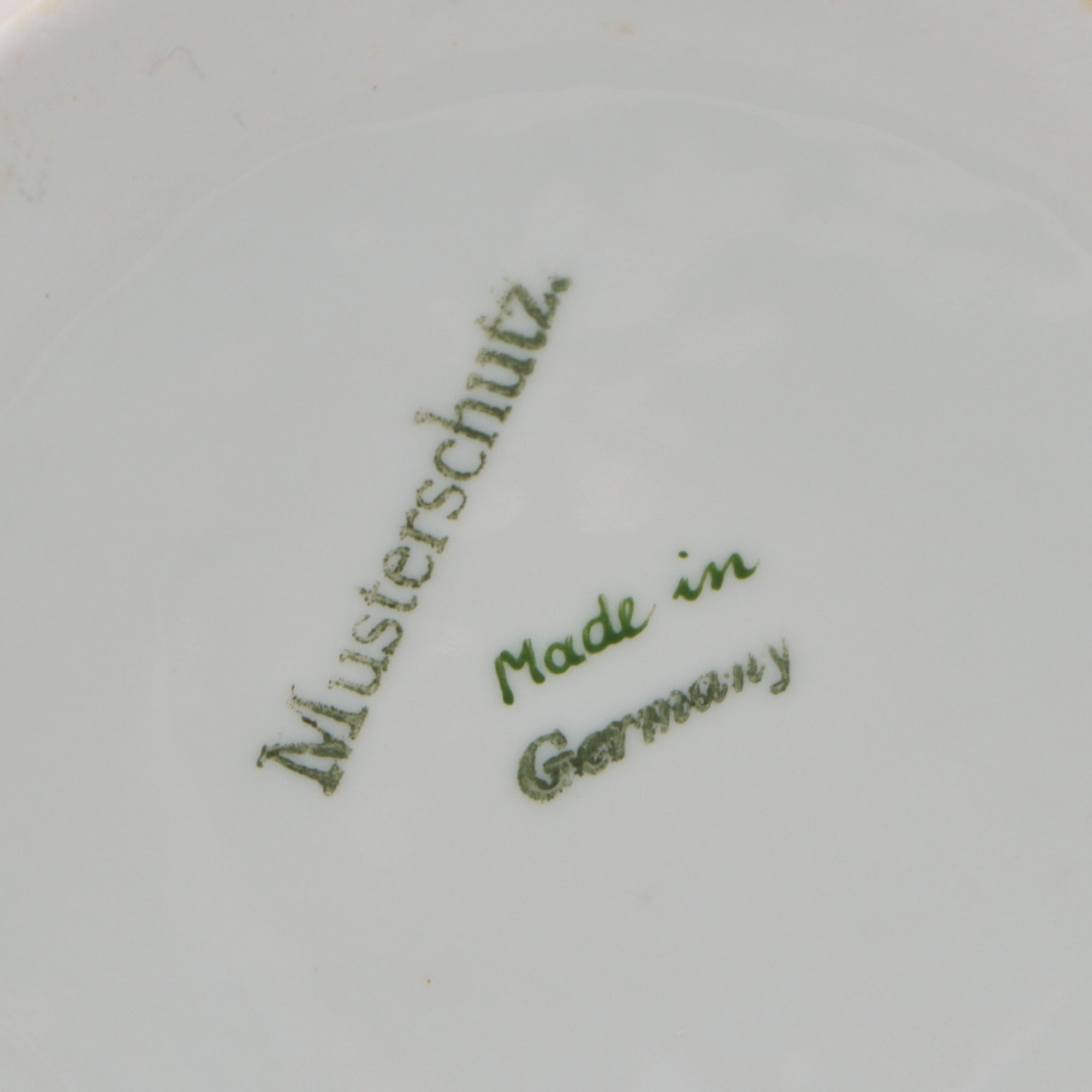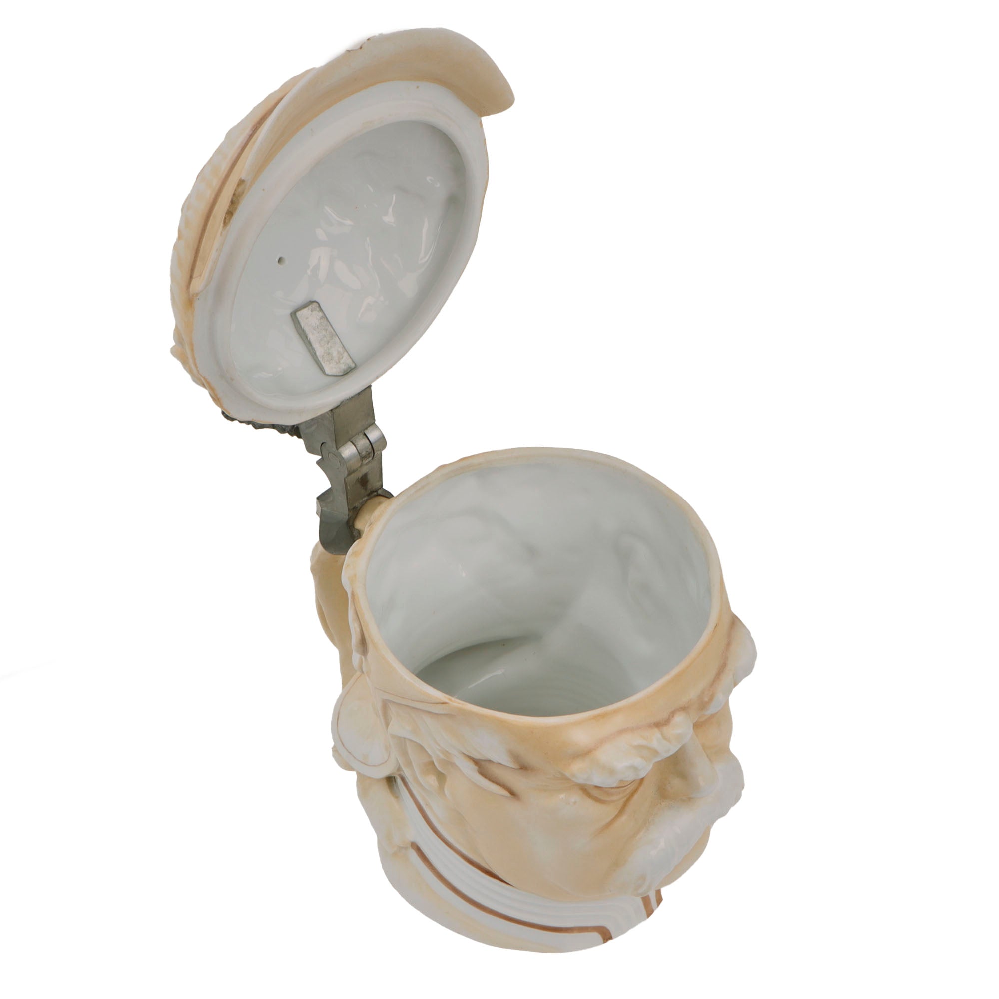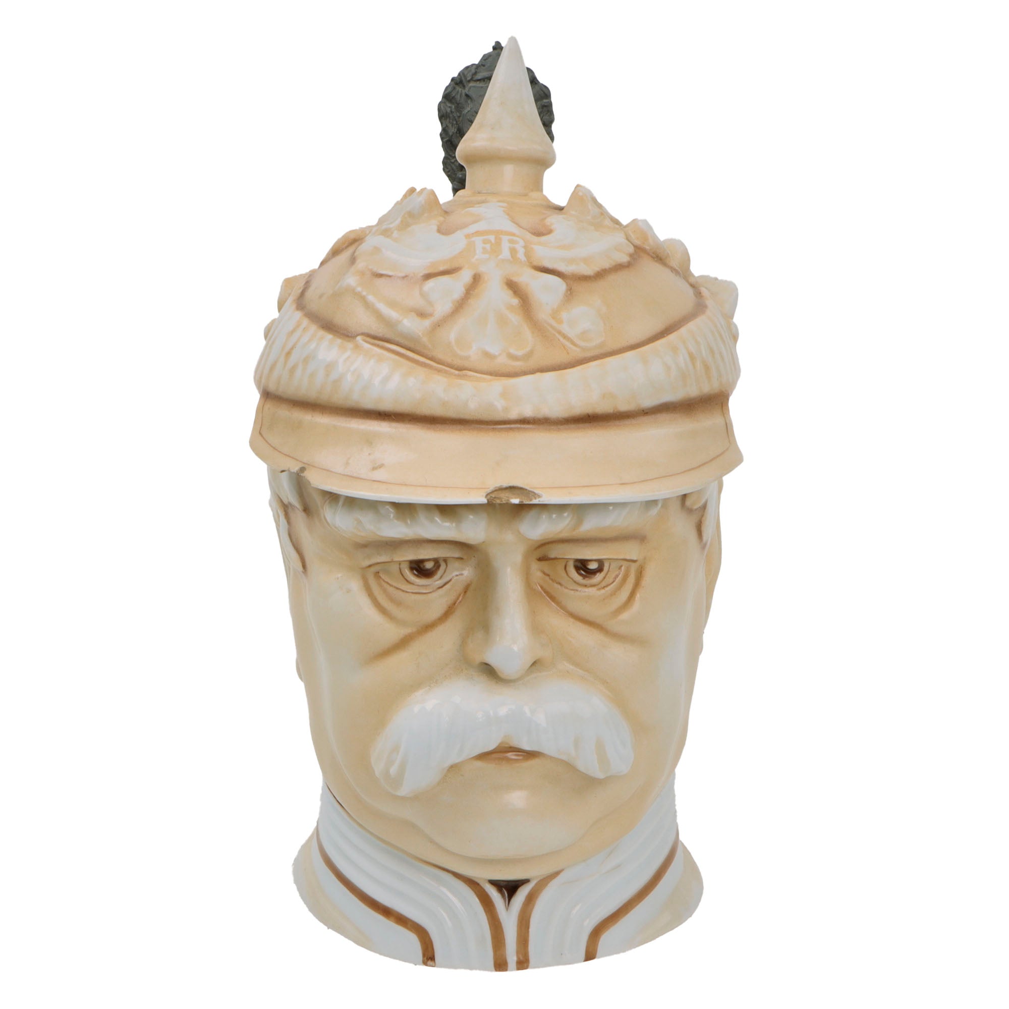 This is a great WWI era character stein, depicting the bust of Otto von Bismarck wearing his signature Kurassier pickelhaube with laurel leaves coming from the back. The bottom of the stein is marked MUSTERSCHUTZ, the maker. The hinged lid has a lovely design and is still tight.