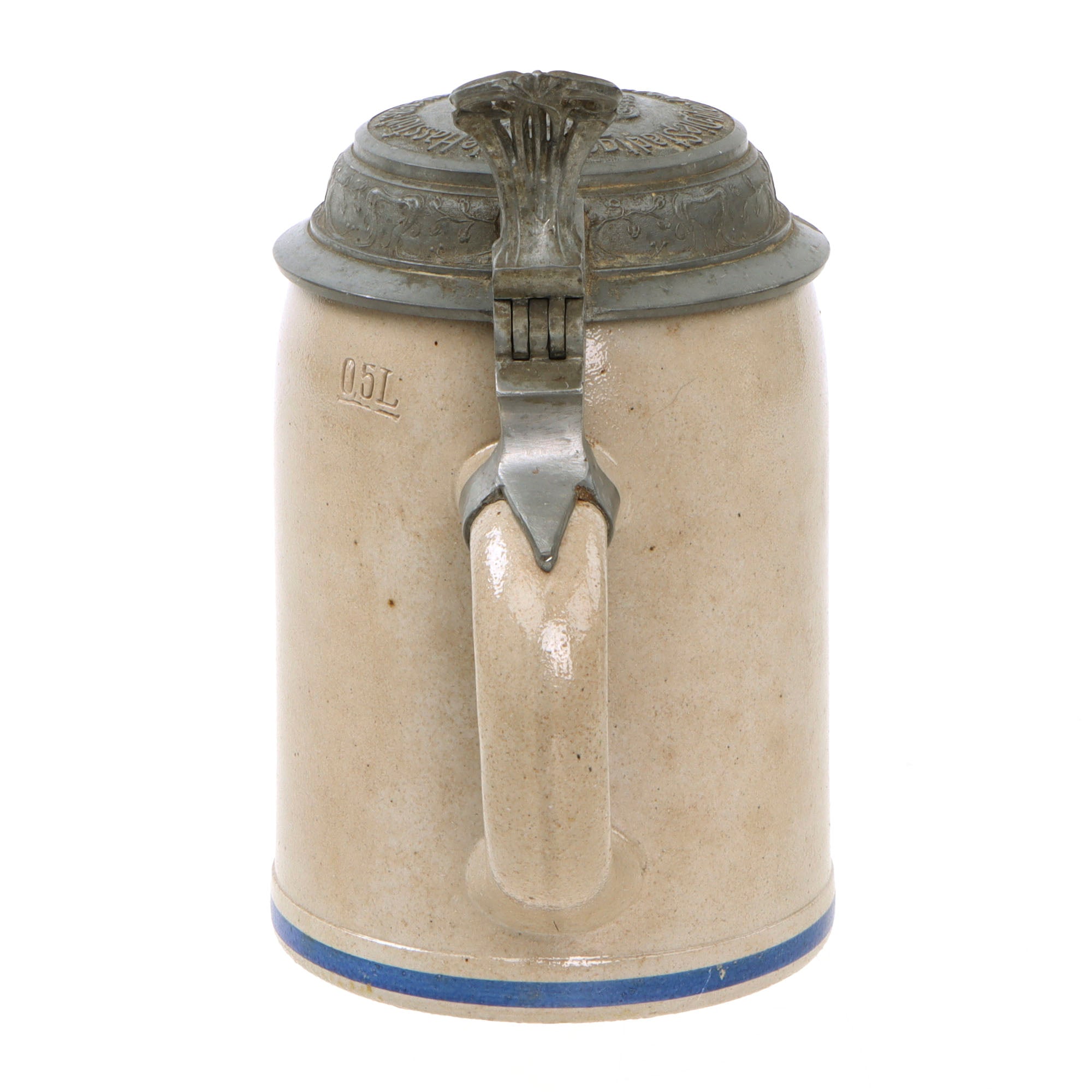 Authentic ca. 1890-1914 steins were available in pottery, porcelain, glass and metal. Regardless of what the stein was made of, almost all had pewter lids. The most common sizes are half-liter and one-liter. The beginning of WW I effectively ended the production of regimental steins as labor and materials were diverted to the war.