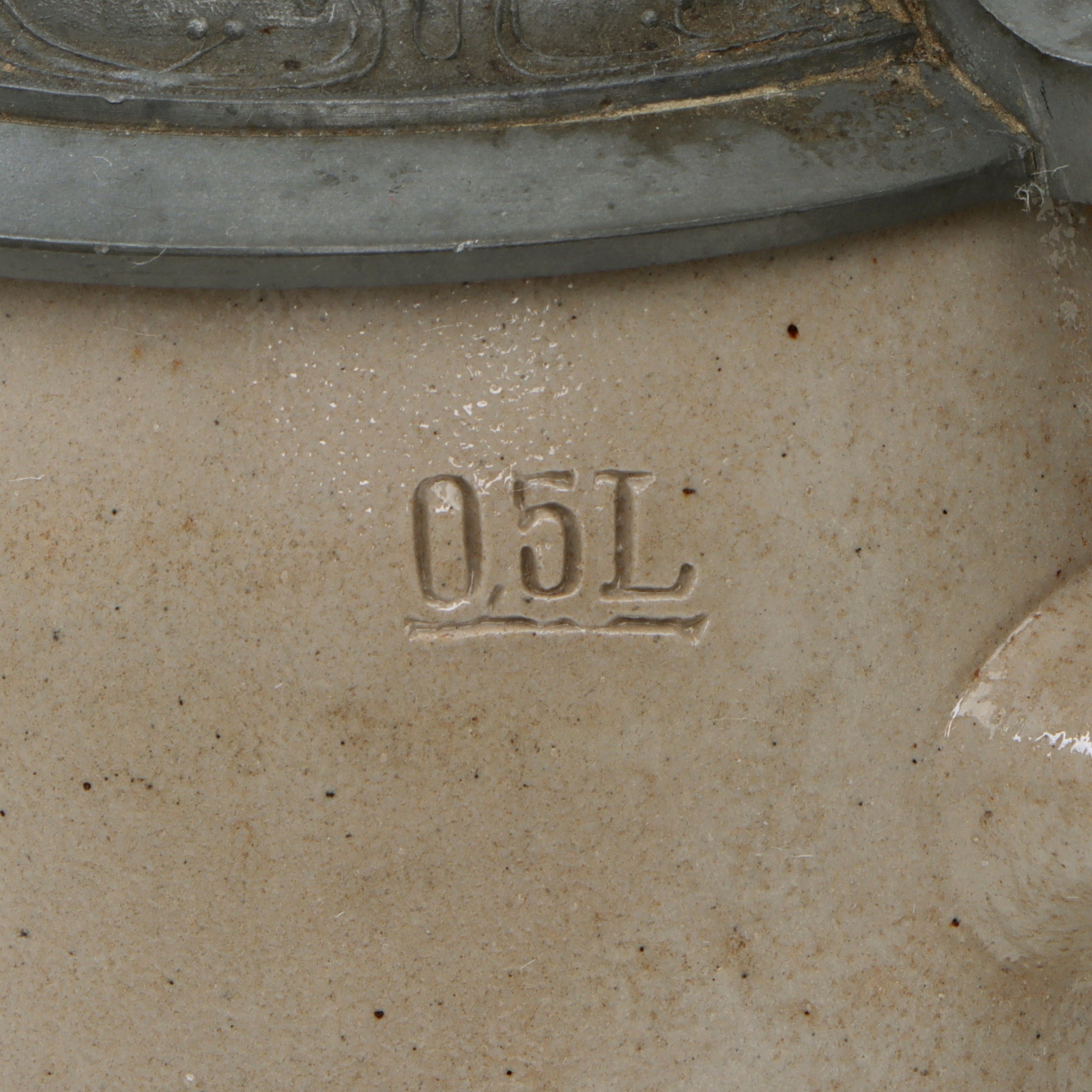 There is very heavy crazing and some cracking in the glaze which has given it a lovely patina. The stein is stamped 0.5L for half of a liter. It measures 6 1/2” tall and is 3 ¾” in diameter at the base. The lid is in great shape as is the interior.