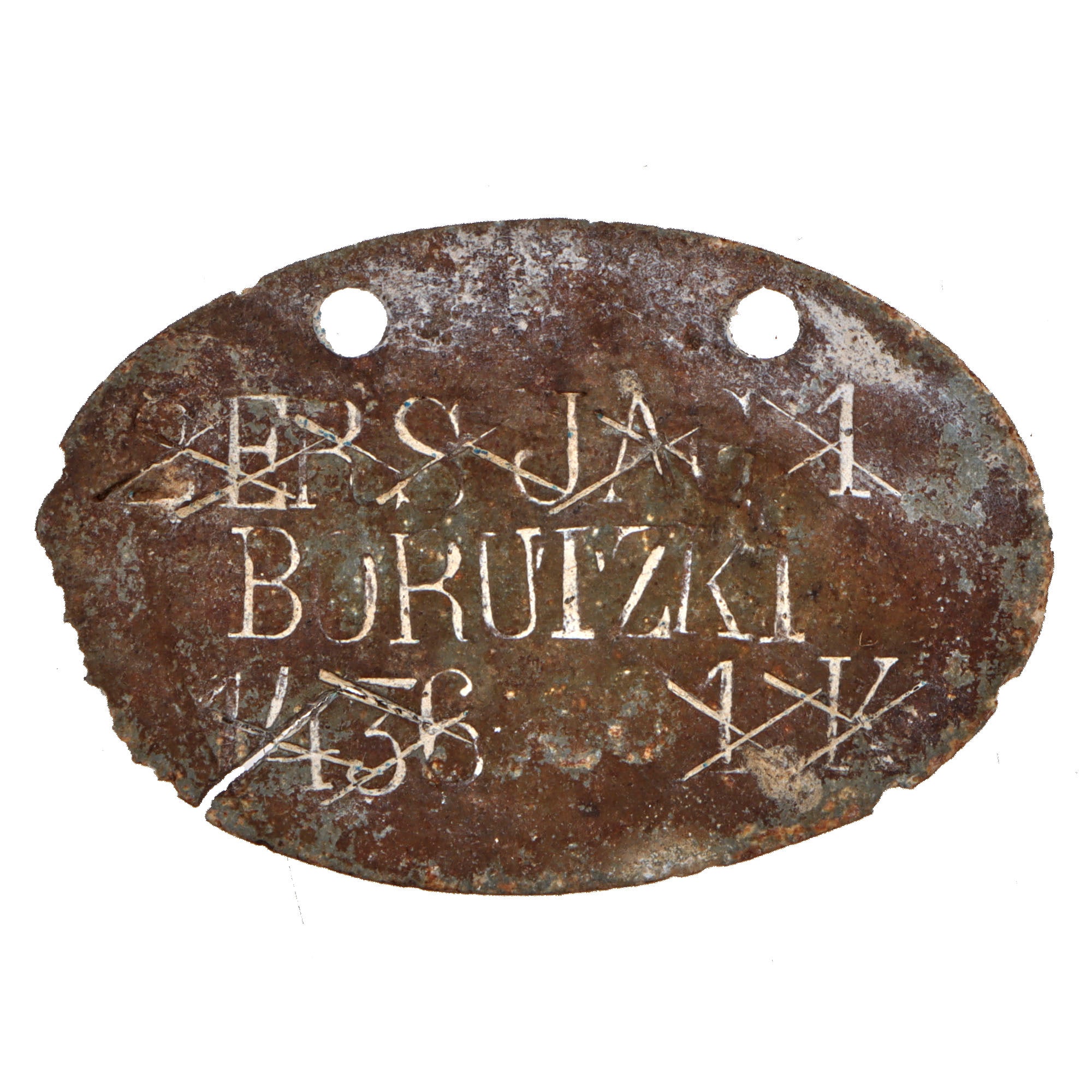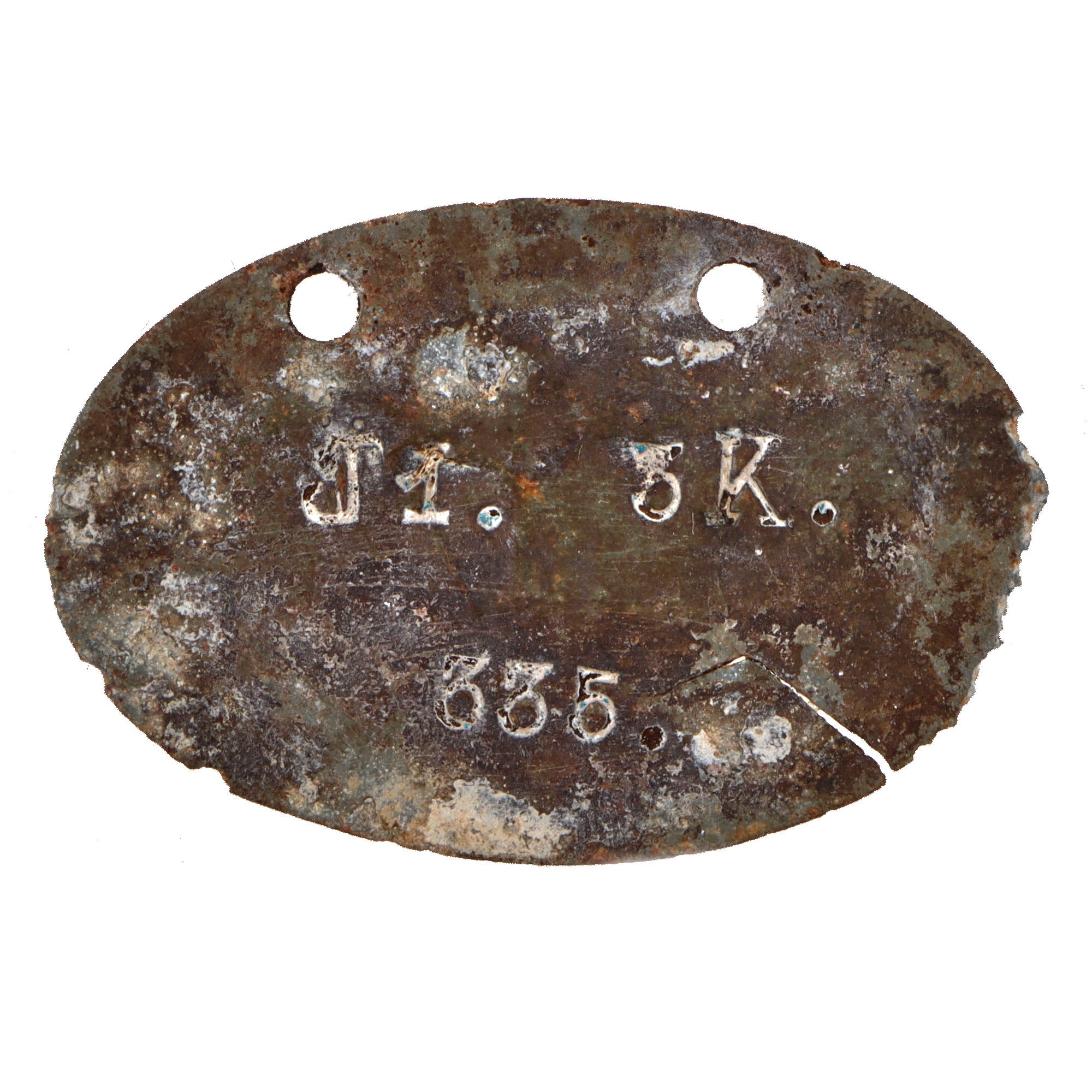 In November 1916 the final pattern saw the disc divided in two by a perforated line, and markings on each half were identical. On the upper portion, the name, address and depot unit was stamped (as before) and on the back the field unit. If the soldier became a fatality, the lower half of the disc was snapped off and sent back to the depot unit in Germany, while the upper half was buried with the soldier's remains.