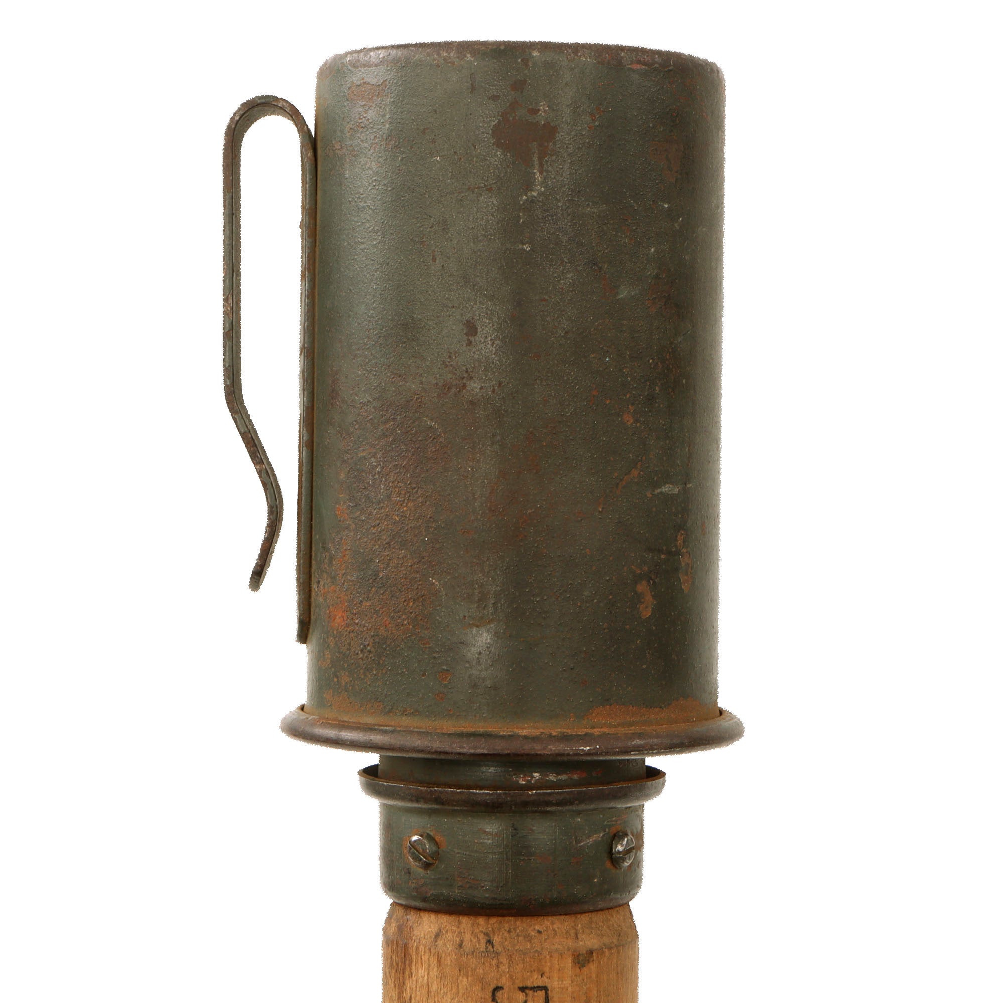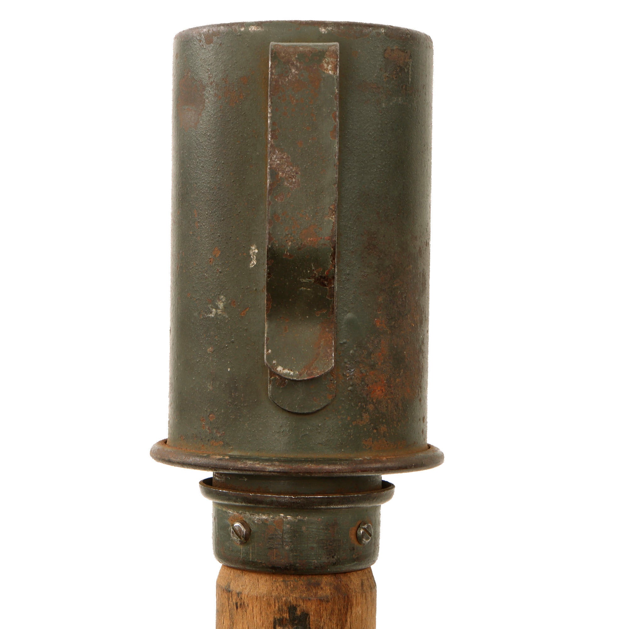 The German WWI M17 Stick Grenade was officially known as the Model 1917 Stielhandgranate (Stick Hand Grenade). It stands 13 3/4 inches tall with a 4 inch long inert explosive head. These are exceptionally rare and far more difficult to find than the WWII M24 version. It is totally inert, and cannot be converted to an explosive device.