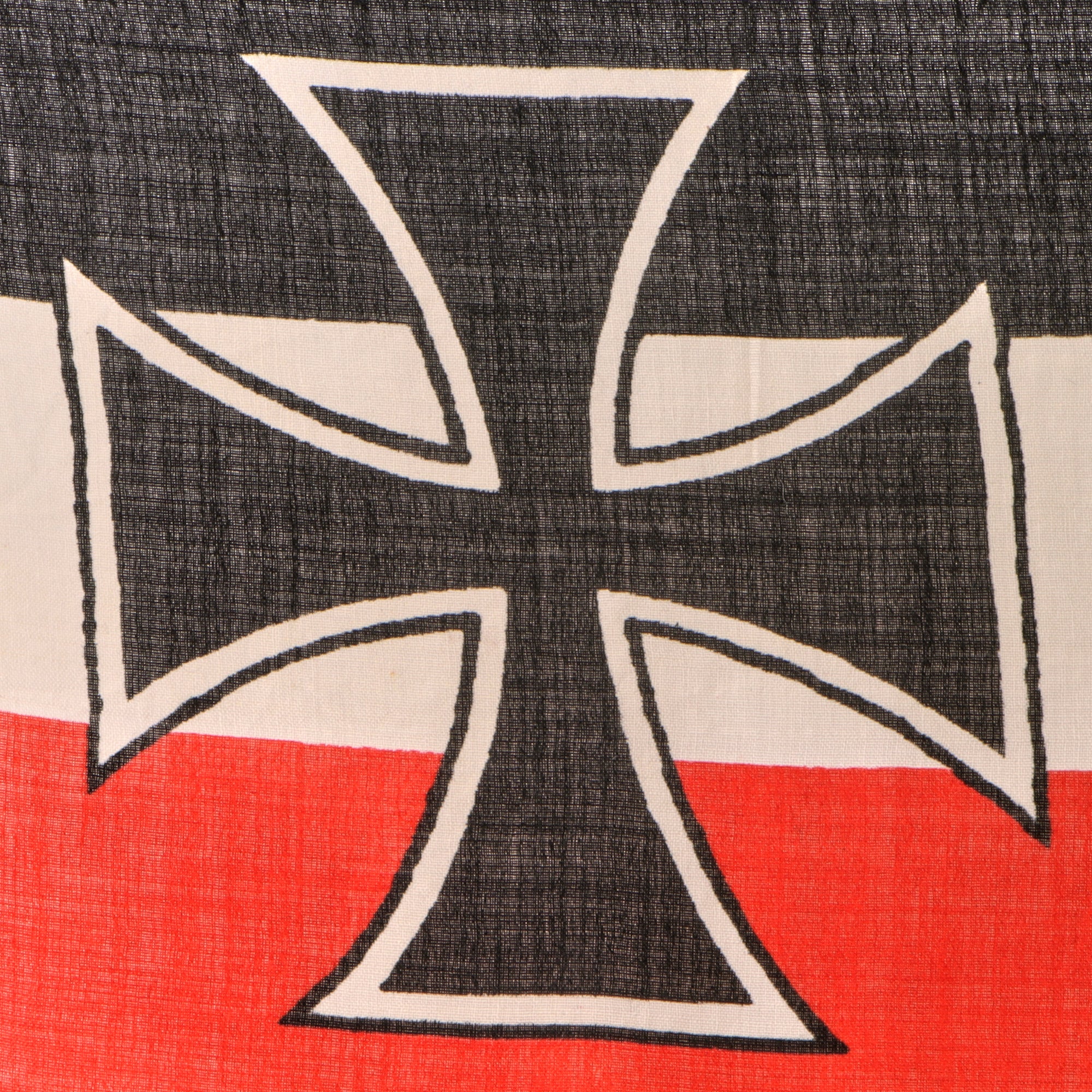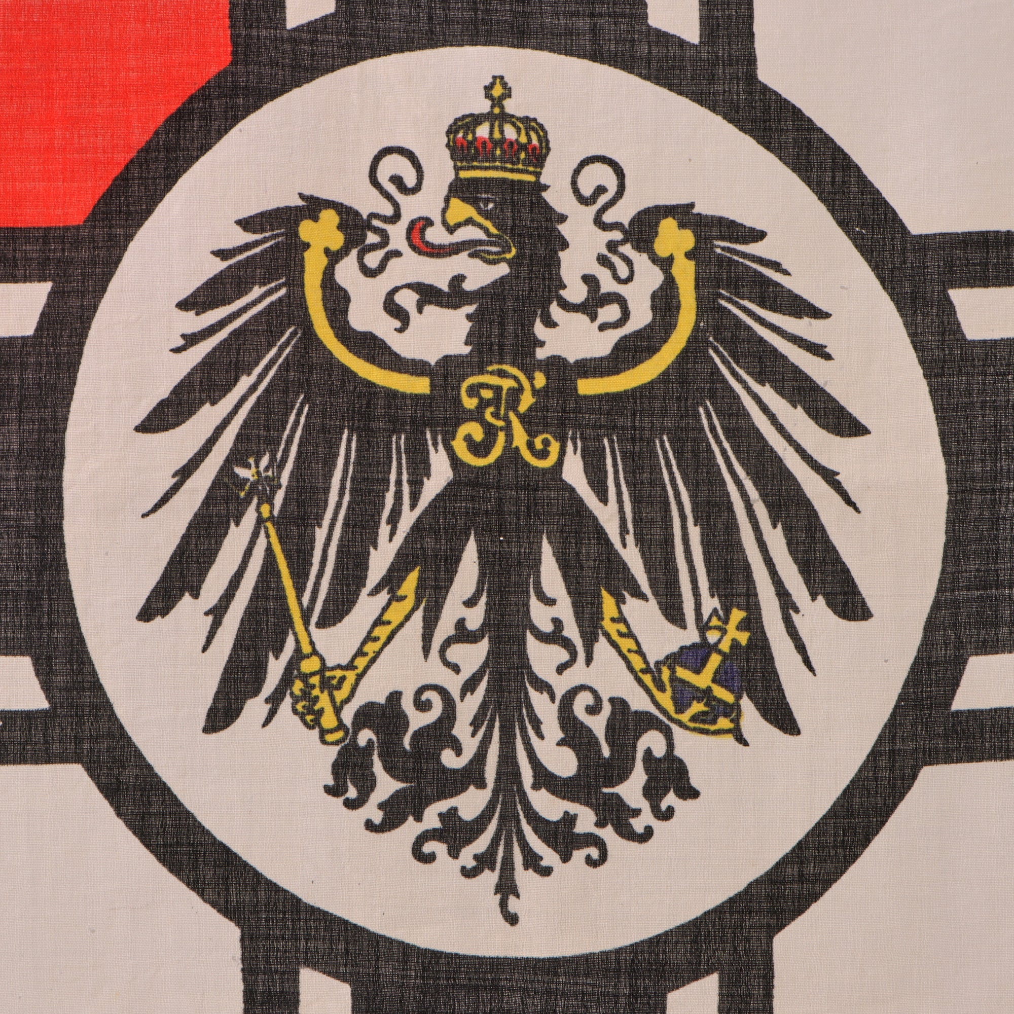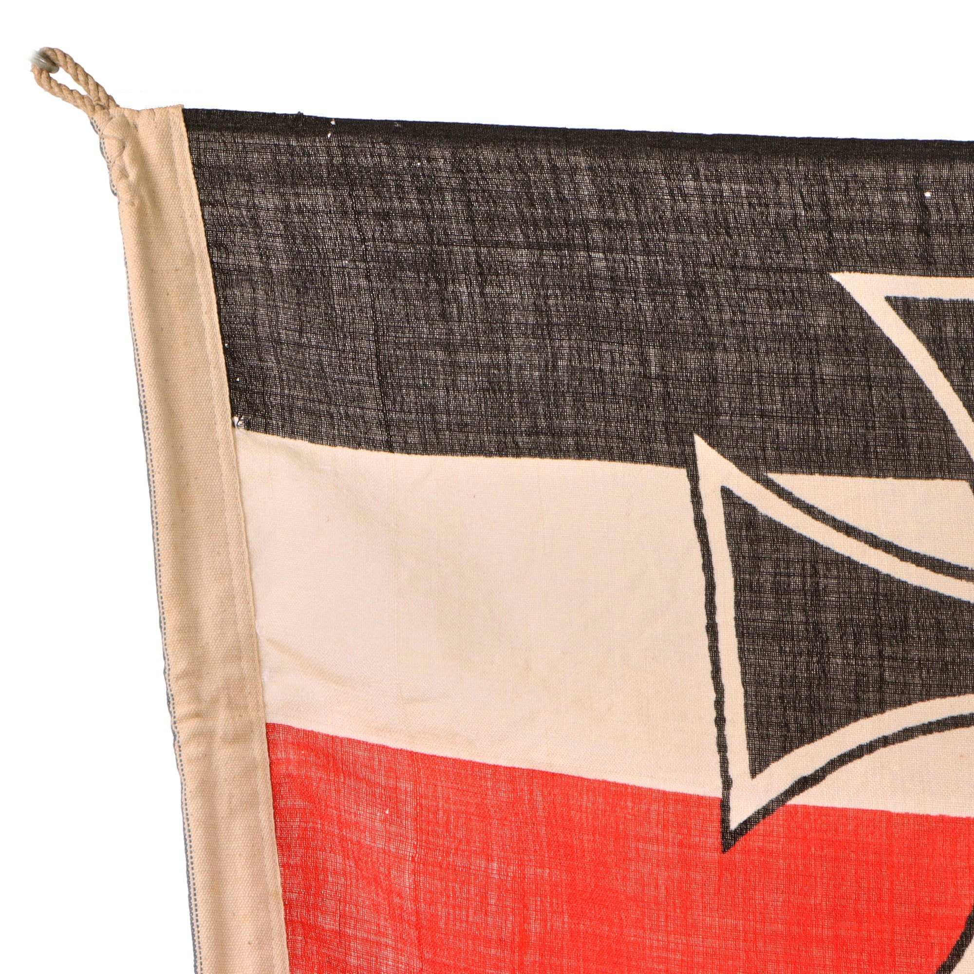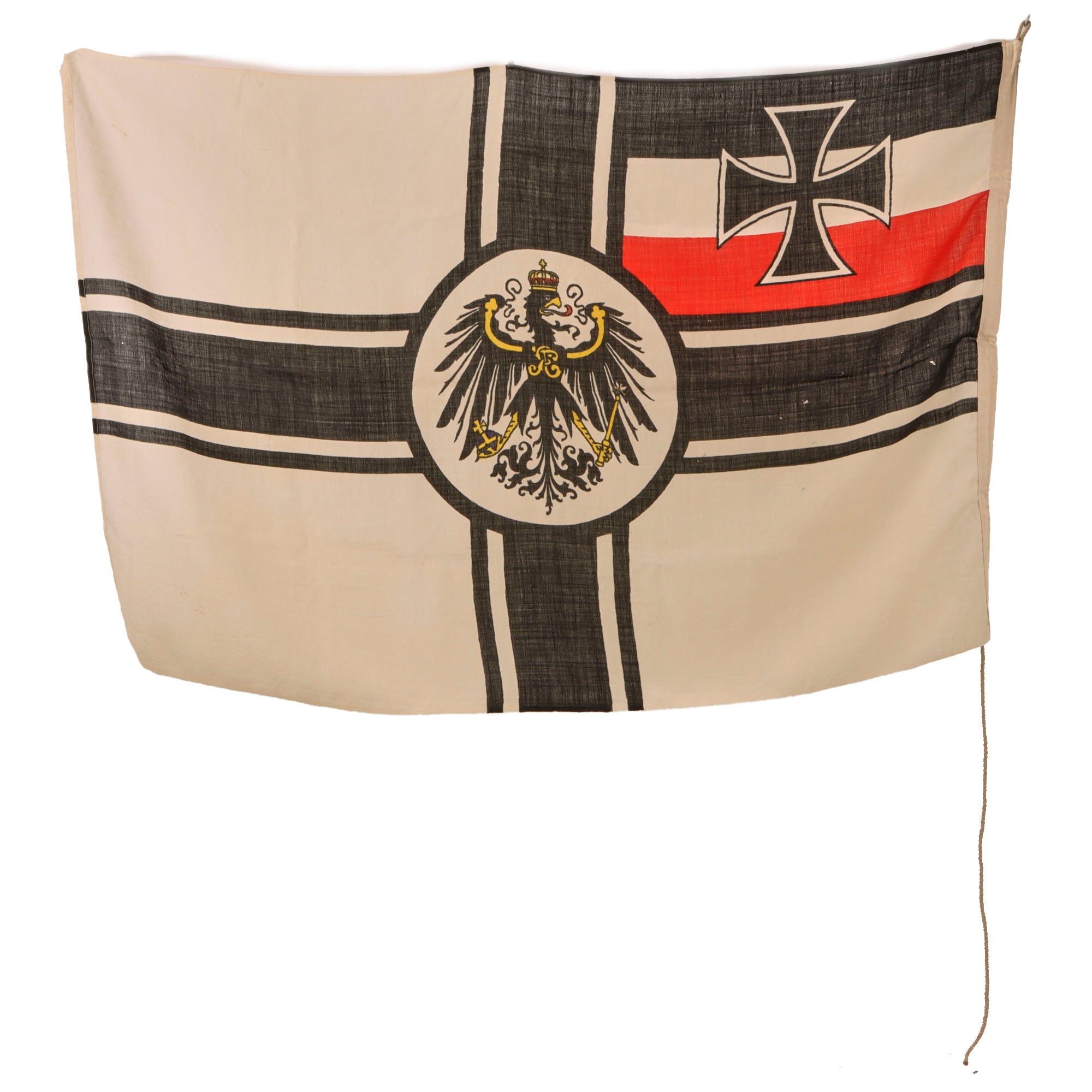 Original Item: Only One Available. This is a totally original Imperial German WWI Naval War Ensign Battle Flag, with a large Balkenkreuz (Beam Cross) in the field, with a circle around the Imperial German Eagle at the intersection of the cross. The canton of the flag contains the imperial state colors and the Prussian Eisernes Kreuz (Iron Cross). The flag is made of cotton or linen, the standard material for flags of the period.