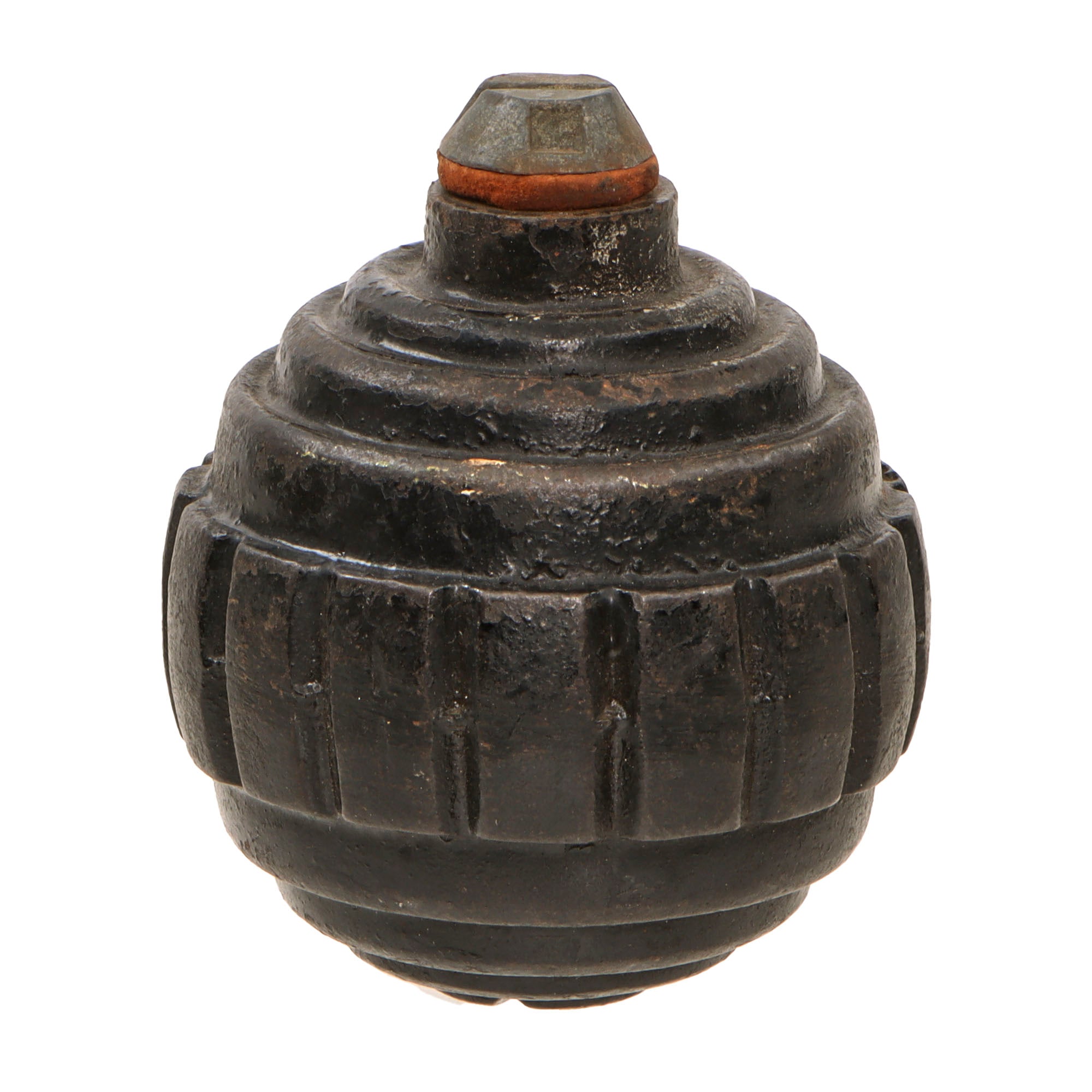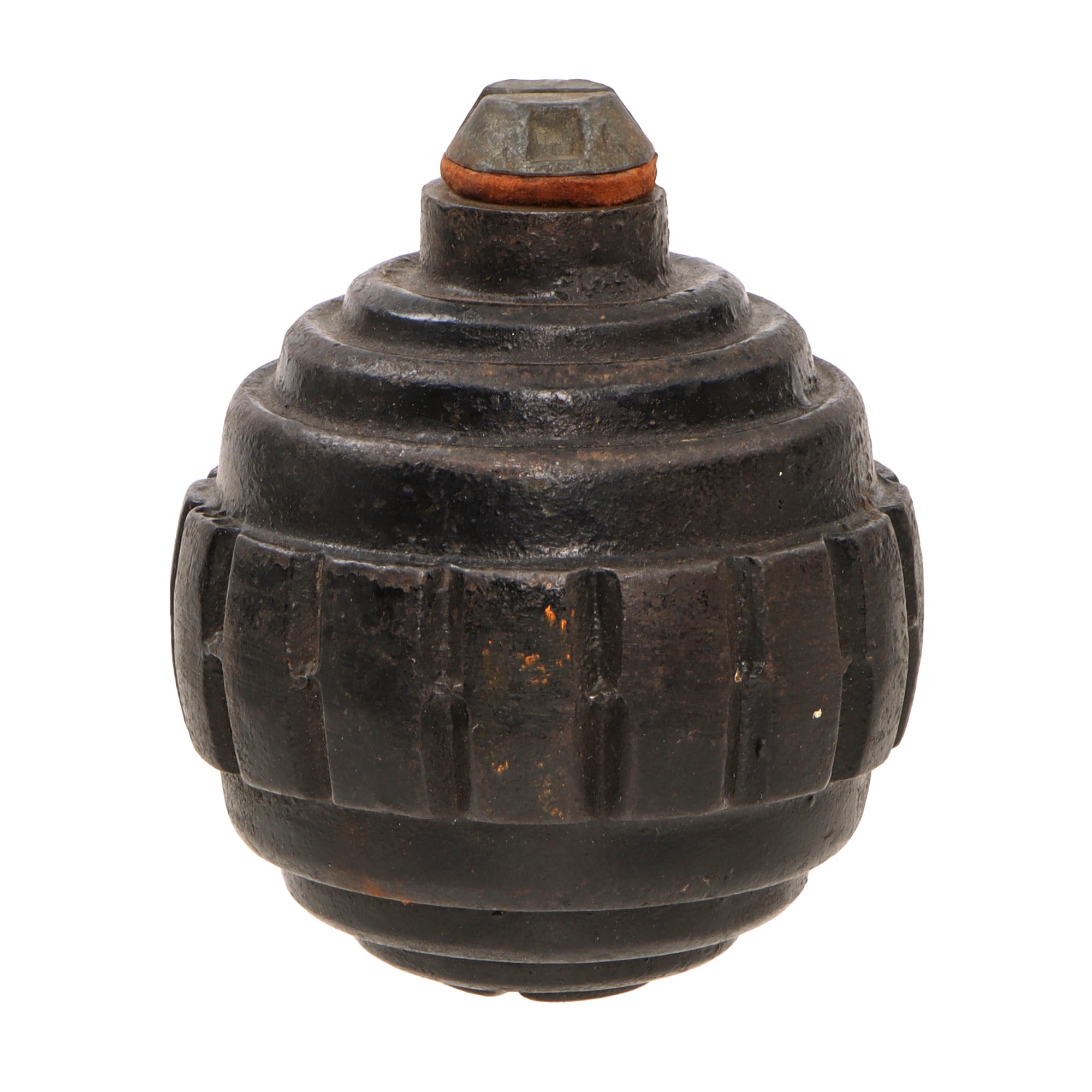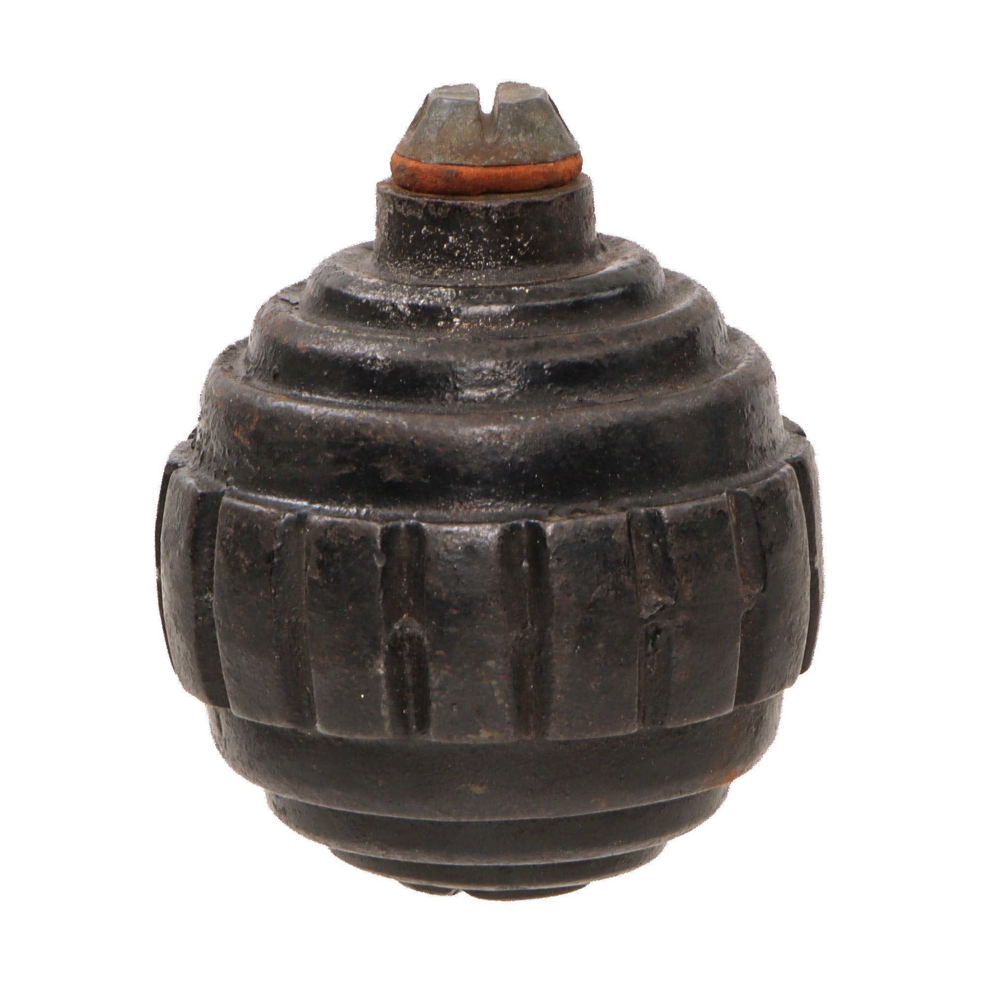 Original Item: Only One Available. The Kugelhandgranate ("ball hand grenade") is the name given to several models of hand thrown fragmentation grenades manufactured in WWI Germany. This example is known as the Model 1915 n/A (neuer Art = newer model). In 1915 this simplified fragmentation pattern of the 1913 Kugel grenade had been adopted, in order to reduce production time. The only difference was the grooved pattern on the top and bottom of the exterior, and they were otherwise identical in specification.