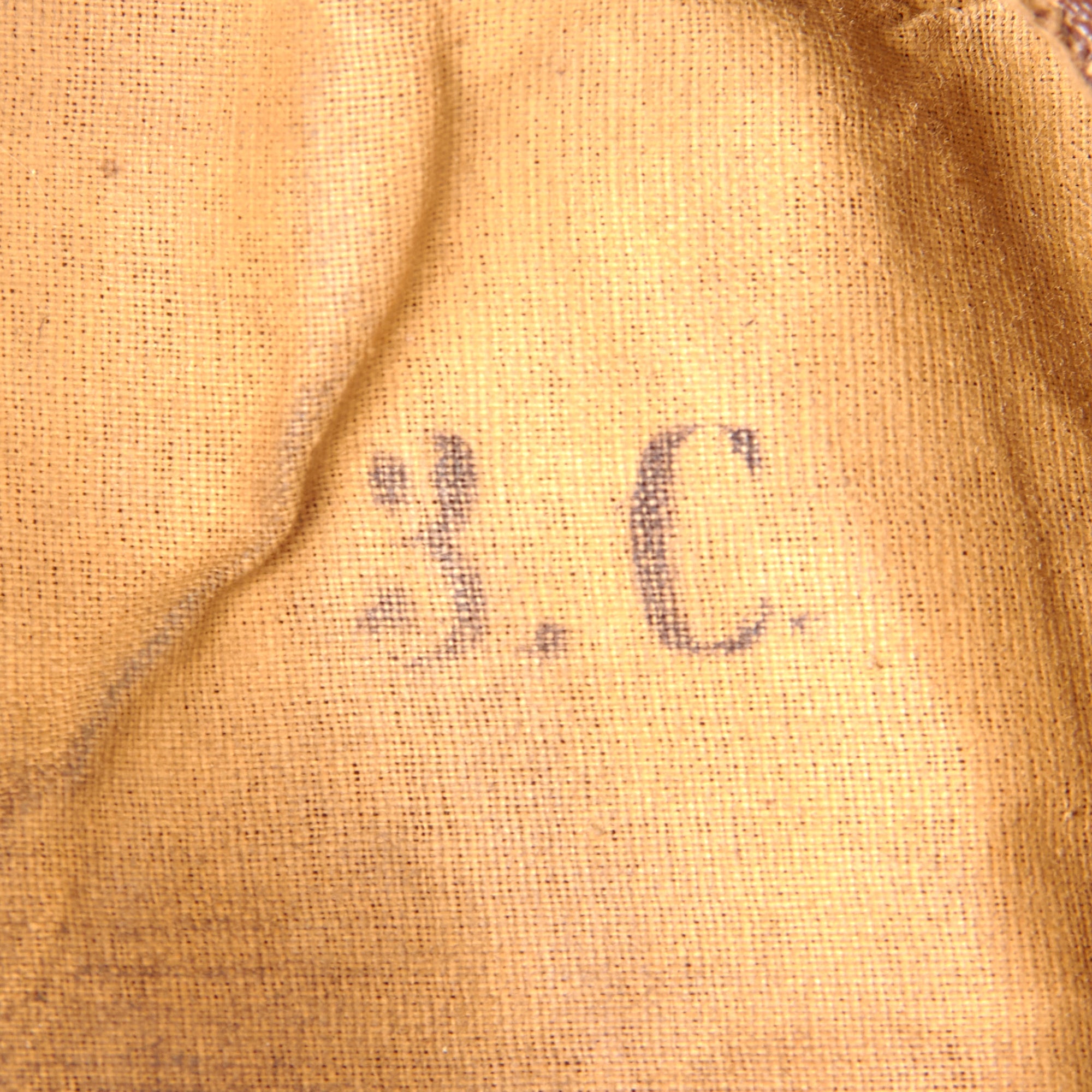 The front of the cap bears the correct Tri-Color Reichskokarde, with the black and white Prussian state kokarde (cockade) below it with a Landwehr cross inside. The interior is lined with tan cotton that once had a maker’s mark which is now extremely worn, with a faux leather sweatband that shows heavy cracking. The interior also has what may be a unit stamp, Eg. 3.C.. Size is approximately a US 7 1/4 (58cm).