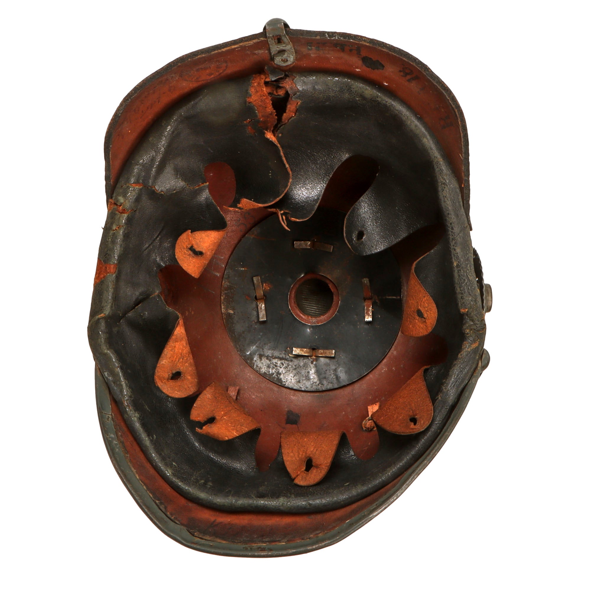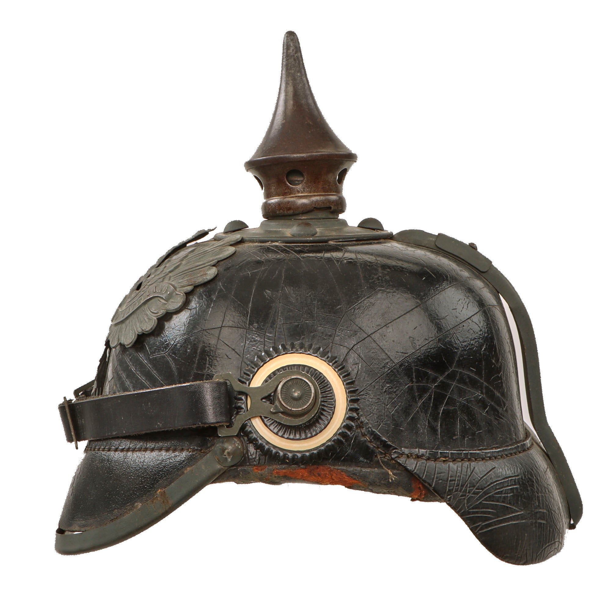• Original Item: Only One Available. A lovely example of an M-1915 Imperial Prussian Line Infantry enlisted man's Mannschaften (other ranks or EM / NCO) pickelhaube in good condition. The M1915 was the last model of Pickelhaube issued prior to the move to steel helmets. In accordance with the 1915 regulations, these helmets would no longer use brass, silver, or Tombak as the M1895 did. All issued Pickelhaube would now use gray oxidized steel fittings for all Regiments. As with previous versions, the body was constructed from boiled leather, which was shaped and lacquered black.