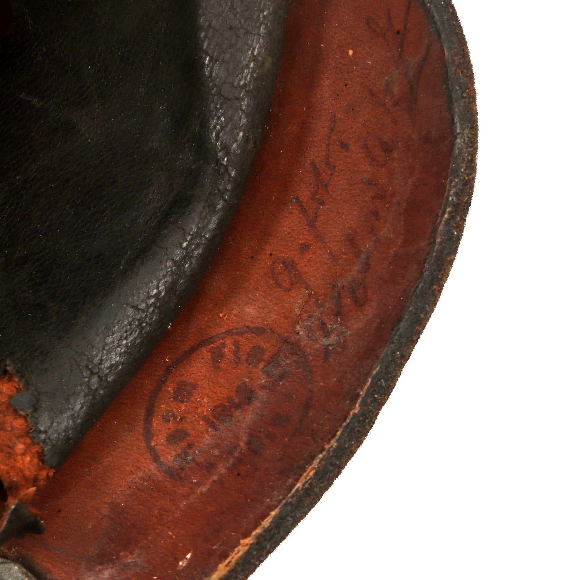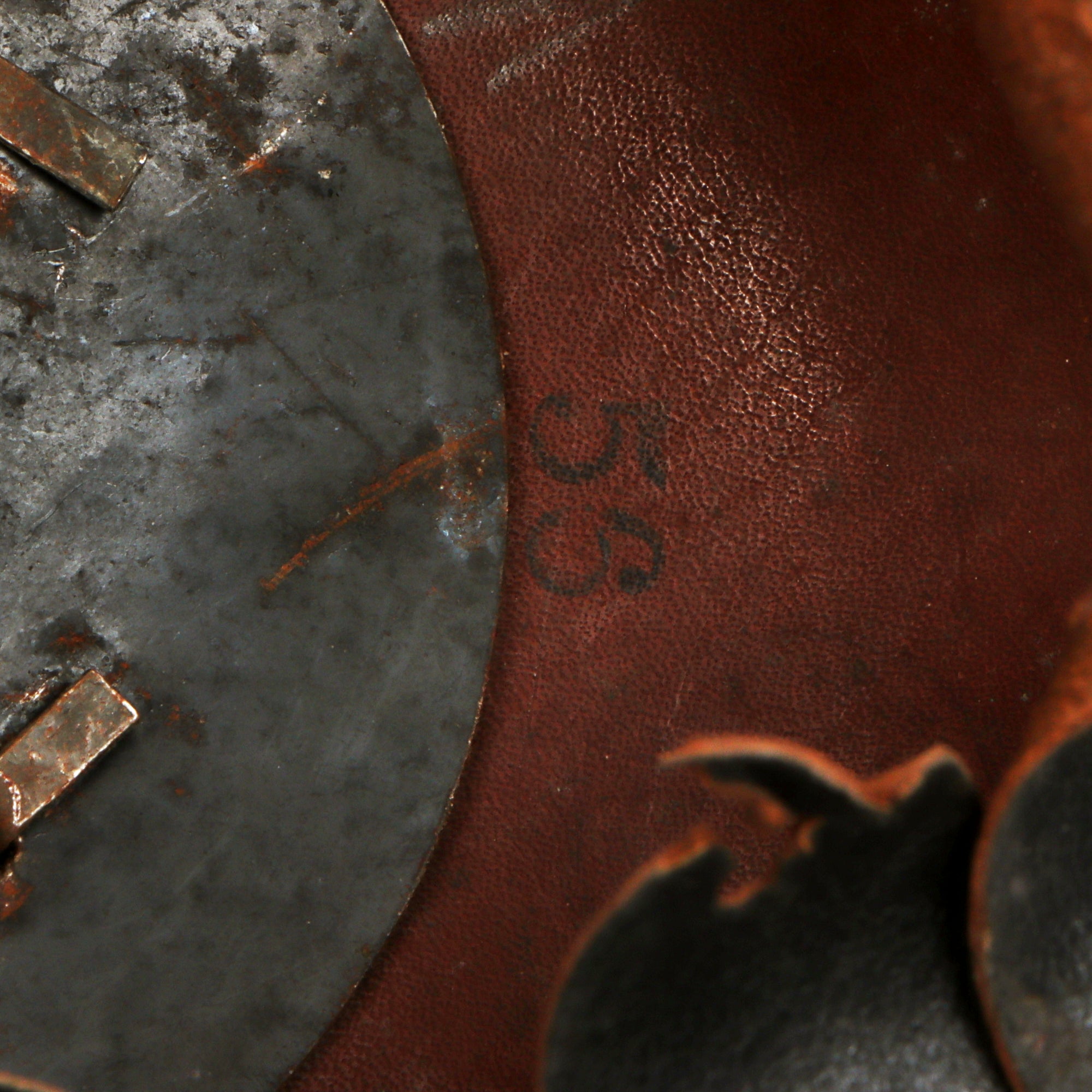 The original liner is present and in good condition. The liner is still soft, but is cracked and slightly torn at the back as shown. The interior crown is marked with a size, 56 and date, 1916. The rear visor is covered in markings, including two unit markings, R.R.A. 18 and P.B. 21. We could not identify the first marking, but we know that P.B. denotes a Pionierbataillon, or “Combat Engineer Battalion”. The official name for this battalion is Das 1. Nassauische Pionier-Bataillon Nr. 21. The rear visor also has a maker’s mark with another 1916 date, and a written name in German. This certainly makes for some good research potential!