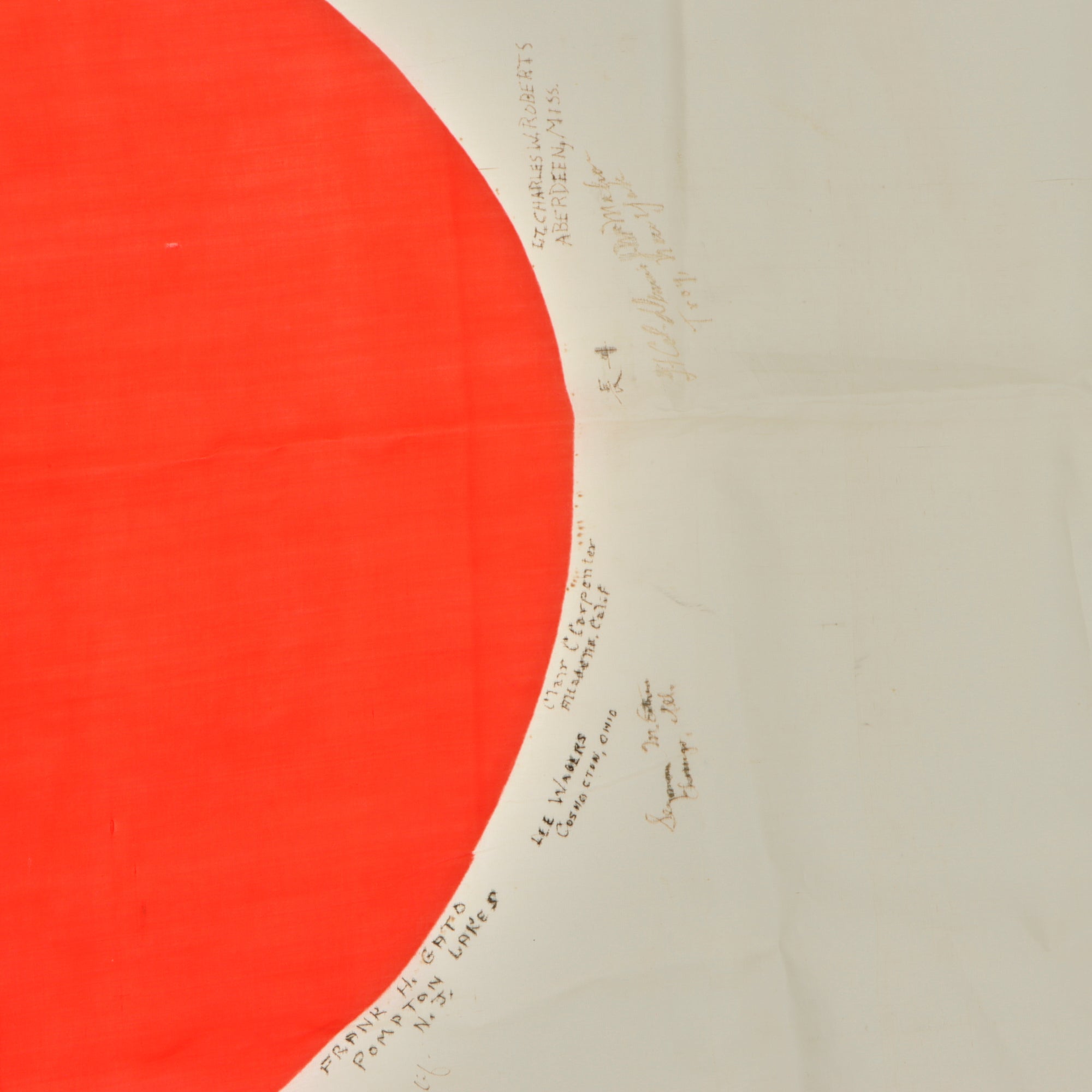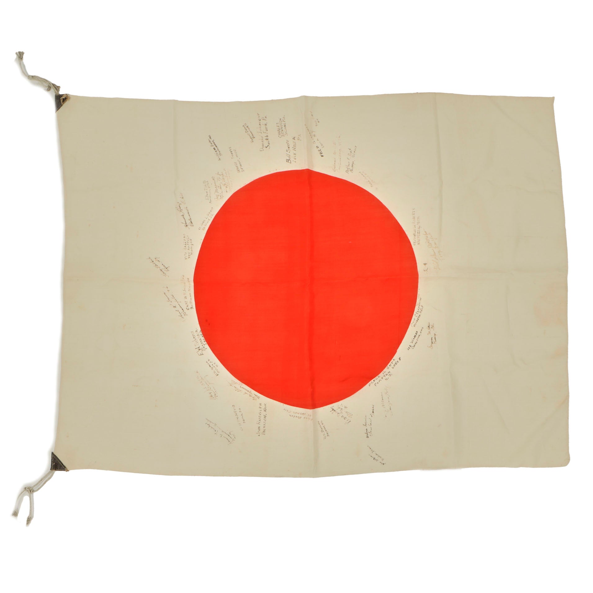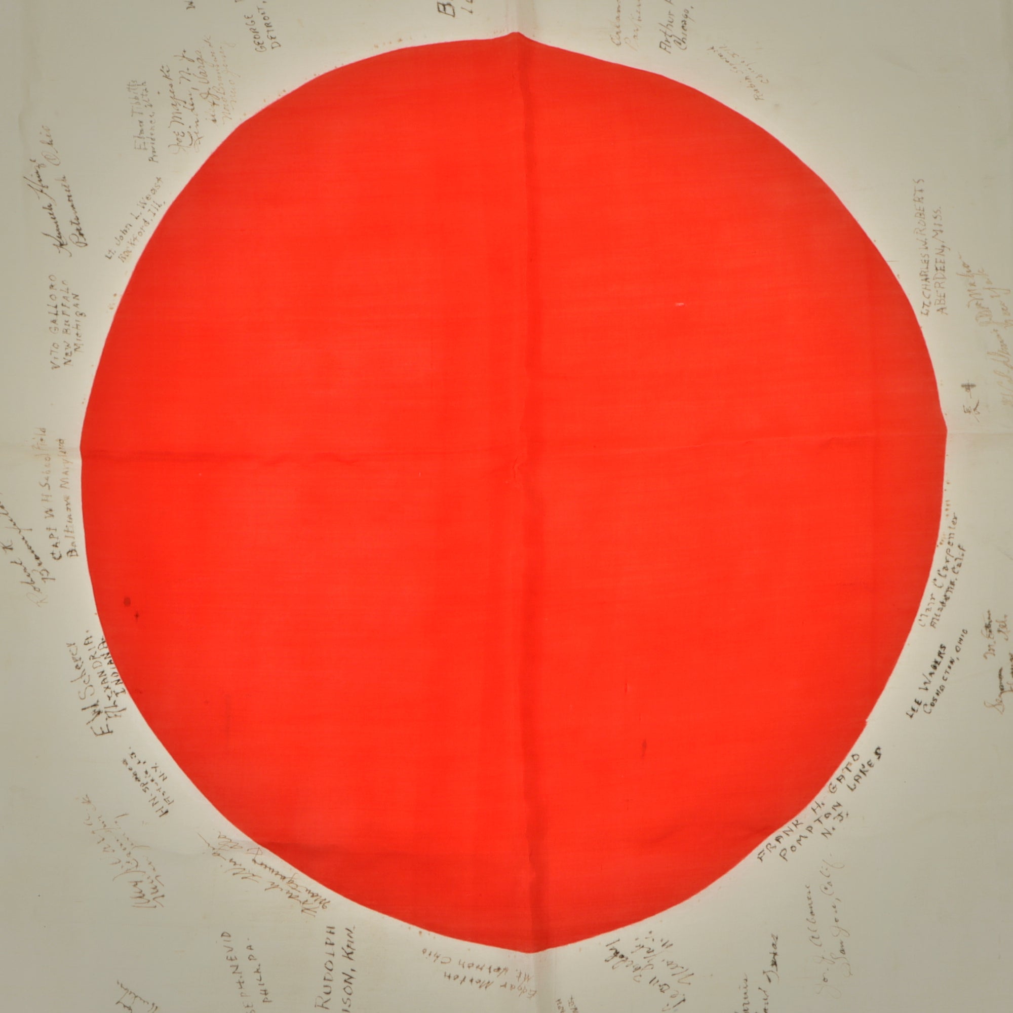 Original Item. One-of-a-Kind. This is a lovely USGI Bring Back from WWII: an original Japanese WWII "Meatball" National flag, captured and personalized by the soldiers that captured it. They added their names and hometowns, with 39 signatures total. The officers of the unit added their names as well, with the highest ranking being Lieutenant Colonel Dennis J. McMahon, which helps to identify the unit, the 387th Infantry Regiment, 97th Infantry Division. This unit fought in Central Europe at the end of World War II, then being sent to Japan for Occupation duty, where this flag was captured and signed.