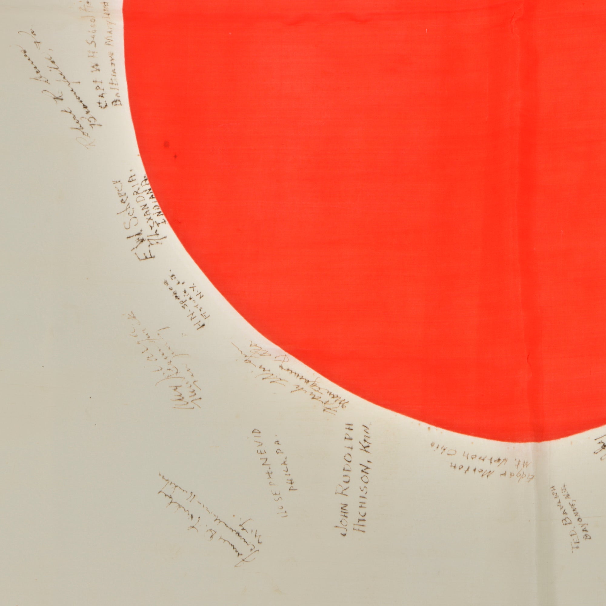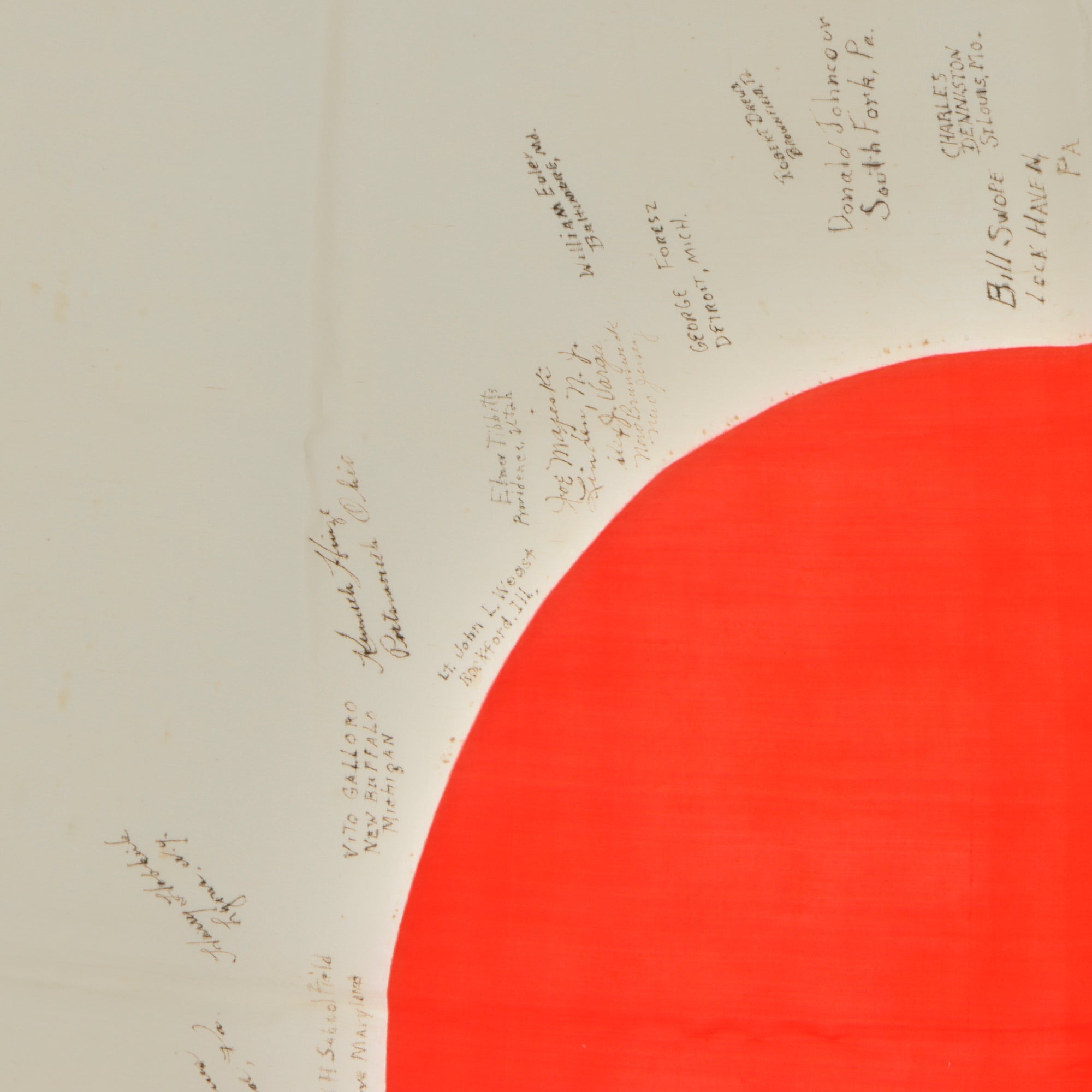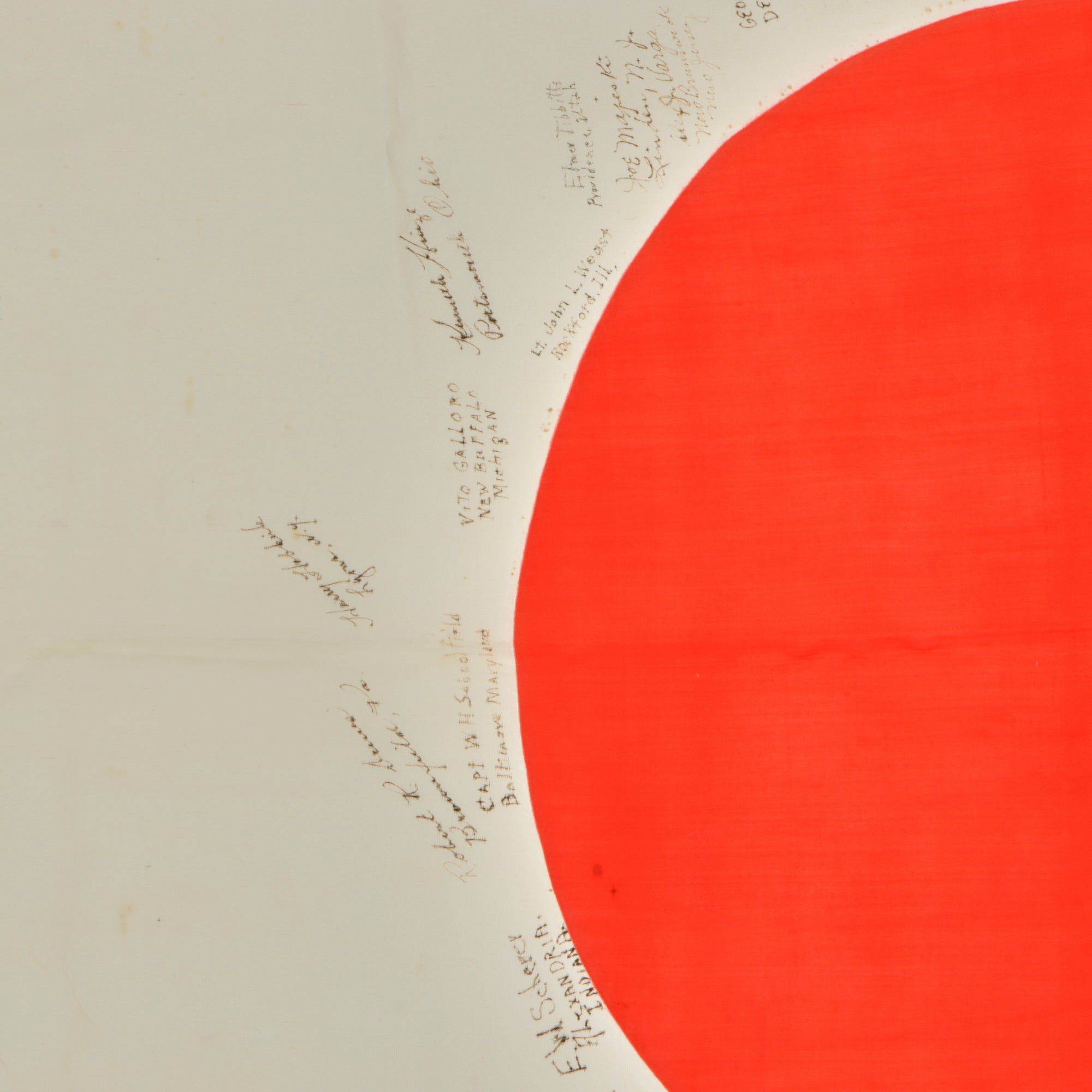 Original Item. One-of-a-Kind. This is a lovely USGI Bring Back from WWII: an original Japanese WWII "Meatball" National flag, captured and personalized by the soldiers that captured it. They added their names and hometowns, with 39 signatures total. The officers of the unit added their names as well, with the highest ranking being Lieutenant Colonel Dennis J. McMahon, which helps to identify the unit, the 387th Infantry Regiment, 97th Infantry Division. This unit fought in Central Europe at the end of World War II, then being sent to Japan for Occupation duty, where this flag was captured and signed.