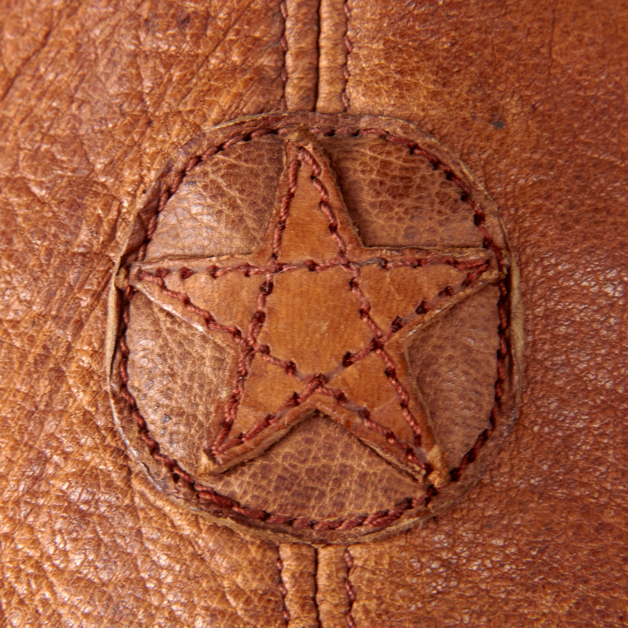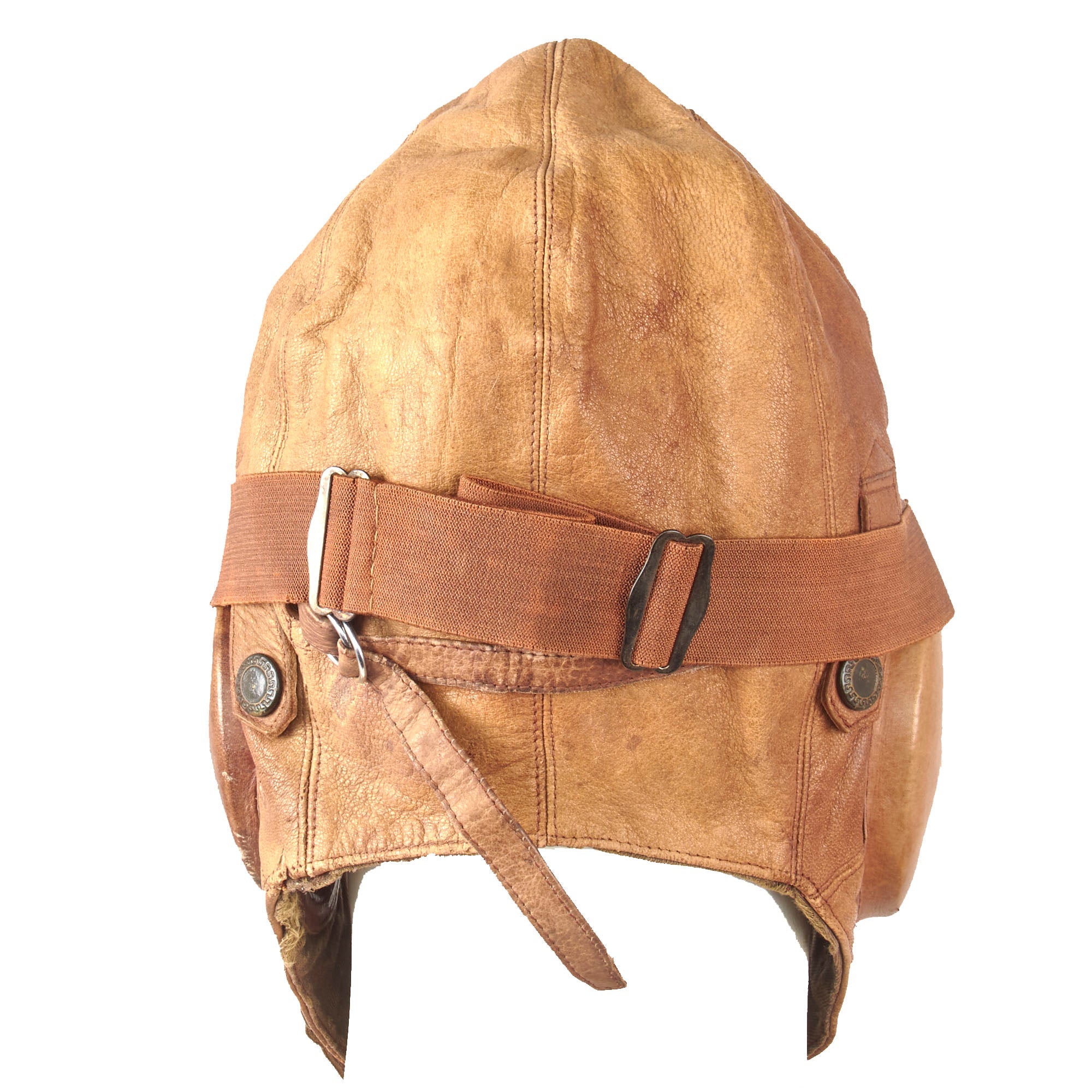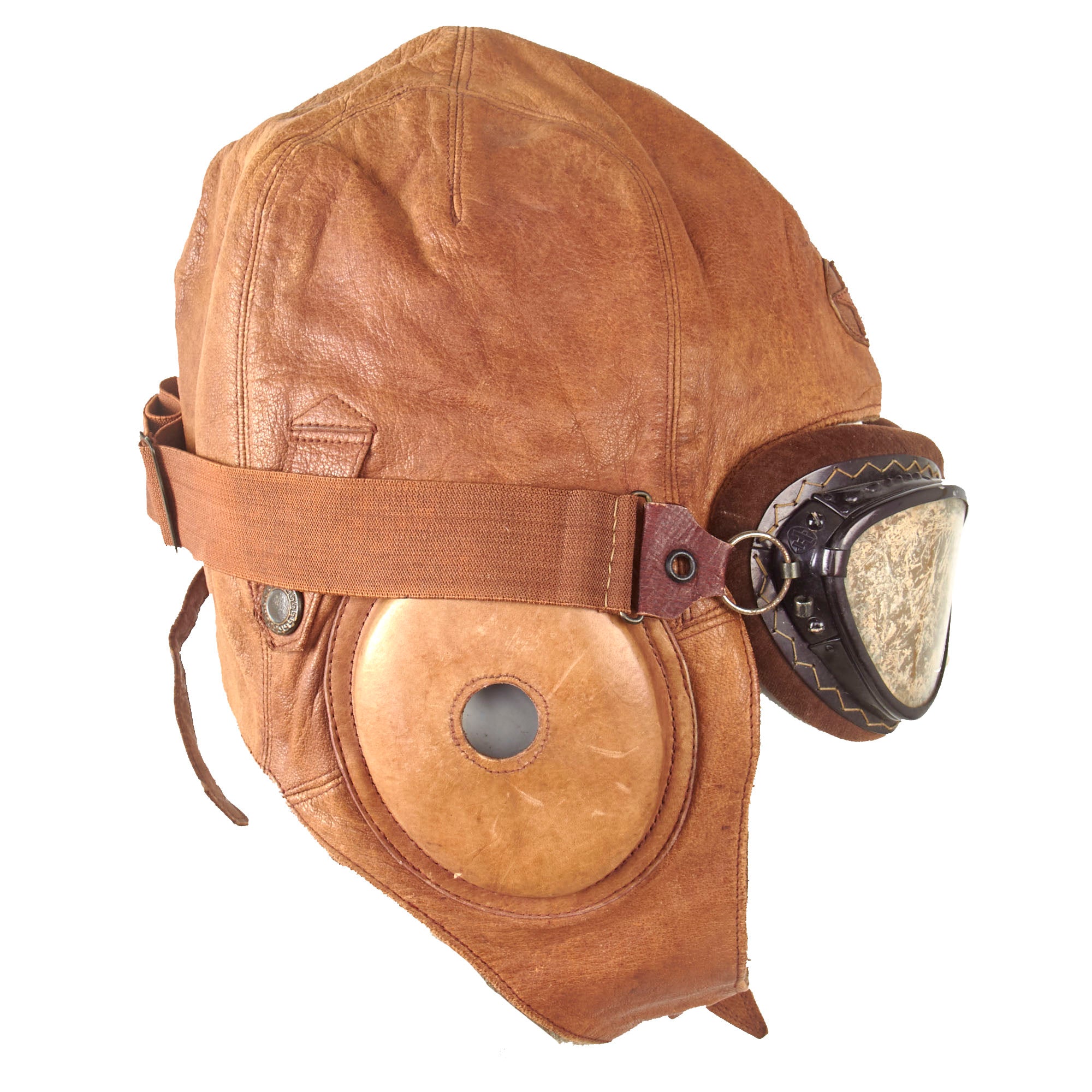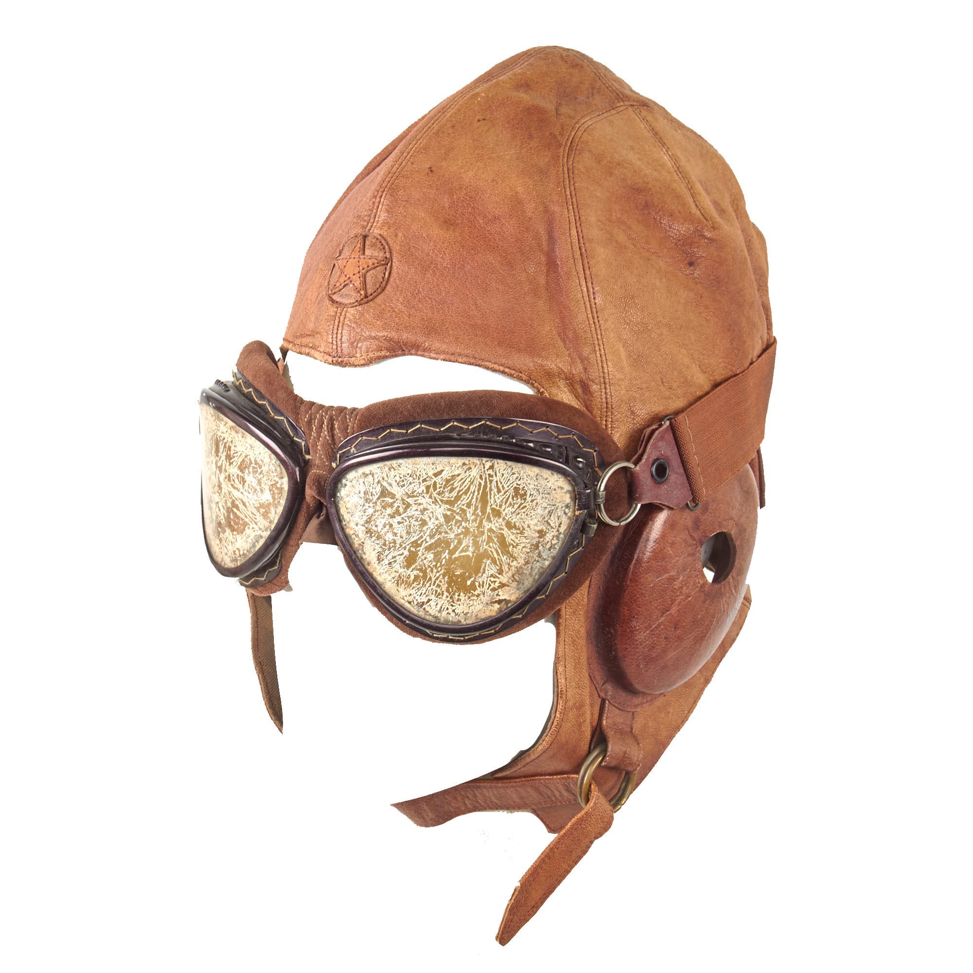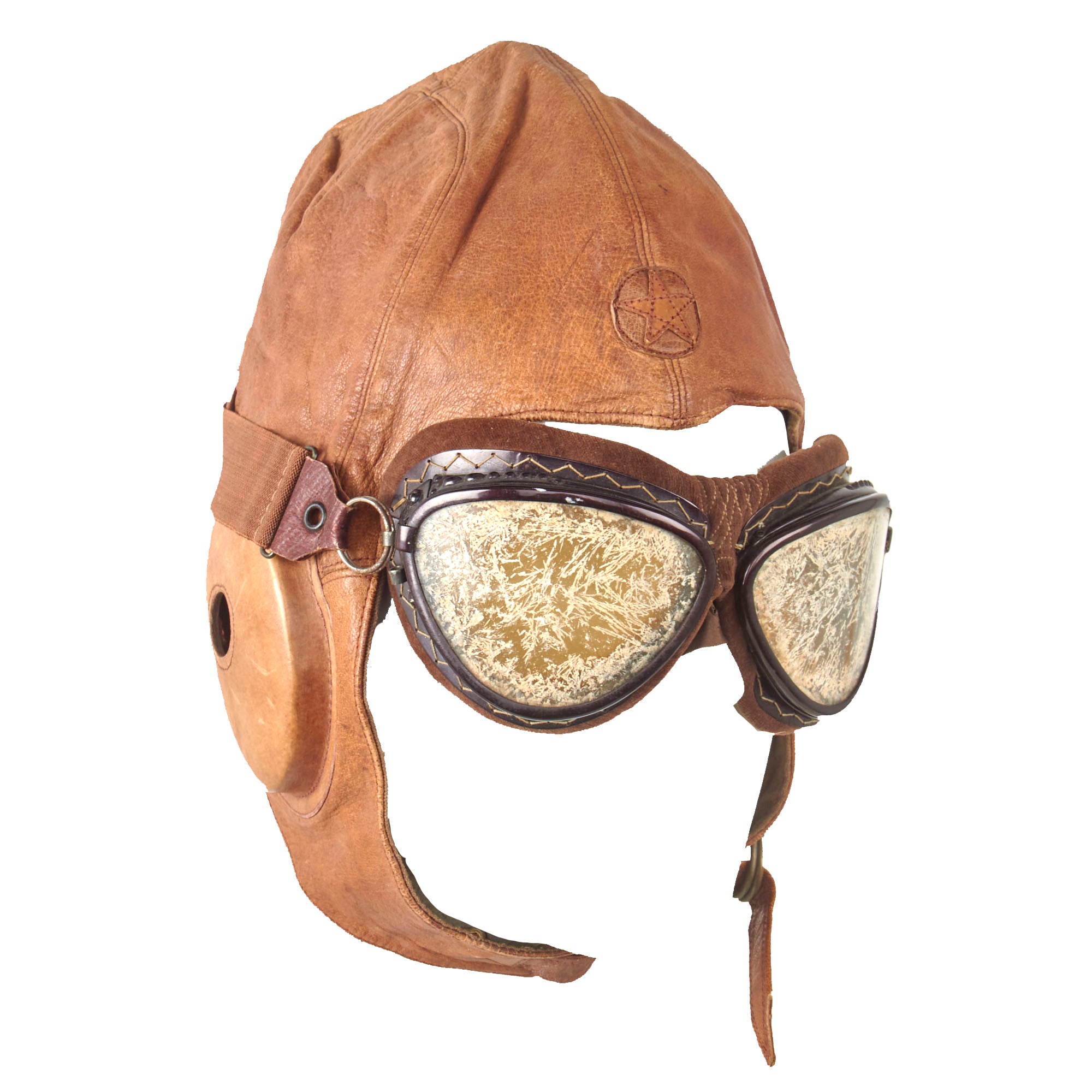 Original Item: Only One Available. Made of a soft tan leather, this helmet is in very good supple condition. It is constructed of multiple separate pieces of leather, with a 5 pointed Japanese Army Star on the front. The ear cups are complete, and made of hardened leather, each having holes in the center for mounting the communication equipment and receivers.