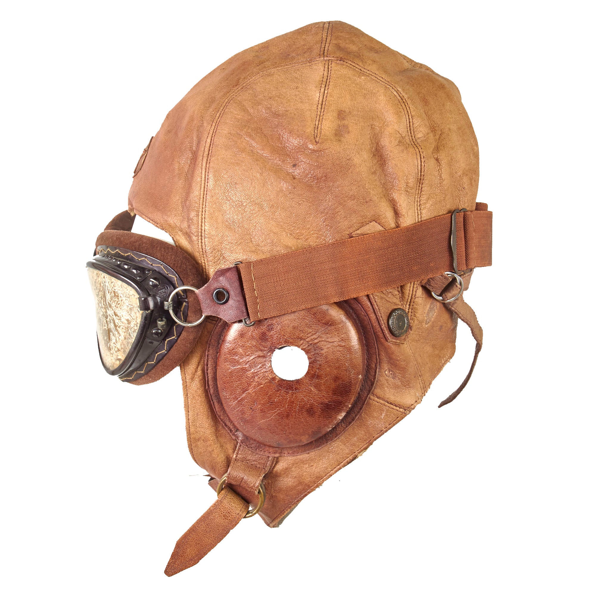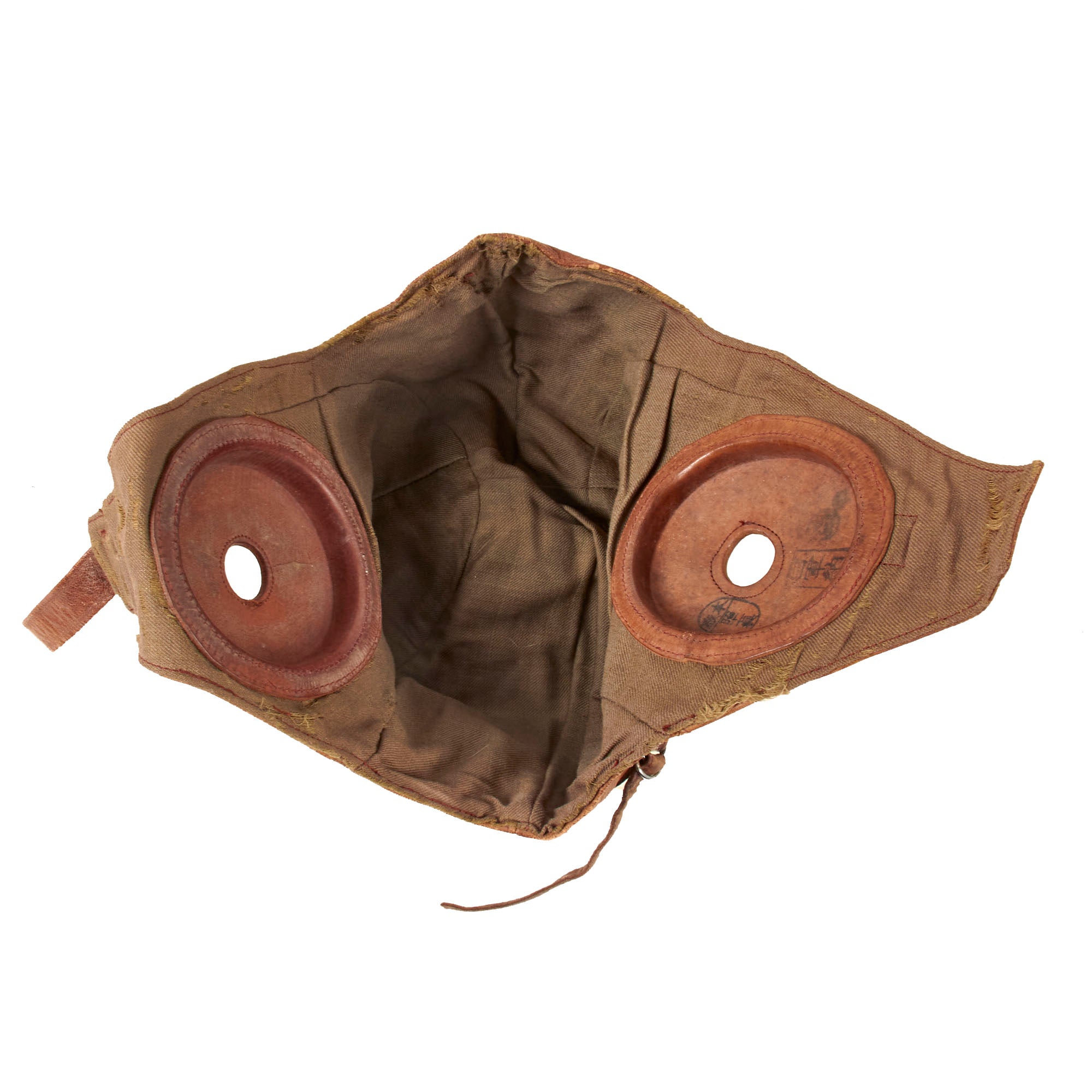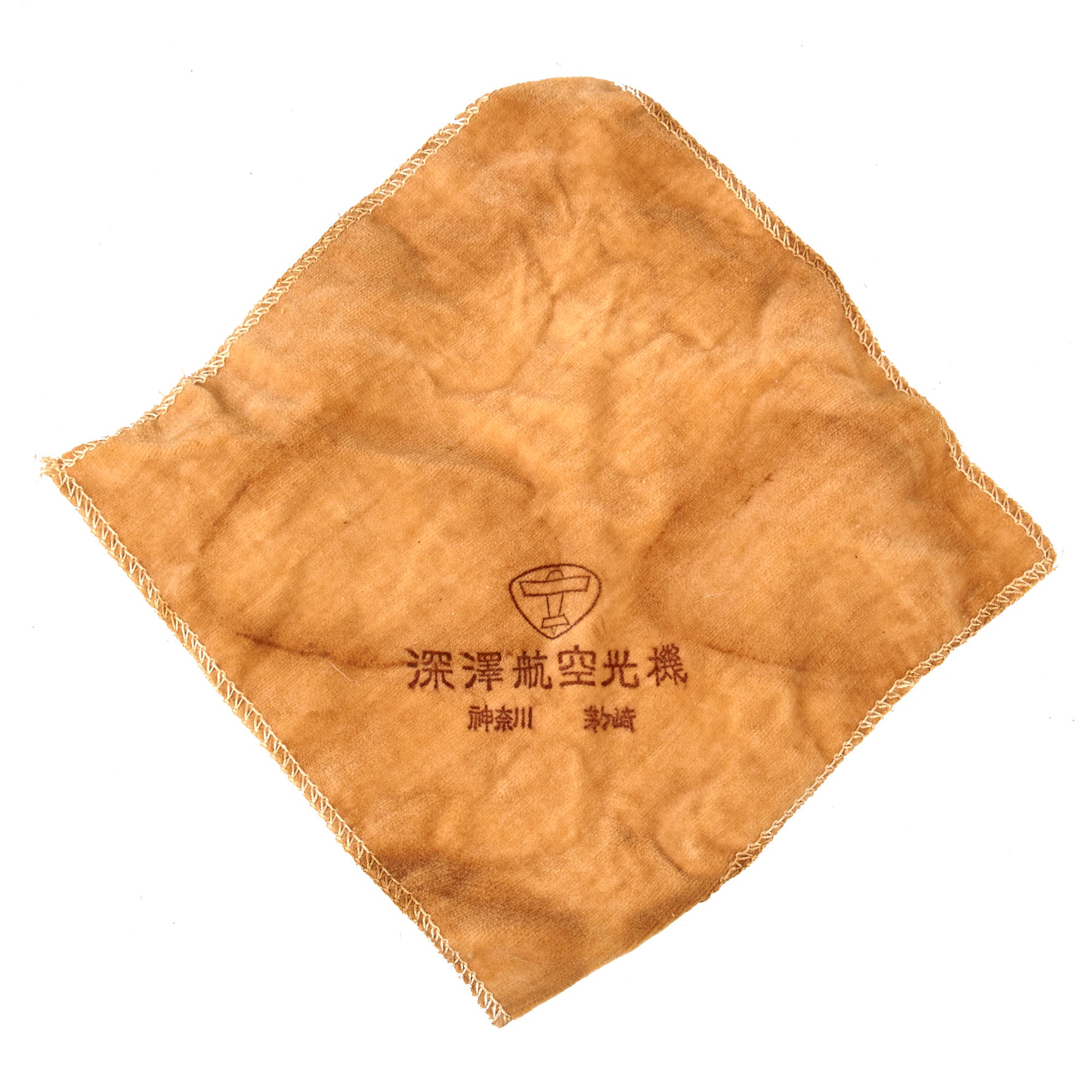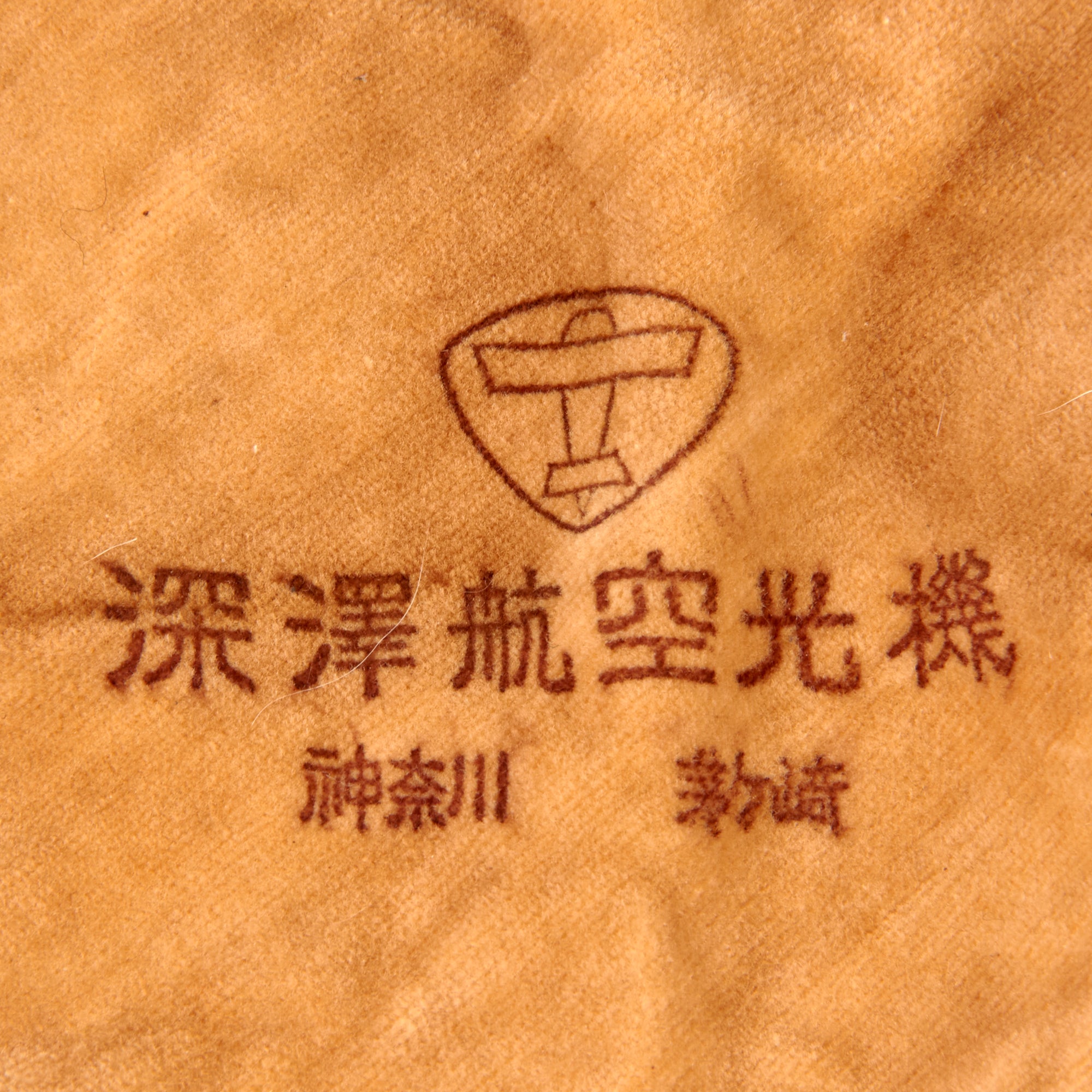 Included with the helmet is a set of original Japanese velvet-lined pilot’s goggles which come in their partial original case with the original velvet rag for cleaning. The case retains the pull string but one end of the case is missing. It comes with a velvet rag marked with an airplane insignia over Fukazawa Aircraft / Kanagawasaki.